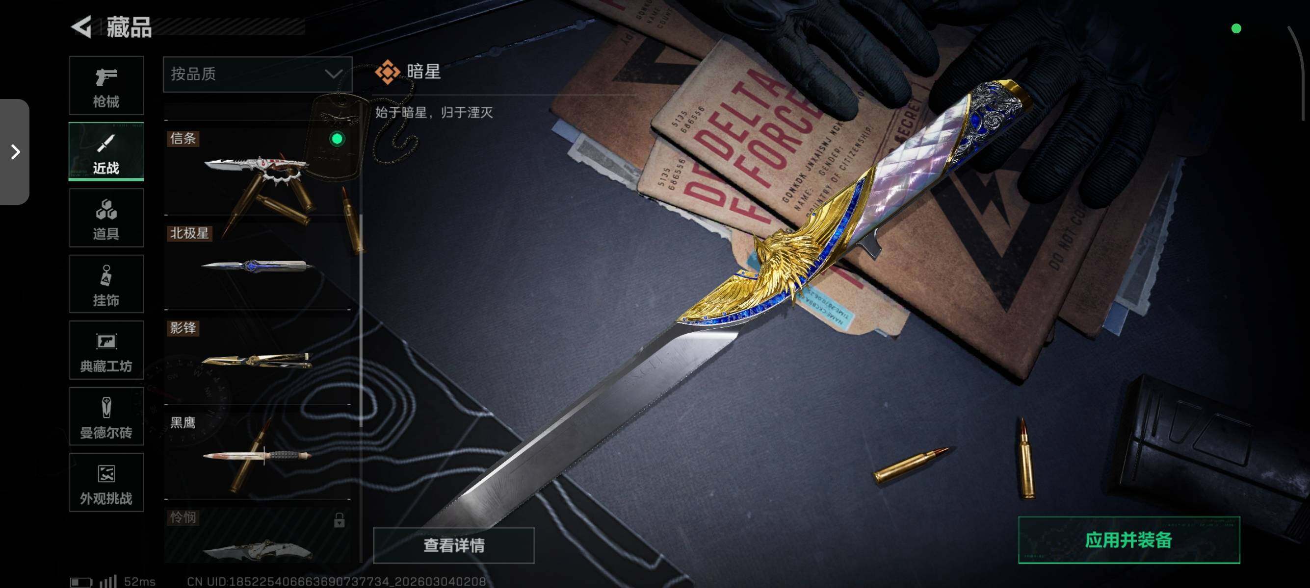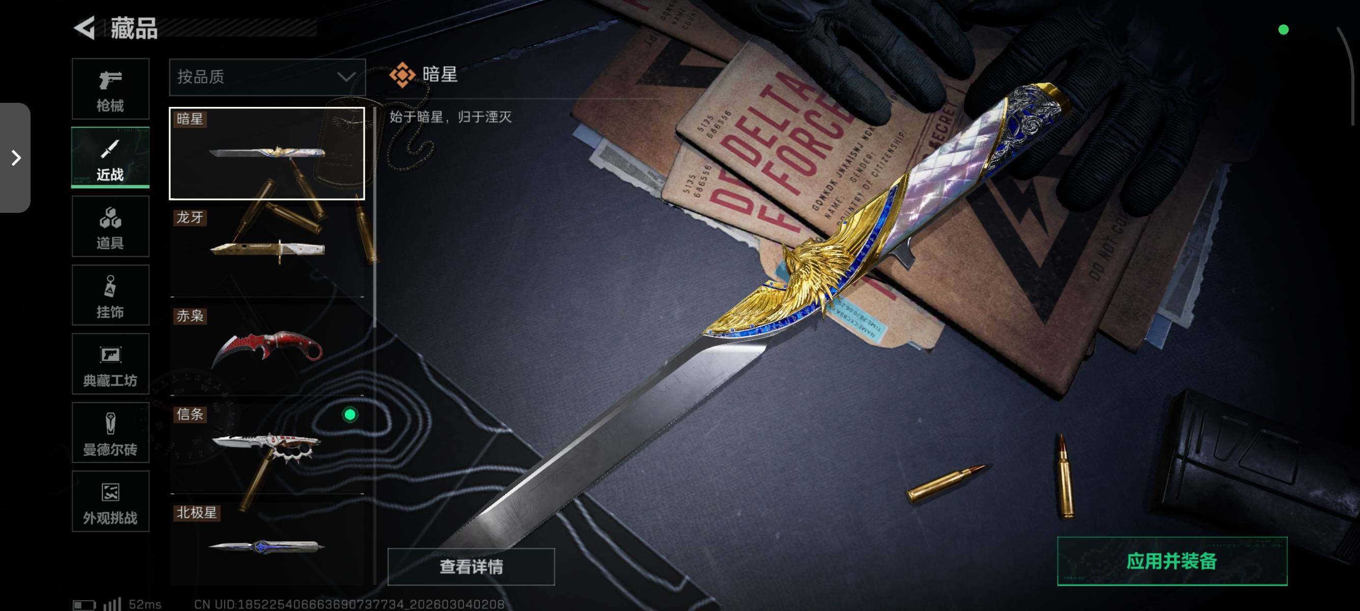 【近战皮肤】:近战-暗星,近战-北极星,近战-信条,近战-影锋,近战-赤枭,近战-龙牙,近战-黑鹰