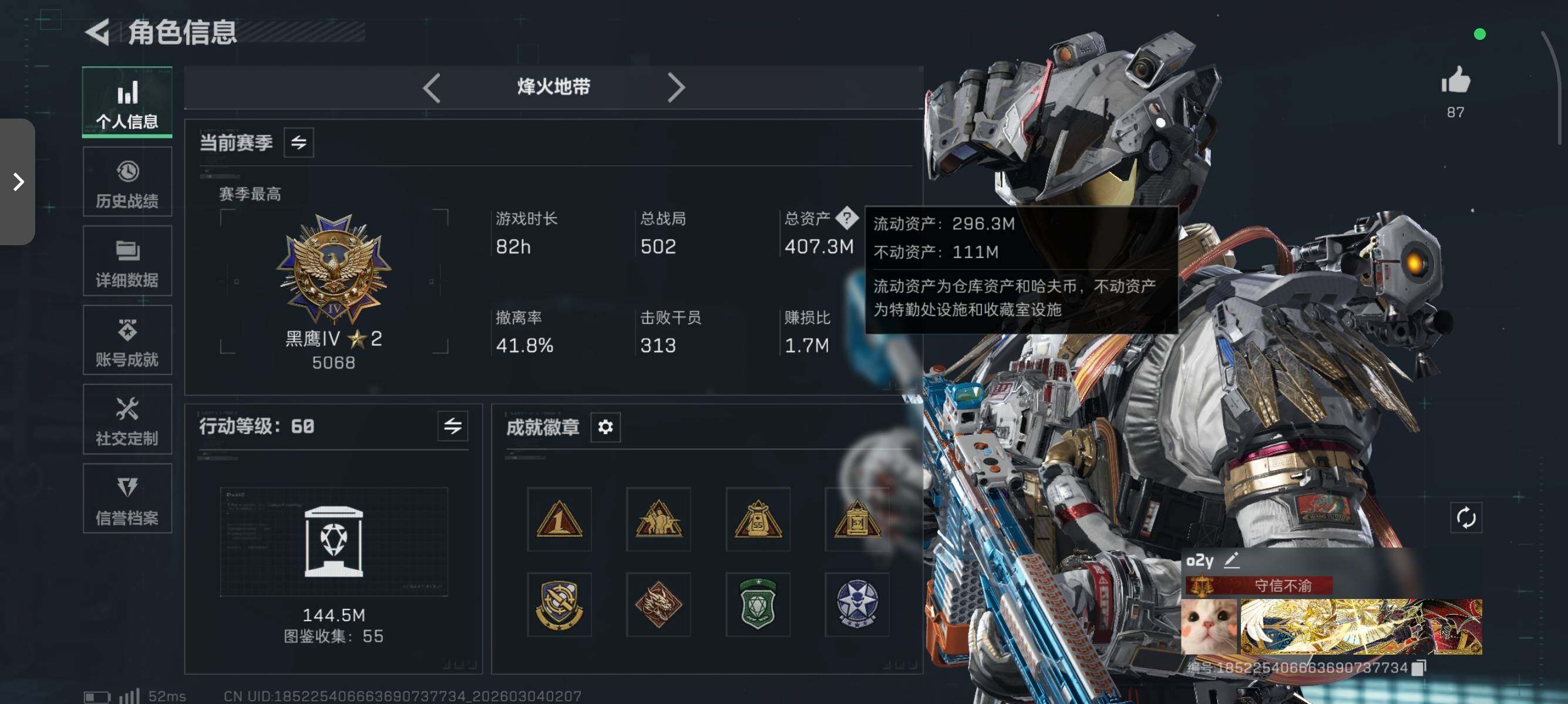 407m总资产-18491k哈伏币-60烽火等级-黑鹰-19战场等级-上等兵