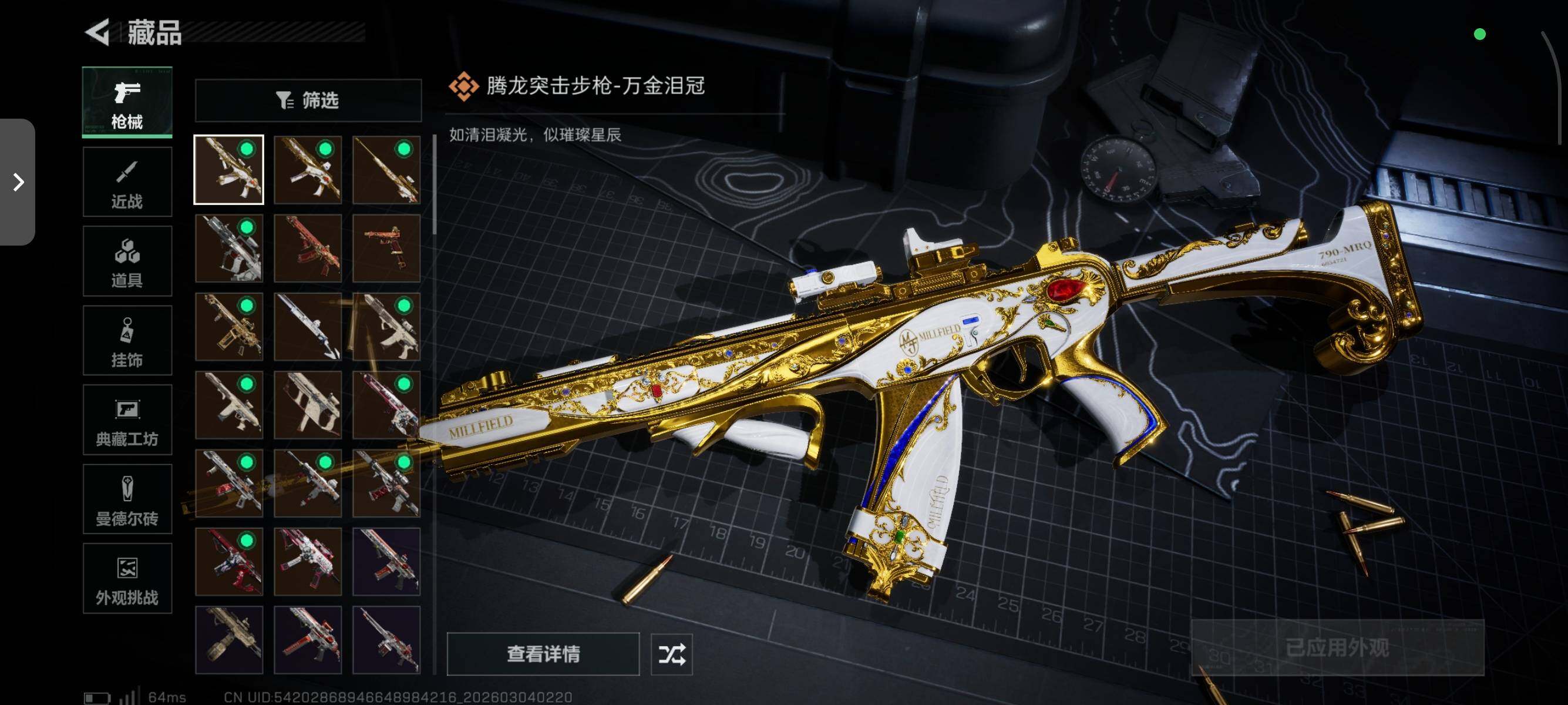 【传说外观】:M4A1突击步枪-阿米娅,QBZ95-1突击步枪-凌霄戍卫,M16A4突击步枪-狩猎时刻,AK-12突击步枪-特斯拉线圈,SCAR-H战斗步枪-启航,G3战斗步枪-狩猎时刻,腾龙突击步枪-马年祥瑞,腾龙突击步枪-万金泪冠,Vector冲锋枪-狩猎时刻,Vector冲锋枪-能天使-午夜邮差,UZI冲锋枪-特斯拉线圈