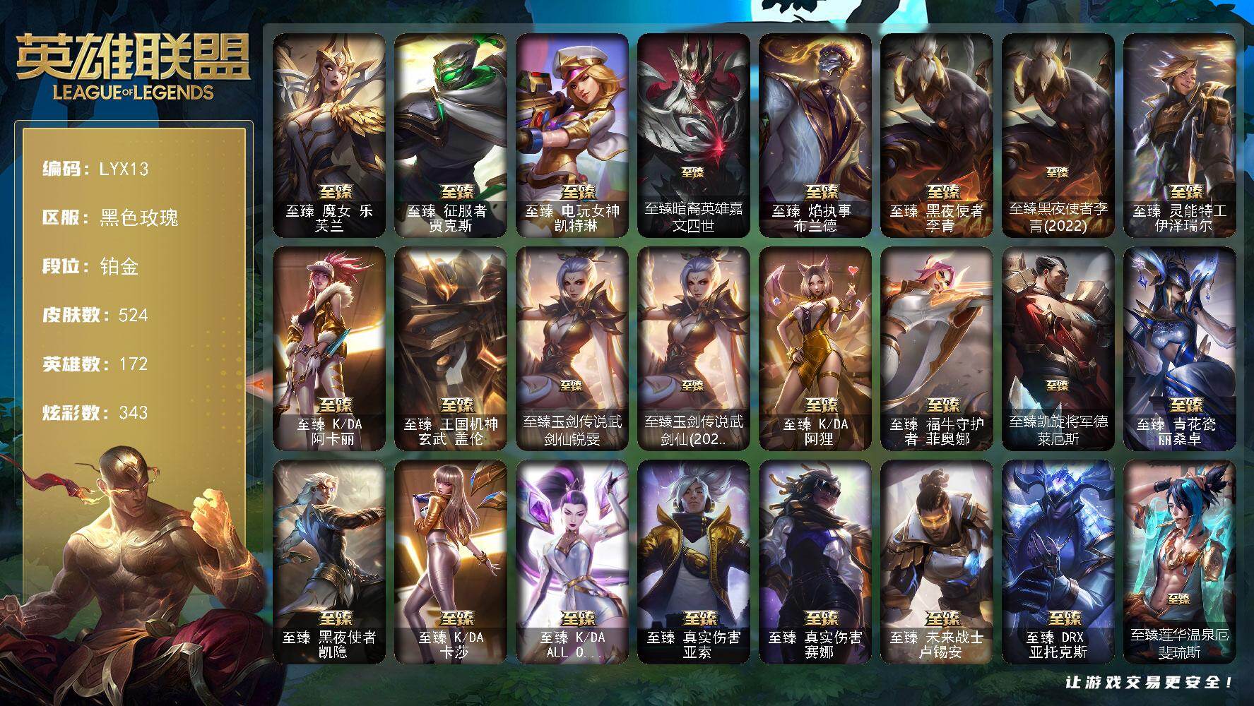 【特价出售/店主推荐】铂金段位-172英雄-524皮肤-343炫彩-3终极-36神话-58限定-55传说-121史诗【热门头像】:爱情之歌头像【至臻皮肤】:至臻魔女乐芙兰,至臻征服者贾克斯,至臻电玩女神凯特琳,至臻暗裔英雄嘉文四世,至臻焰执事布兰德,至臻黑夜使者李青,至臻黑夜使者李青(2022),至臻灵能特工伊泽瑞尔,至臻KDA阿卡丽,至臻王国机神玄武盖伦,至臻玉剑传说武剑仙锐雯,至臻玉剑传说武剑仙(2022),至臻KDA阿狸,至臻福牛守护者菲奥娜,至臻凯旋将军德莱厄斯,至臻青花瓷丽桑卓,至臻黑