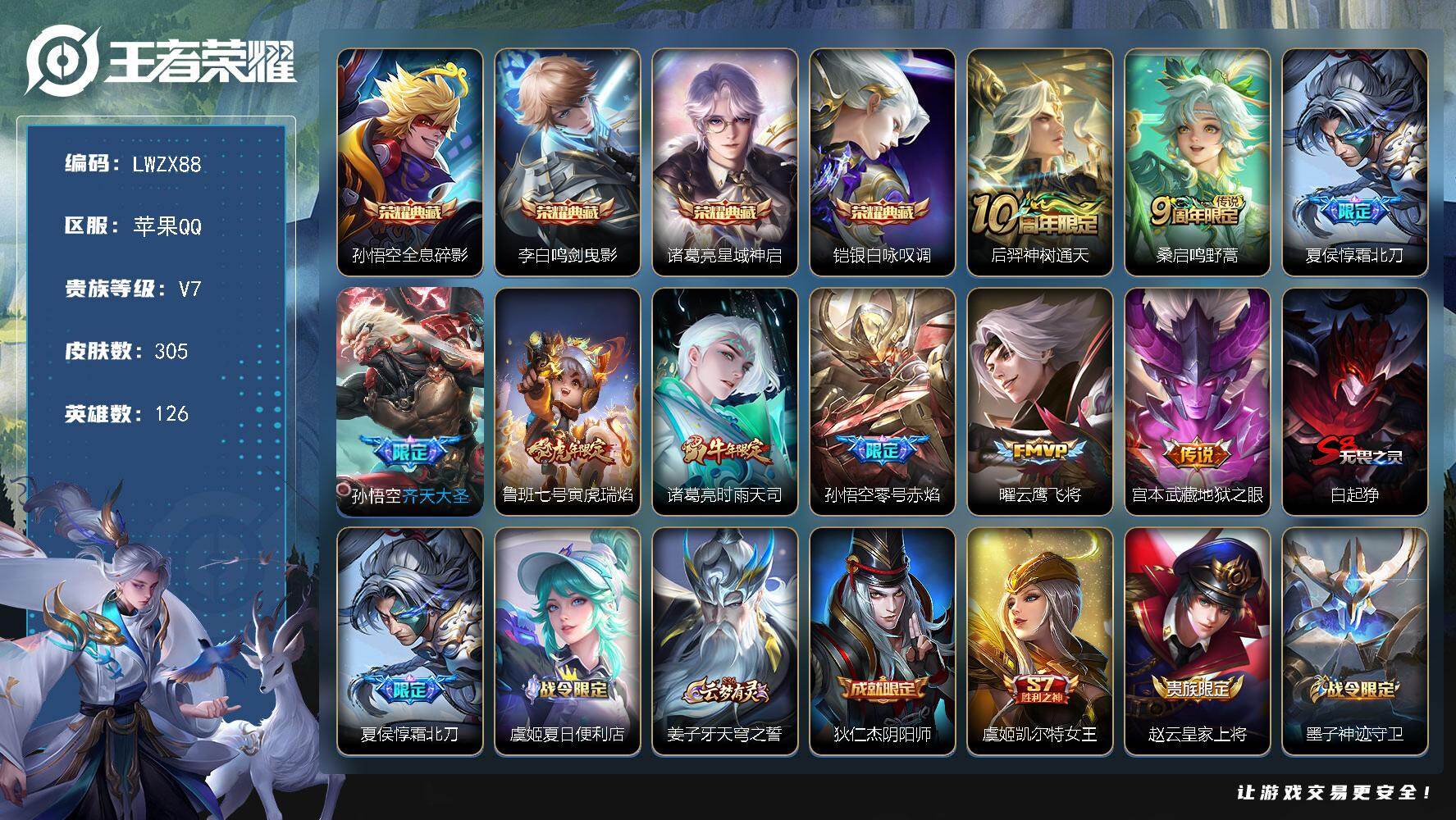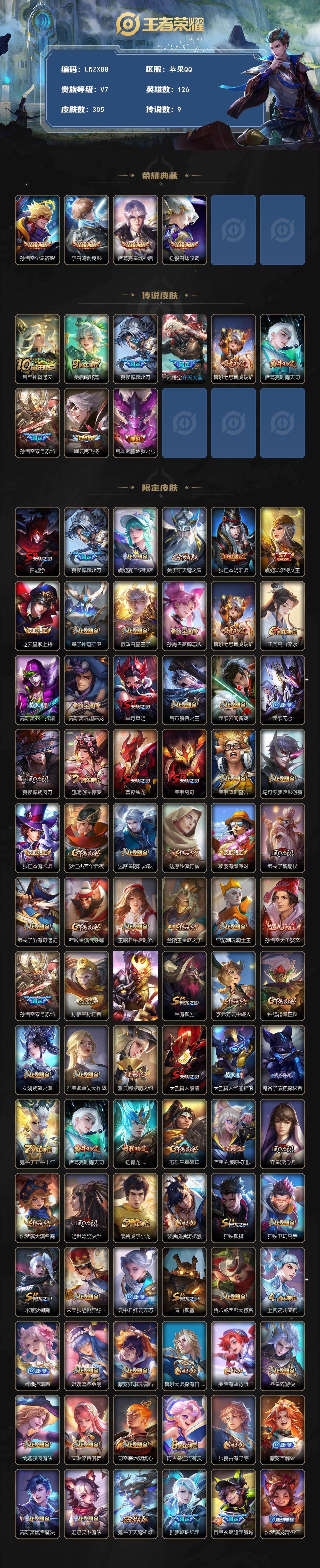 苹果Q-V7-最强王者段位-126英雄-305皮肤-4典藏皮
