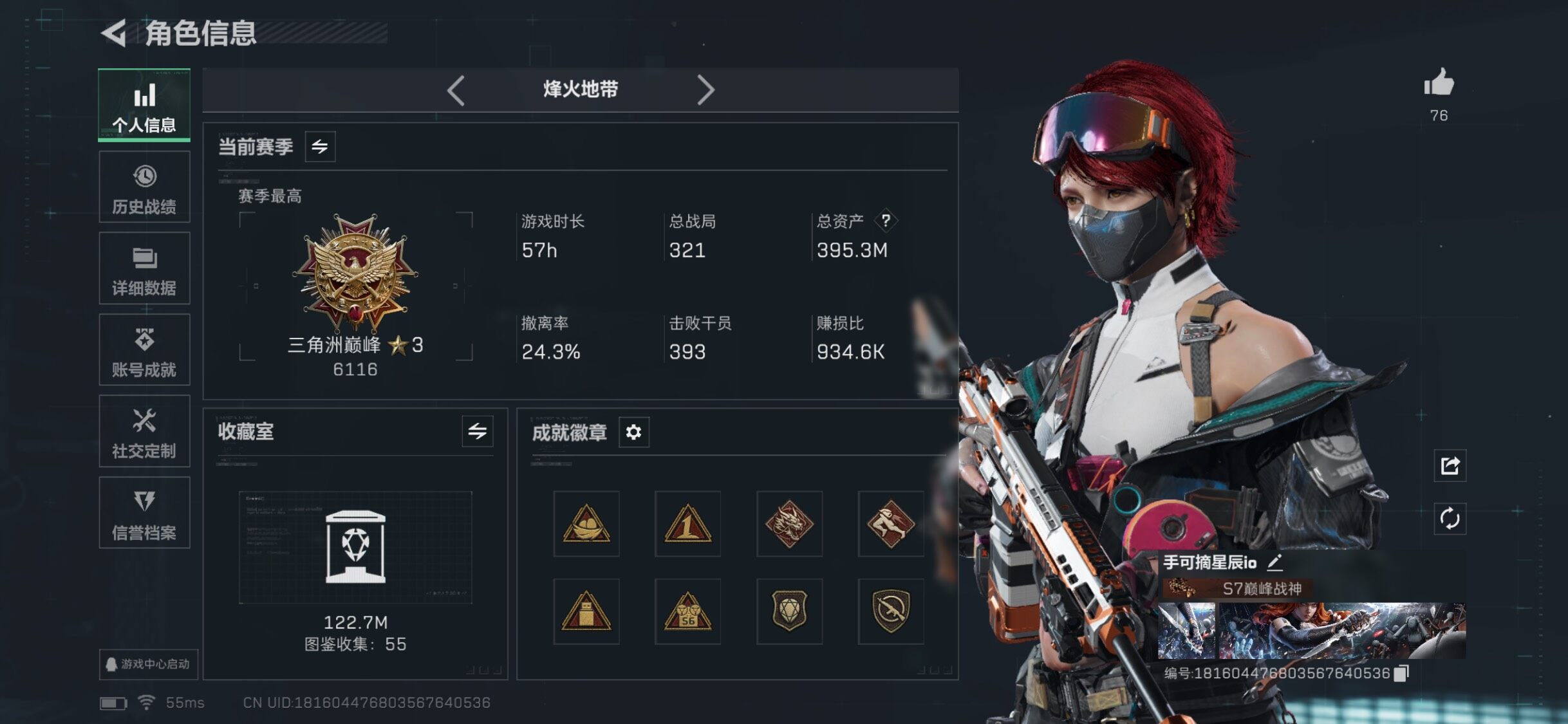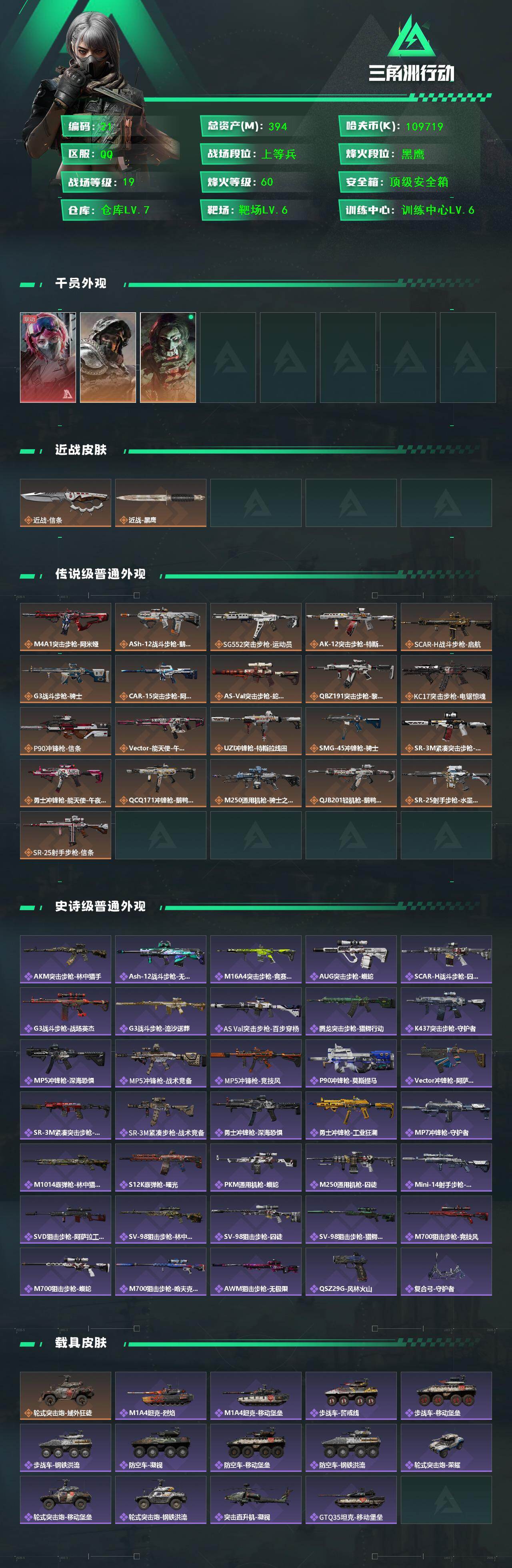 109719k哈伏币-信条 保险箱3x3 通行证 三角劵910-395m流动资产-60烽火等级-黑鹰-19战场等级-上等兵【干员外观】:蛊-能天使午夜邮差,深蓝-不破誓约,红狼-电锯惊魂【近战皮肤】:近战-信条,近战-黑鹰【传说外观】:M4A1突击步枪-阿米娅,ASh-12战斗步枪-鹅鸭杀,SG552突击步枪-运动员,AK-12突击步枪-特斯拉线圈,SCAR-H战斗步枪-启航,G3战斗步枪-骑士,CAR-15突击步枪-阿米娅,AS Val突击步枪-蛇年祥瑞,腾龙突击步枪-黎明警戒,KC17突击步