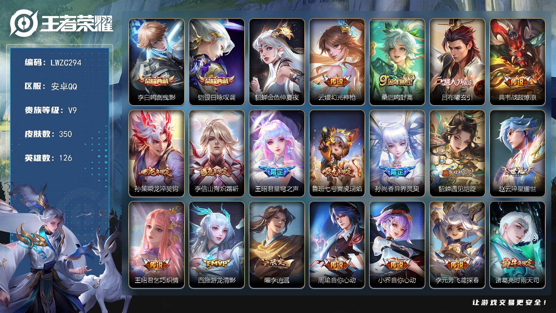 【特价出售/店主推荐】安卓Q-V9-最强王者段位-126英雄-350皮肤-2典藏皮肤-1星传说-32传说-107史诗【英雄全皮】:孙权全皮,钟馗全皮,李信全皮,猪八戒全皮,鲁班大师全皮【荣耀典藏】:李白鸣剑曳影,铠银白咏叹调【传说皮肤】:云缨幻光神枪,桑启鸣野蒿,吕布曦玄引,典韦战鼓燎原,孙策乘龙淬吴钩,李信山海炽霜斩,王昭君星穹之声,鲁班七号寅虎瑞焰,孙尚香异界灵契,貂蝉遇见胡旋,赵云淬星耀世,王昭君乞巧织情,西施游龙清影,曜李逍遥 ,周瑜音你心动,小乔音你心动,李元芳飞鸢探春,诸葛亮时雨天司