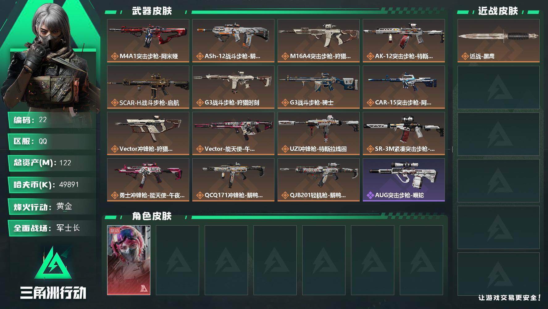 122m总资产-49891k哈伏币-60烽火等级-黄金-50战场等级-军士长【干员外观】:蛊-能天使午夜邮差【近战皮肤】:近战-黑鹰【传说外观】:M4A1突击步枪-阿米娅,ASh-12战斗步枪-鹅鸭杀,M16A4突击步枪-狩猎时刻,AK-12突击步枪-特斯拉线圈,SCAR-H战斗步枪-启航,G3战斗步枪-狩猎时刻,G3战斗步枪-骑士,CAR-15突击步枪-阿米娅,Vector冲锋枪-狩猎时刻,Vector冲锋枪-能天使-午夜邮差,UZI冲锋枪-特斯拉线圈,SR-3M紧凑突击步枪-特斯拉线圈,勇士