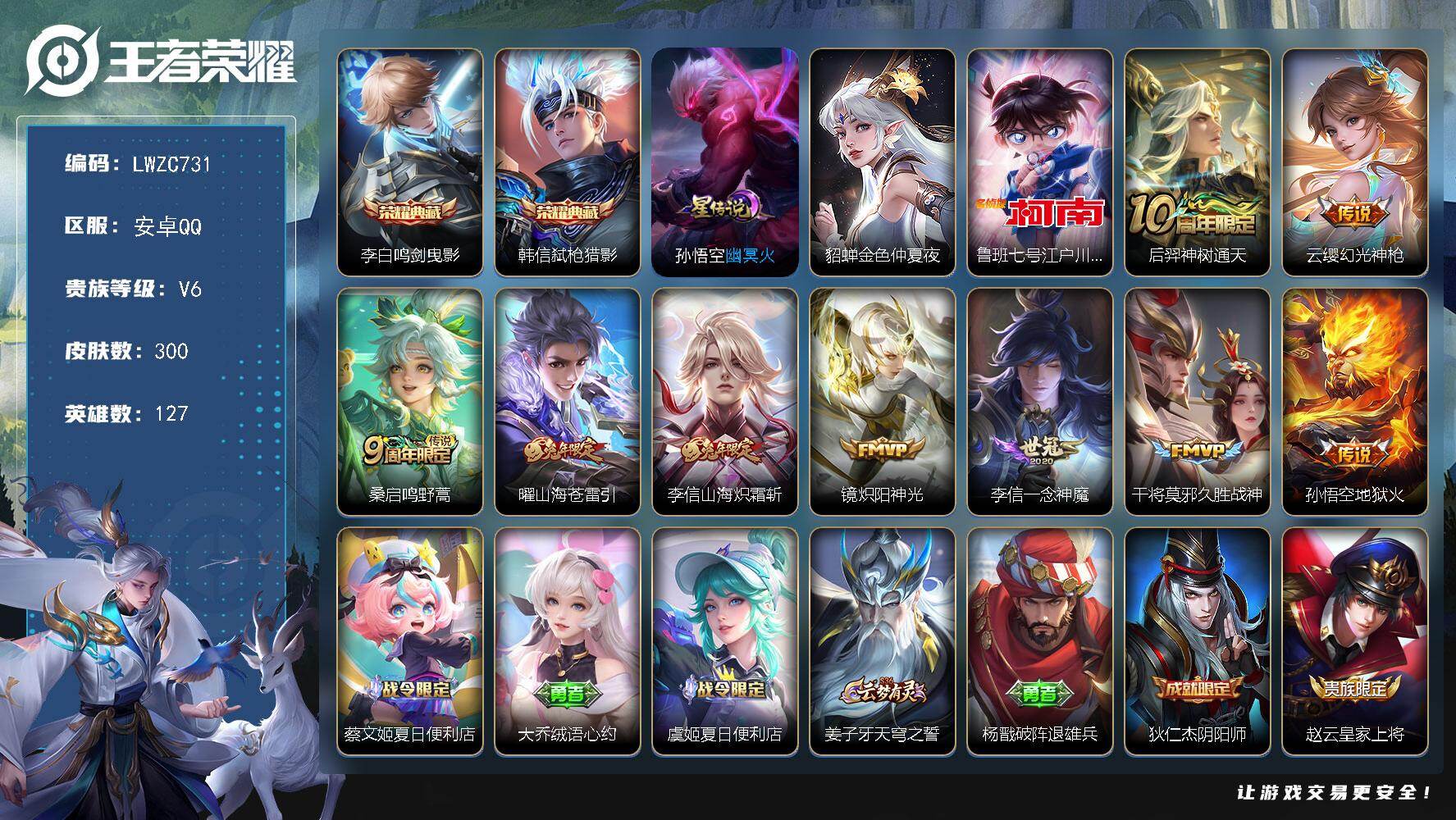 【特价急出/详情看图】安卓Q-V6-尊贵铂金I段位-127英雄-300皮肤-2典藏皮肤-1珍品传说-2星元-9传说-83史诗【英雄全皮】:李信全皮,影全皮【荣耀典藏】:李白鸣剑曳影,韩信弑枪猎影【珍品传说】:鲁班七号江户川柯南【传说皮肤】:后羿神树通天,云缨幻光神枪,桑启鸣野蒿,曜山海苍雷引,李信山海炽霜斩,镜炽阳神光,李信一念神魔,干将莫邪久胜战神,孙悟空地狱火【限定皮肤】:蔡文姬夏日便利店,大乔绒语心约,虞姬夏日便利店,姜子牙天穹之誓,杨戬破阵退雄兵,狄仁杰阴阳师,赵云皇家上将,嬴政优雅恋人