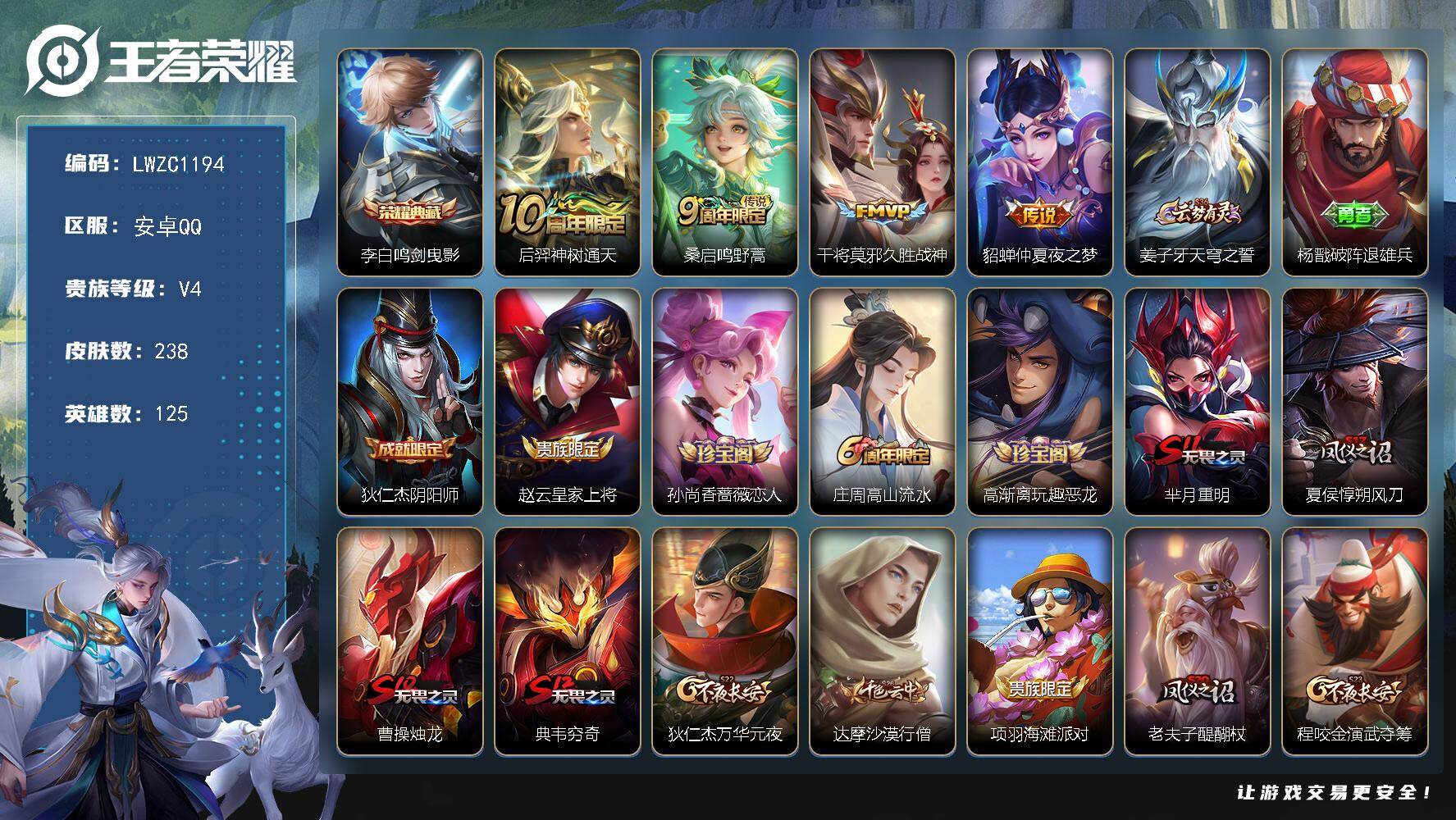 【特价急出/详情看图】安卓Q-V4-最强王者段位-125英雄-238皮肤-1典藏皮肤-1星元-4传说-59史诗【英雄全皮】:孙权全皮,影全皮【荣耀典藏】:李白鸣剑曳影【传说皮肤】:后羿神树通天,桑启鸣野蒿,干将莫邪久胜战神,貂蝉仲夏夜之梦【限定皮肤】:姜子牙天穹之誓,杨戬破阵退雄兵,狄仁杰阴阳师,赵云皇家上将,孙尚香蔷薇恋人,庄周高山流水,高渐离玩趣恶龙,芈月重明,夏侯惇朔风刀,曹操烛龙,典韦穷奇,狄仁杰万华元夜,达摩沙漠行僧,项羽海滩派对,老夫子醍醐杖,程咬金演武夺筹,兰陵王金庭之子,孙悟空孙