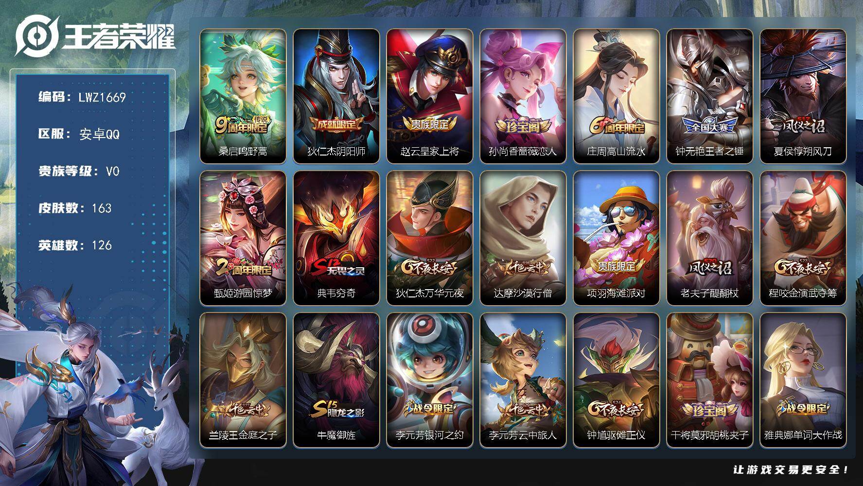 【特价出售/店主推荐】 安卓Q-V0-尊贵铂金I段位-126英雄-163皮肤-1传说-31史诗【传说皮肤】:桑启鸣野蒿【限定皮肤】:狄仁杰阴阳师,赵云皇家上将,孙尚香蔷薇恋人,庄周高山流水,钟无艳王者之锤,夏侯惇朔风刀,甄姬游园惊梦,典韦穷奇,狄仁杰万华元夜,达摩沙漠行僧,项羽海滩派对,老夫子醍醐杖,程咬金演武夺筹,兰陵王金庭之子,牛魔御旌,李元芳银河之约,李元芳云中旅人,钟馗驱傩正仪,干将莫邪胡桃夹子,雅典娜单词大作战,蔡文姬繁星吟游,鬼谷子原初探秘者,鬼谷子五谷丰年,苏烈千军破阵,弈星混沌棋