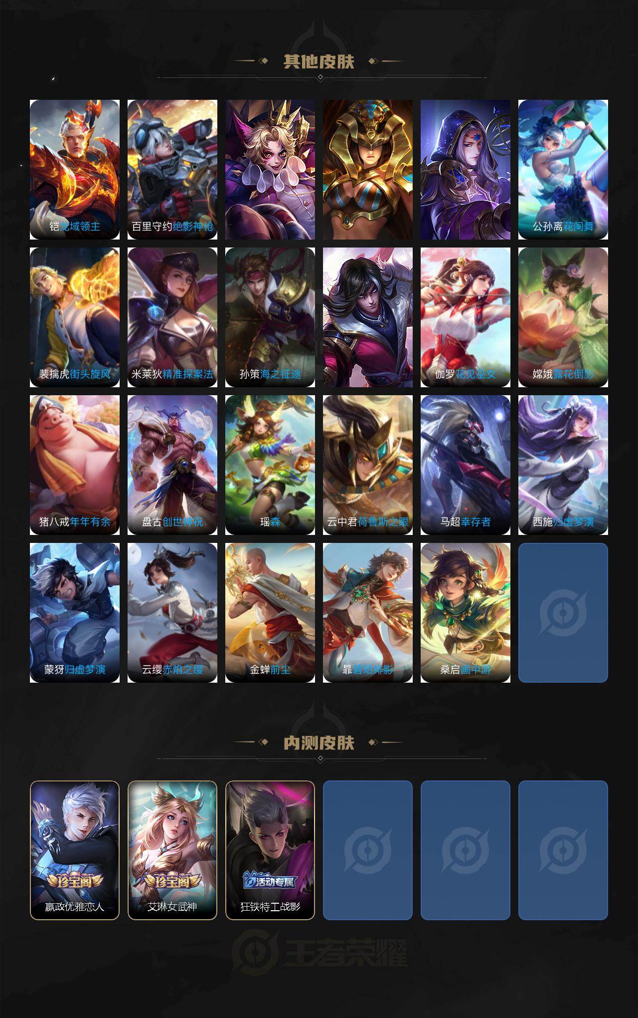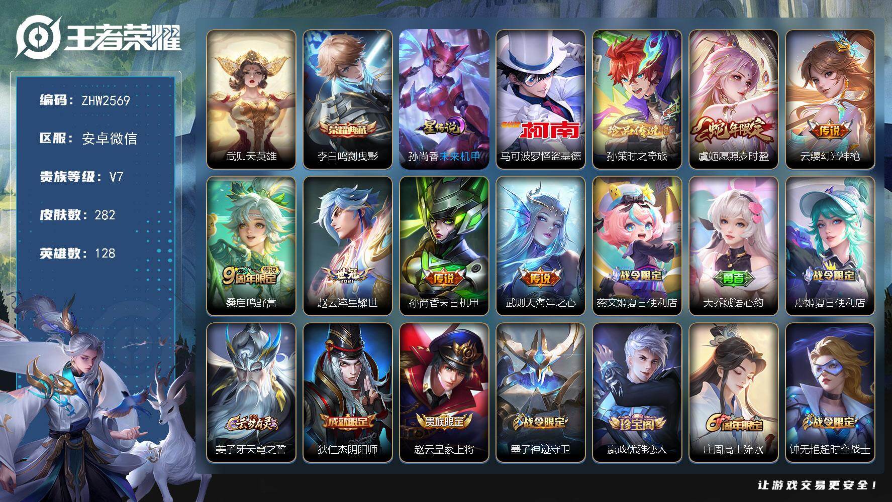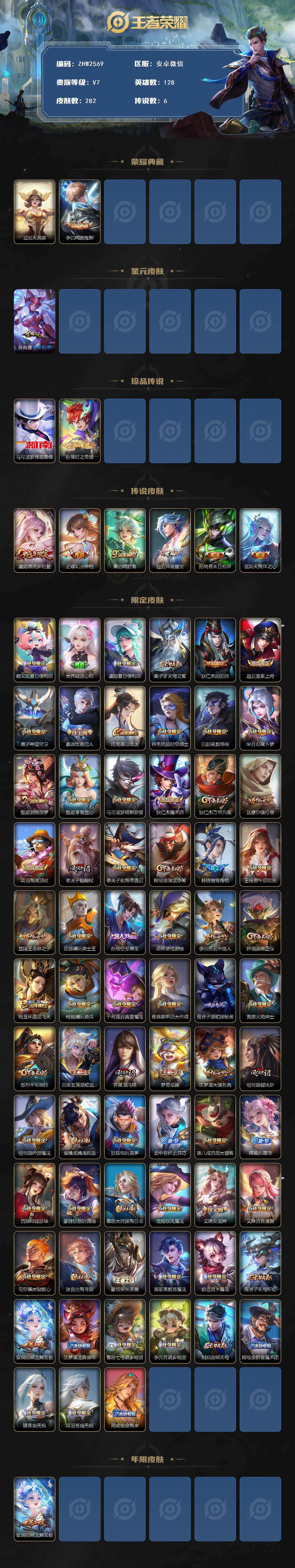 安卓WX-V7-最强王者段位-128英雄-282皮肤-1典藏皮肤-1典藏英雄-2珍品传说-6传说-76史诗-1星传说【英雄全皮】:戈娅全皮,影全皮【荣耀典藏】:武则天英雄,李白鸣剑曳影【珍品传说】:马可波罗怪盗基德,孙策时之奇旅【传说皮肤】:虞姬愿照岁时盈,云缨幻光神枪,桑启鸣野蒿,赵云淬星耀世,孙尚香末日机甲,武则天海洋之心【限定皮肤】:蔡文姬夏日便利店,大乔绒语心约,虞姬夏日便利店,姜子牙天穹之誓,狄仁杰阴阳师,赵云皇家上将,墨子神迹守卫,嬴政优雅恋人,庄周高山流水,钟无艳超时空战士,白起夜