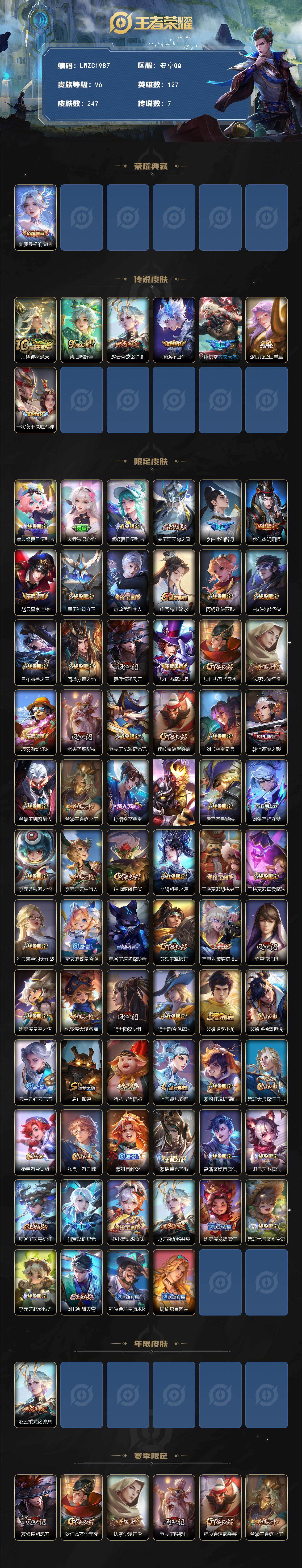 【特价出售/店主推荐】安卓Q-V6-最强王者段位-127英雄-247皮肤-1典藏皮肤-7传说-63史诗【英雄全皮】:孙权全皮【荣耀典藏】:伽罗最初的交响【传说皮肤】:后羿神树通天,桑启鸣野蒿,赵云乘龙铭钟鼎,澜逐花归海,孙悟空齐天大圣,张良黄金白羊座,干将莫邪久胜战神【限定皮肤】:蔡文姬夏日便利店,大乔绒语心约,虞姬夏日便利店,姜子牙天穹之誓,李白谪仙醉月,狄仁杰阴阳师,赵云皇家上将,墨子神迹守卫,嬴政优雅恋人,庄周高山流水,阿轲迷踪丽影,白起夜都怪侠,吕布猎兽之王,周瑜赤莲之焰,夏侯惇朔风刀,