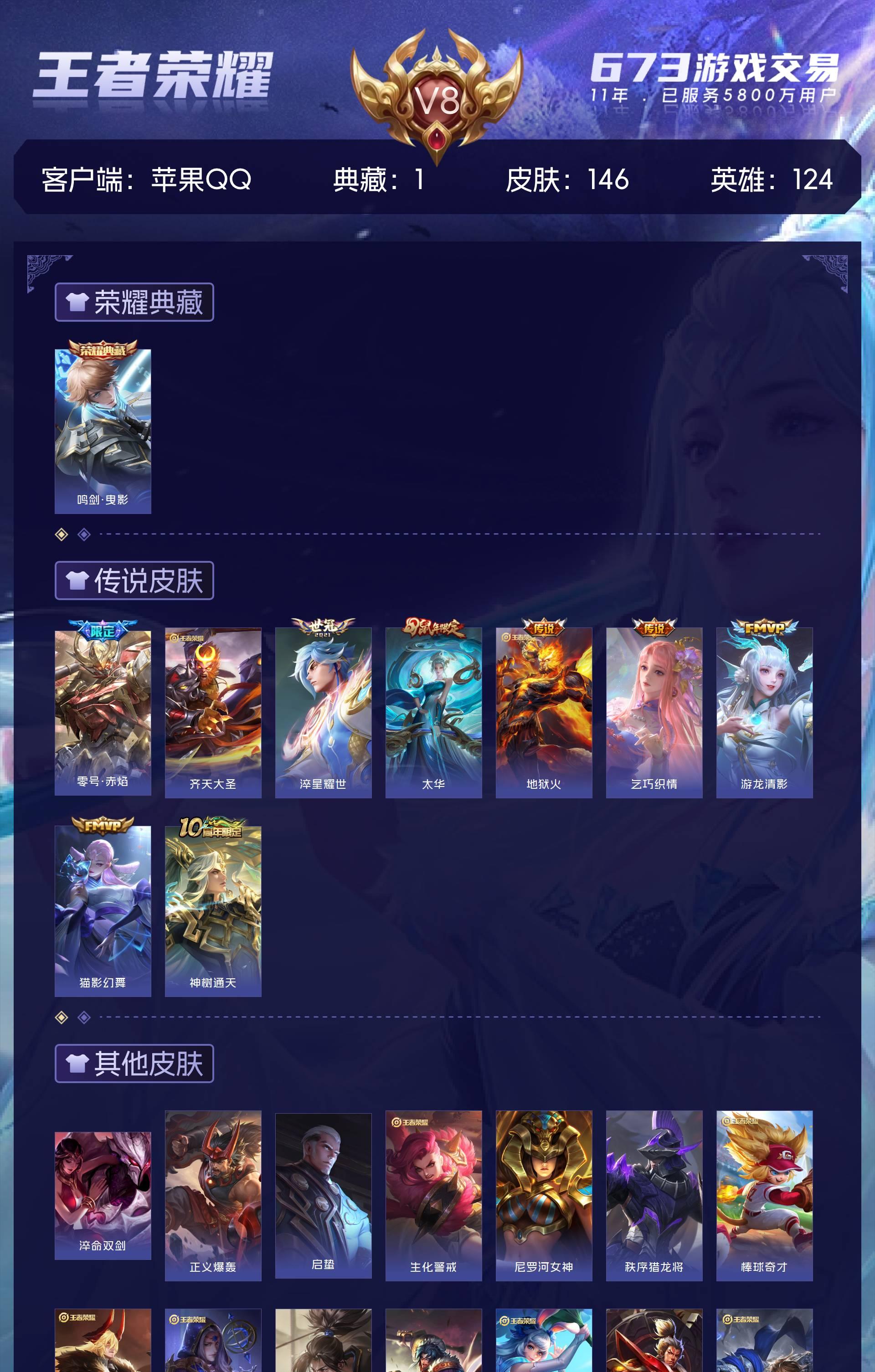 V8 皮肤146 英雄124 尊贵铂金 荣耀典藏1 传说10 其他皮肤142