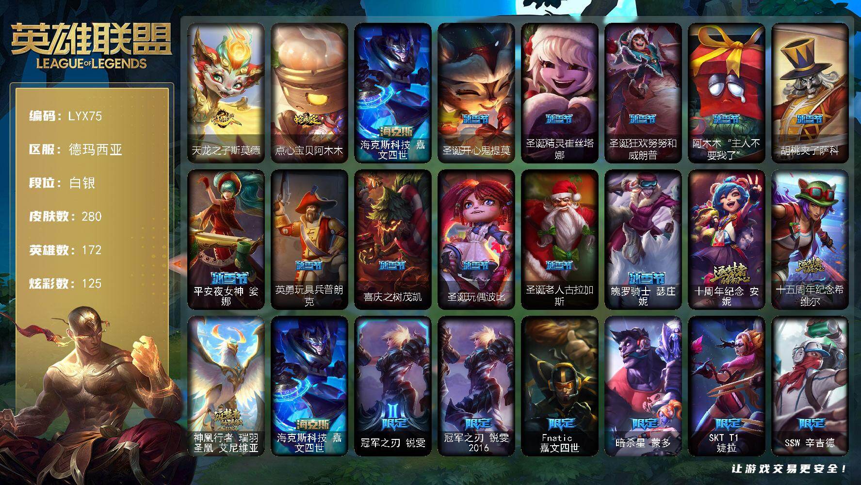 可二次【特价出售/店主推荐】白银段位-172英雄-280皮肤-125炫彩-0终极-4神话-45限定-26传说-64史诗【珍稀头像】:红包头像【热门头像】:觅心游侠卢锡安头像【臻彩皮肤】:无畏骑士瑟庄妮赤子初心,霸天战士雷恩加尔星啸天火,泳池派对菲奥娜清凉苹果冰,星之守护者萨勒芬妮未来之光,霸天异形卡兹克刹那银光,星之守护者霞烈羽,灵魂莲华亚索霜见之时,可爱可爱粉红红布里茨,魔女阿卡丽虚荣,净雪之月莫甘娜冬虹【年限皮肤】:天龙之子斯莫德,点心宝贝阿木木【海克斯皮肤】:海克斯科技嘉文四世【冰雪限定】