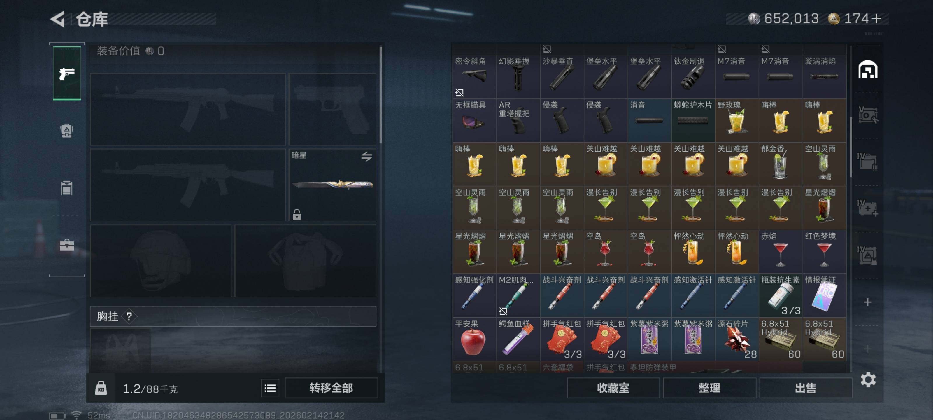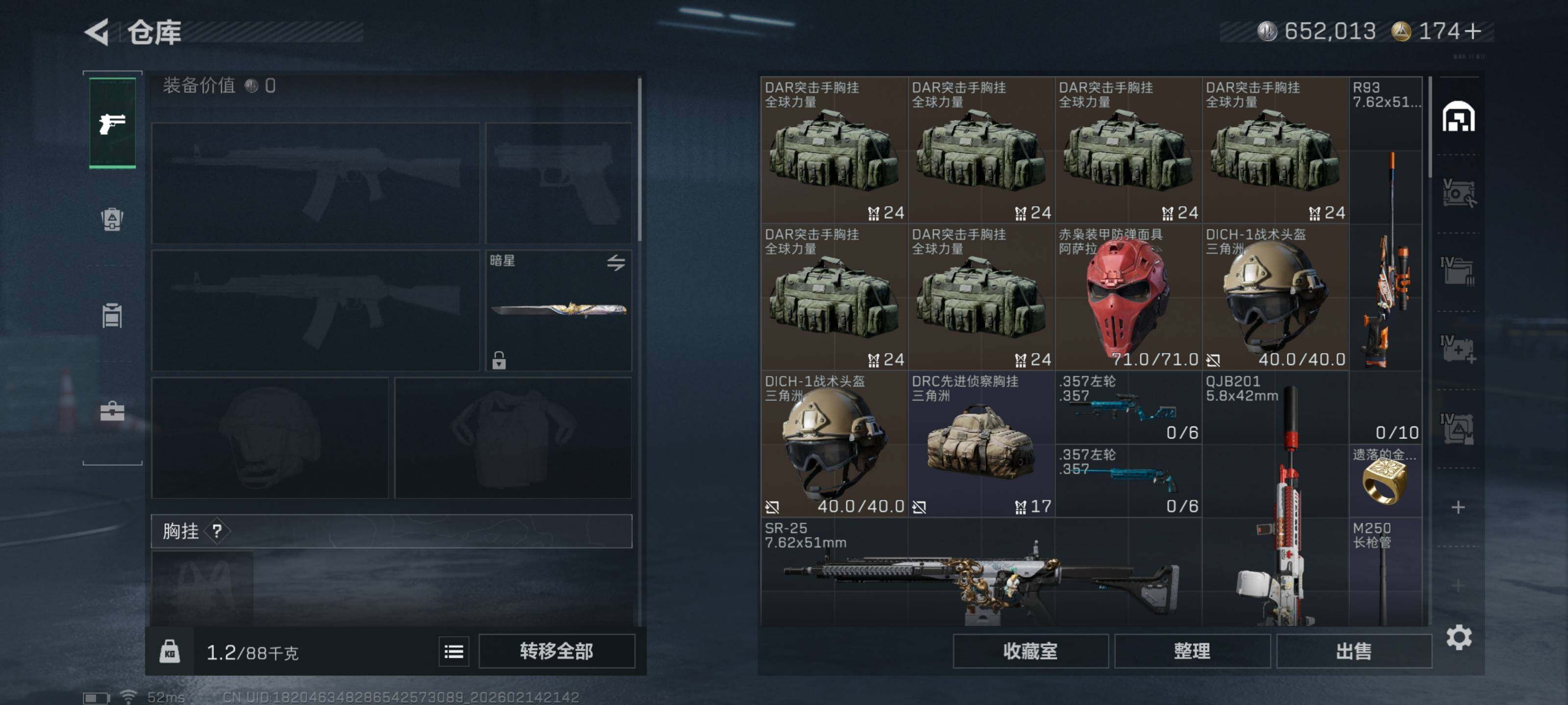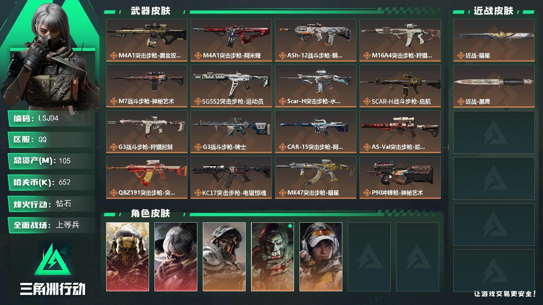 【特价出售/店主推荐】105m总资产-652k哈伏币-60烽火等级-钻石-50战场等级-上等兵【干员外观】:红狼-蚀金玫瑰,骇爪-水墨云图,深蓝-不破誓约,红狼-电锯惊魂,露娜-金牌射手【近战皮肤】:近战-暗星,近战-黑鹰【传说外观】:M4A1突击步枪-蚀金玫瑰,M4A1突击步枪-阿米娅,ASh-12战斗步枪-鹅鸭杀,M16A4突击步枪-狩猎时刻,M7战斗步枪-神秘艺术,SG552突击步枪-运动员,SCAR-H战斗步枪-水墨云图,SCAR-H战斗步枪-启航,G3战斗步枪-狩猎时刻,G3战斗步枪-