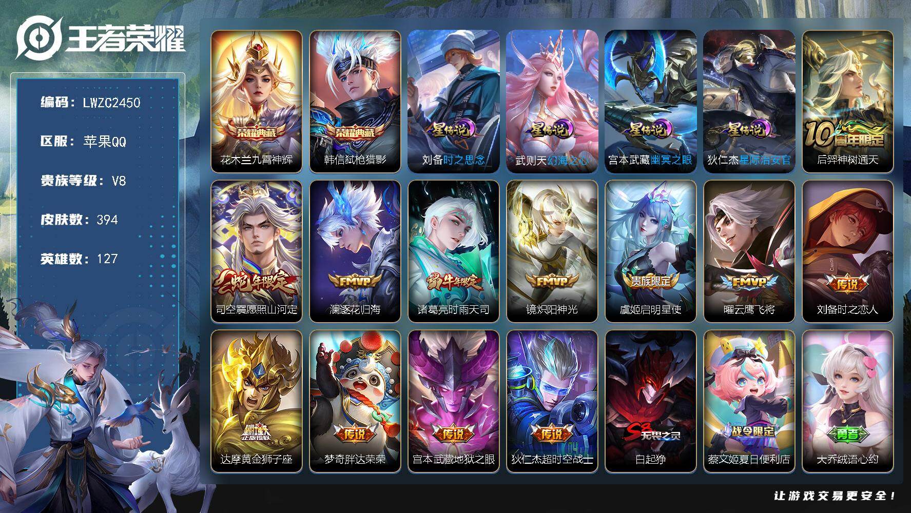 【店主推荐捡漏号!可直接换绑】qq钱包无法注销苹果Q-V8-至尊星耀IV段位34段对抗路30段发育路-127英雄-394皮肤-2典藏皮肤-12传说-112史诗-4星元【英雄全皮】:达摩全皮,孙权全皮,钟馗全皮,鬼谷子全皮,狂铁全皮,司空震全皮,莱西奥全皮,戈娅全皮,空空儿全皮,影全皮【荣耀典藏】:花木兰九霄神辉,韩信弑枪猎影【传说皮肤】:后羿神树通天,司空震愿照山河定,澜逐花归海,诸葛亮时雨天司,镜炽阳神光,虞姬启明星使,曜云鹰飞将,刘备时之恋人,达摩黄金狮子座,梦奇胖达荣荣,宫本武藏地狱之眼,