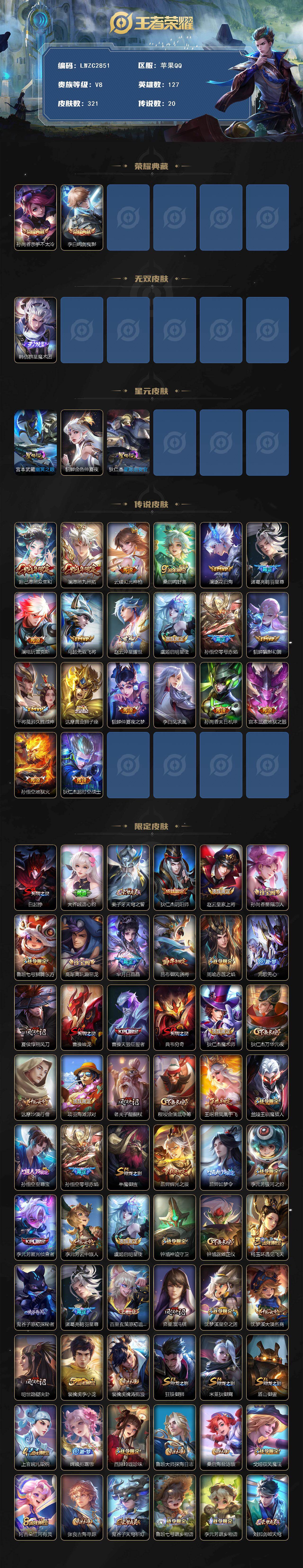 【店主推荐捡漏号!可直接换绑】苹果Q-V8-至尊星耀V段位-127英雄-321皮肤-2典藏皮肤-1无双-20传说-73史诗-3星元【英雄全皮】:澜全皮,戈娅全皮,空空儿全皮【荣耀典藏】:孙尚香杀手不太冷,李白鸣剑曳影【无双皮肤】:韩信群星魔术团【传说皮肤】:妲己愿照众生和,澜愿照九州拓,云缨幻光神枪,桑启鸣野蒿,澜逐花归海,诸葛亮鹤羽星尊,澜电玩雷克斯,马超无双飞将,赵云淬星耀世,虞姬启明星使,孙悟空零号赤焰,貂蝉猫影幻舞,干将莫邪久胜战神,达摩黄金狮子座,貂蝉仲夏夜之梦,李白凤求凰,孙尚香末日