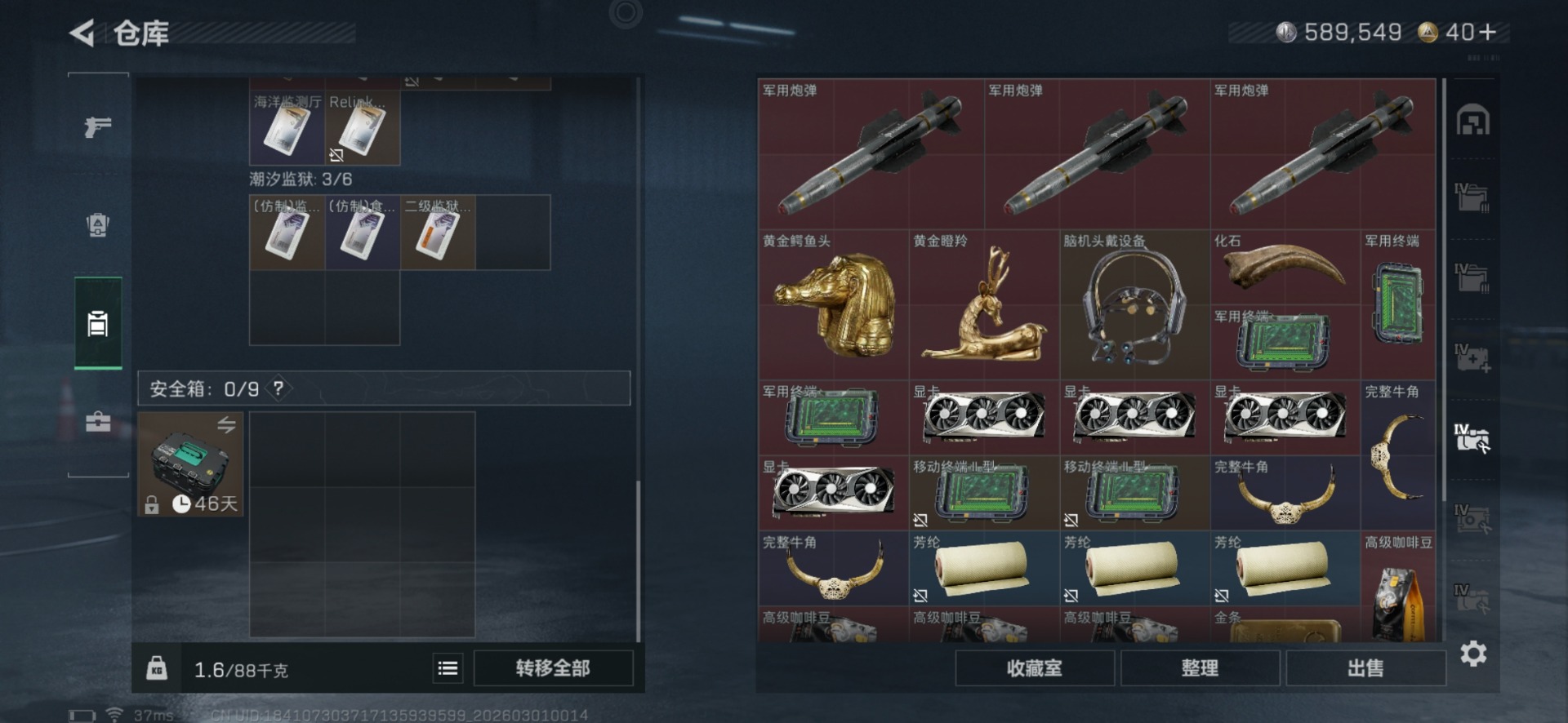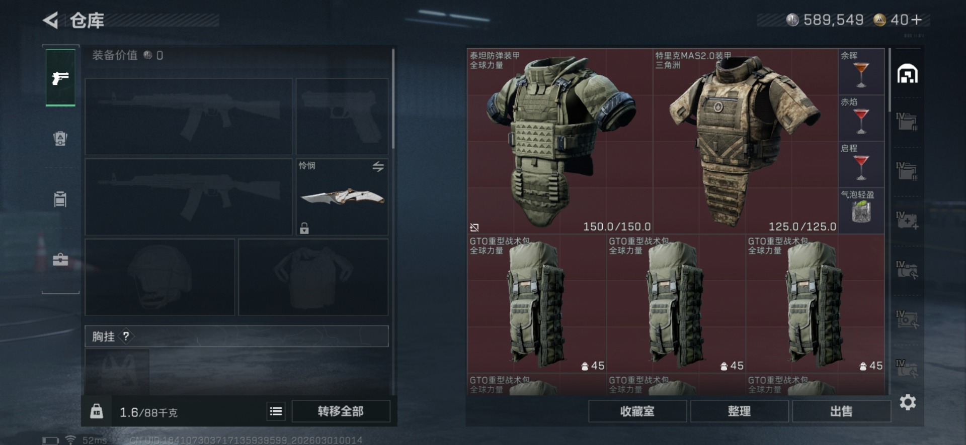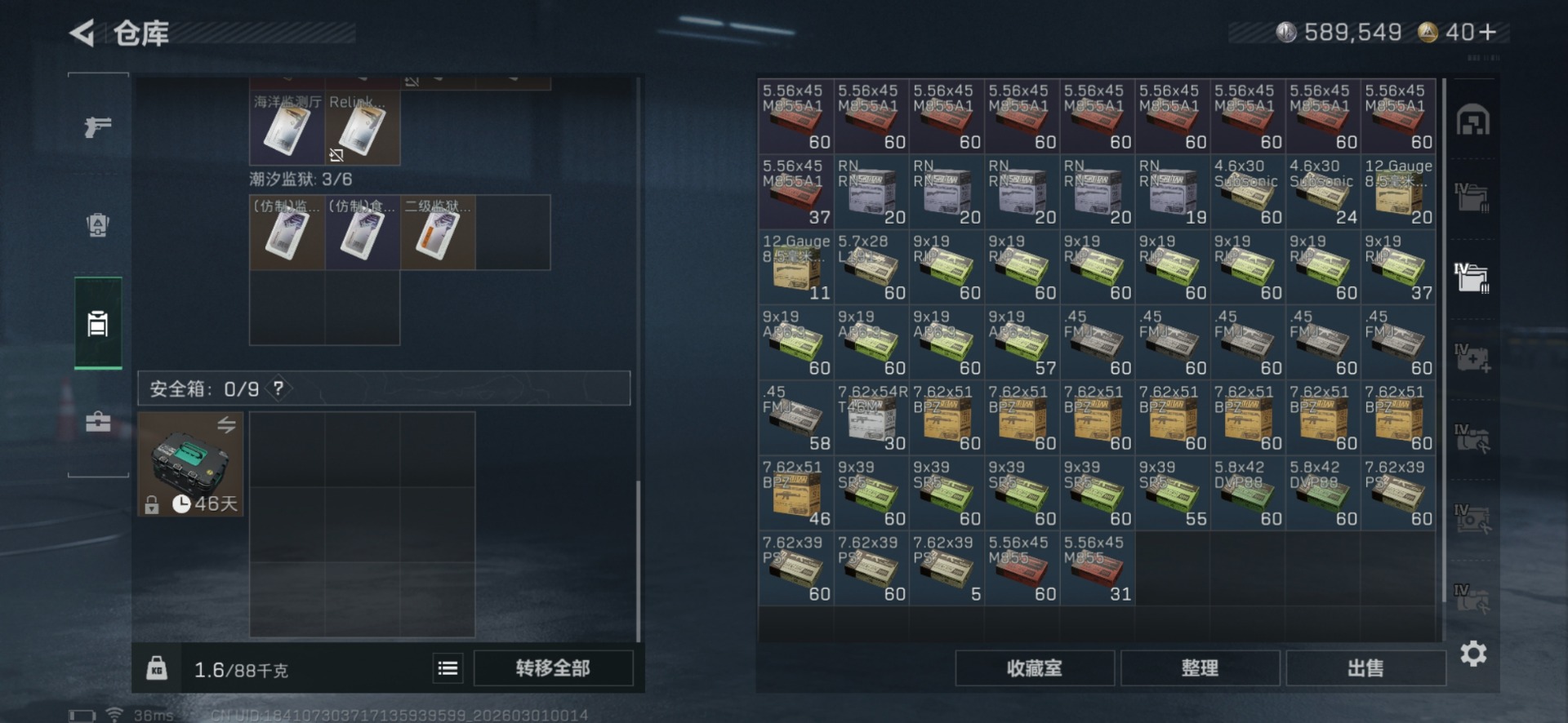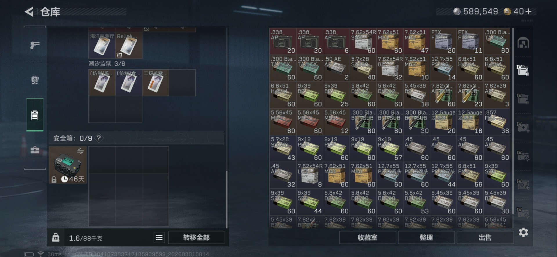 总资产:216.6M 3干员外观 3近战传说 40传说枪械 哈夫币:589.549K