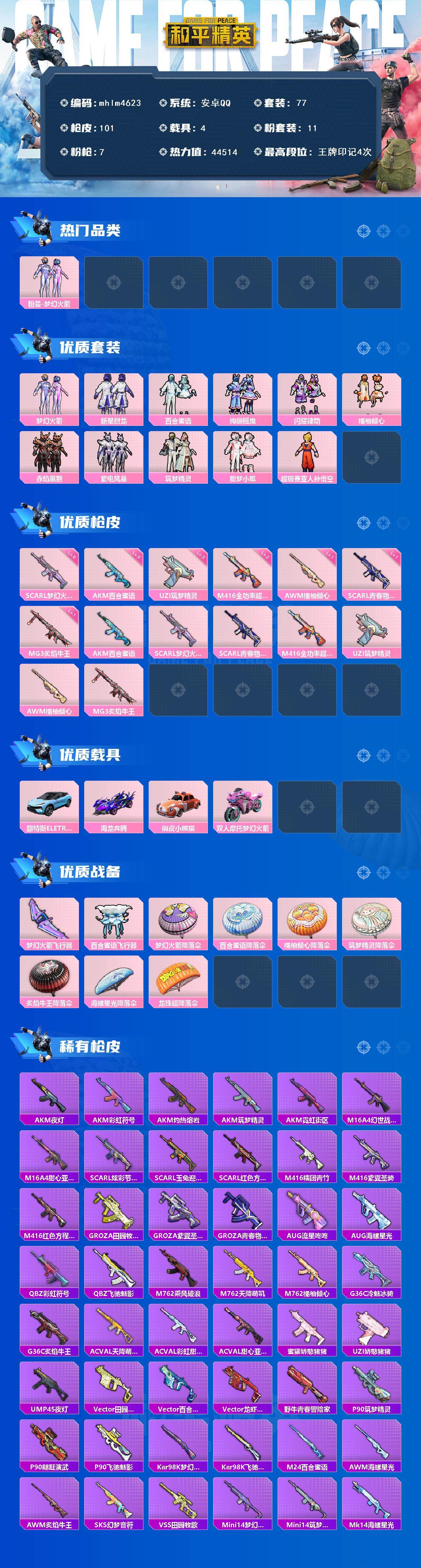 【mhlm4623】安卓 手Q-11粉装-7特效枪-4载具-2粉色飞行器-44514热力值-4王牌印记-77套装-101枪皮