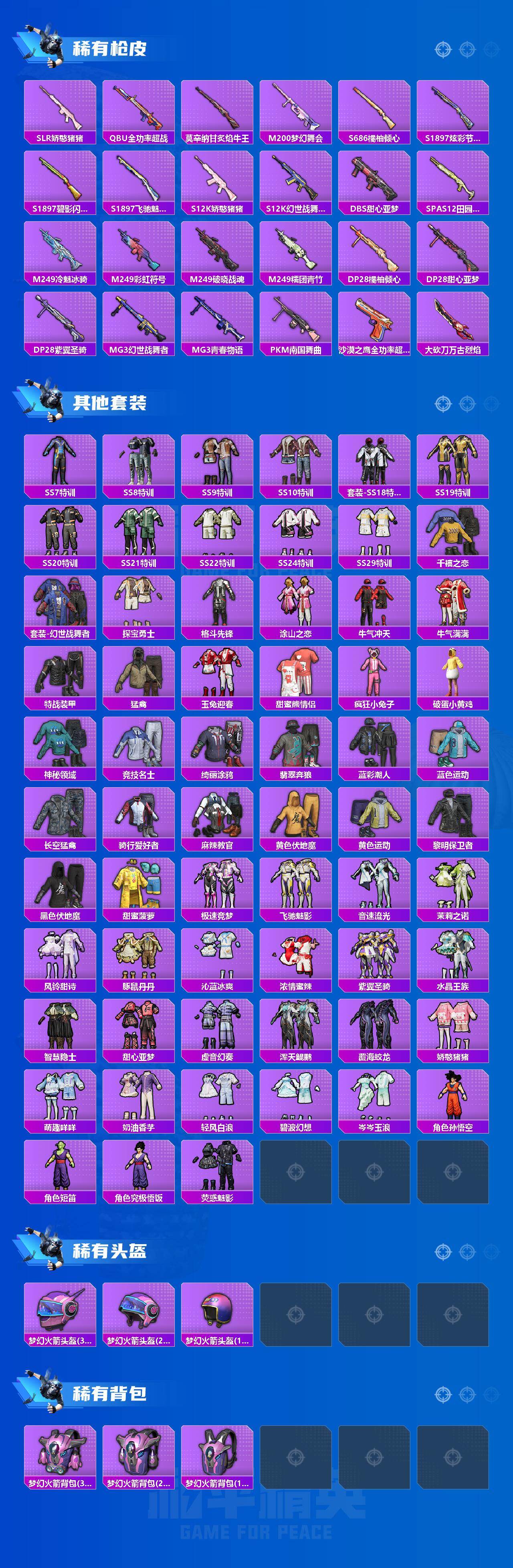 【粉色套装】:粉装-梦幻火箭,粉装-新星烈龙,粉装-百合蜜语,粉装-绚丽摇曳,粉装-闪耀律动,粉装-橘柚倾心,粉装-赤焰黑爵,粉装-紫电风暴,粉装-筑梦精灵,粉装-甜梦小狐,超级赛亚人-孙悟空
