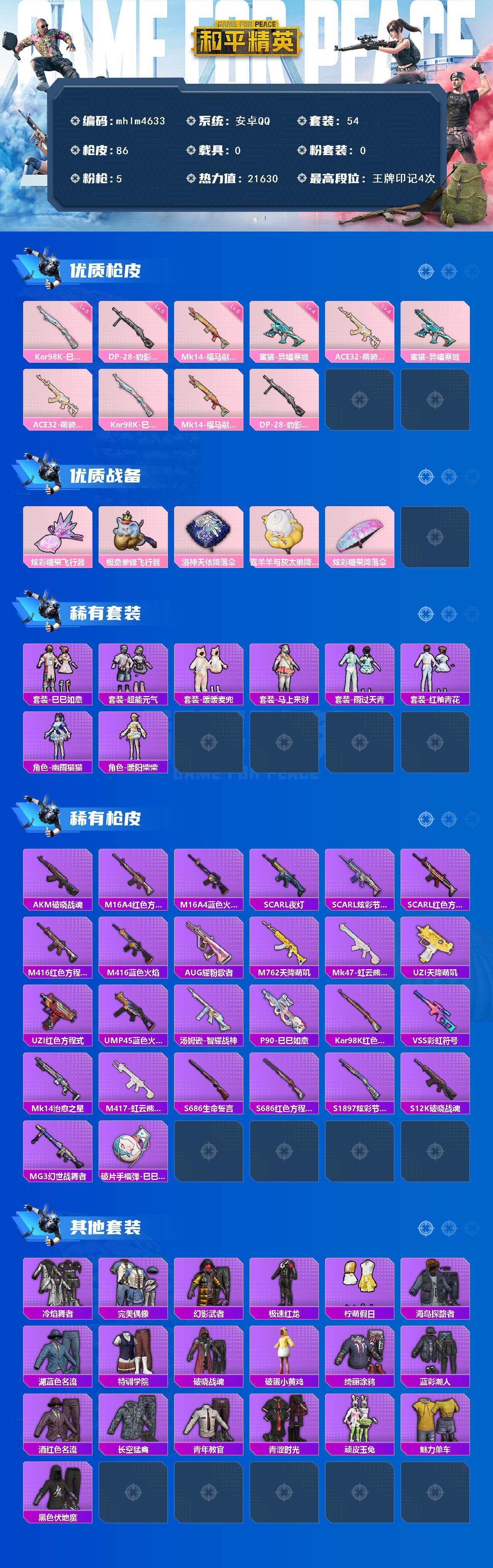 【mhlm4633】安卓 手Q-0粉装-5特效枪-0载具-2粉色飞行器-21630热力值-4王牌印记-54套装-86枪皮