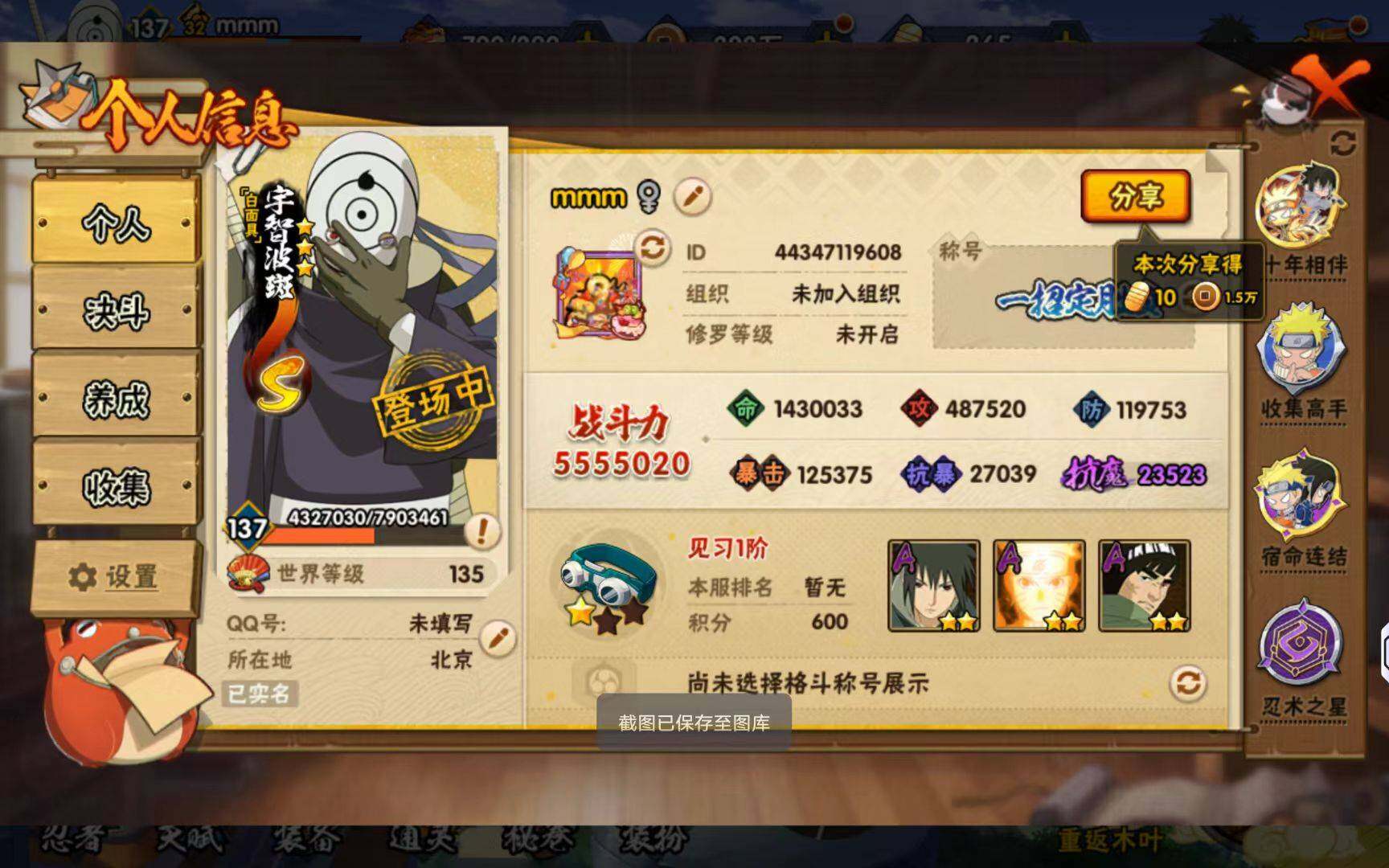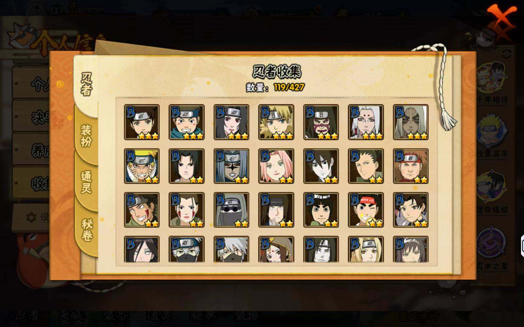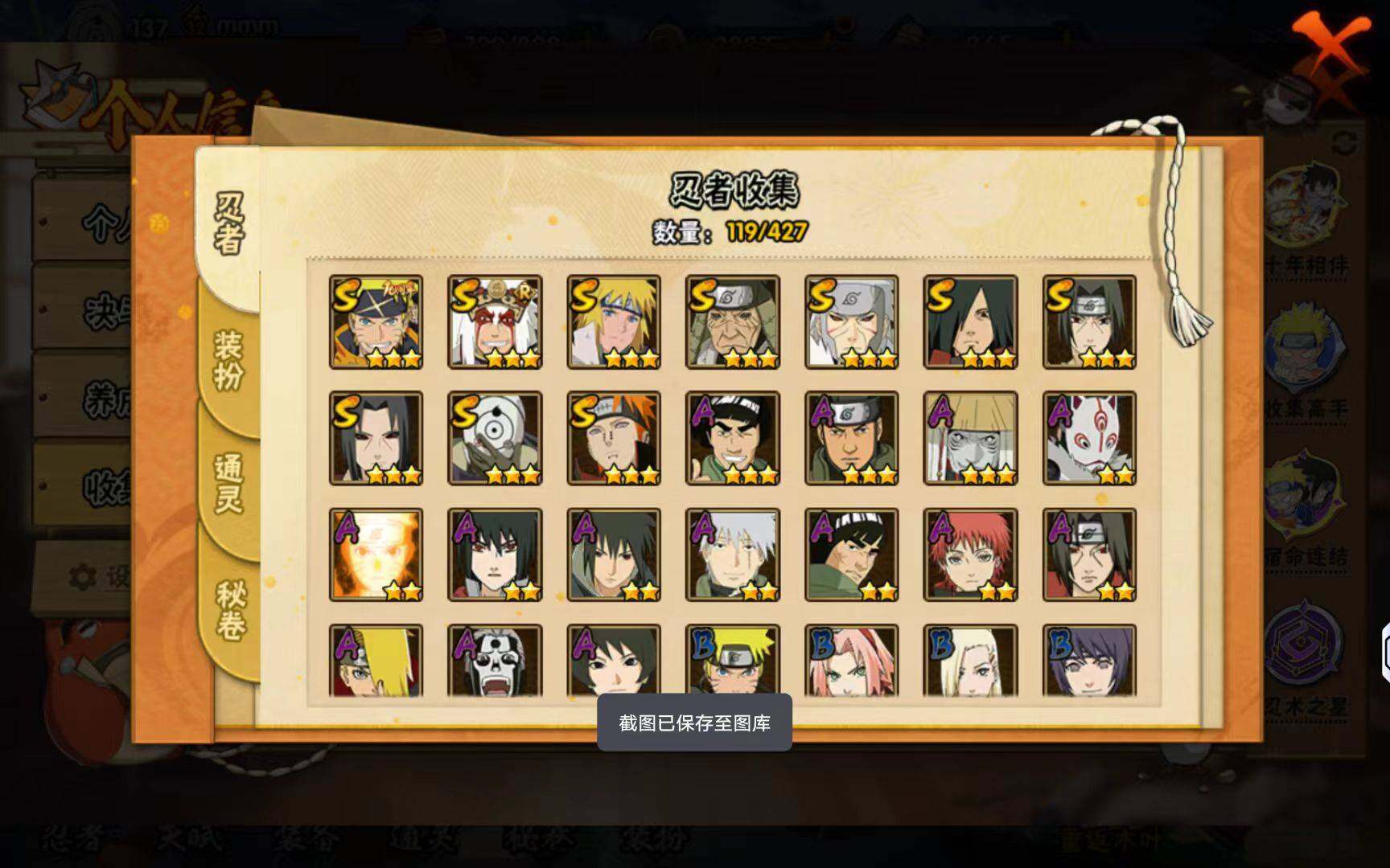 【S级忍者】:猿飞日斩「秽土转生」(3星),千手扉间「秽土转生」(3星),宇智波鼬「秽土转生」(3星),宇智波鼬「须佐能乎」(3星),自来也「舞之豪杰」(3星),宇智波斑(3星),波风水门(3星),佩恩「天道」(3星),宇智波斑 「白面具」(3星宇智波斑「白面具」),漩涡鸣人·宇智波佐助(3星)