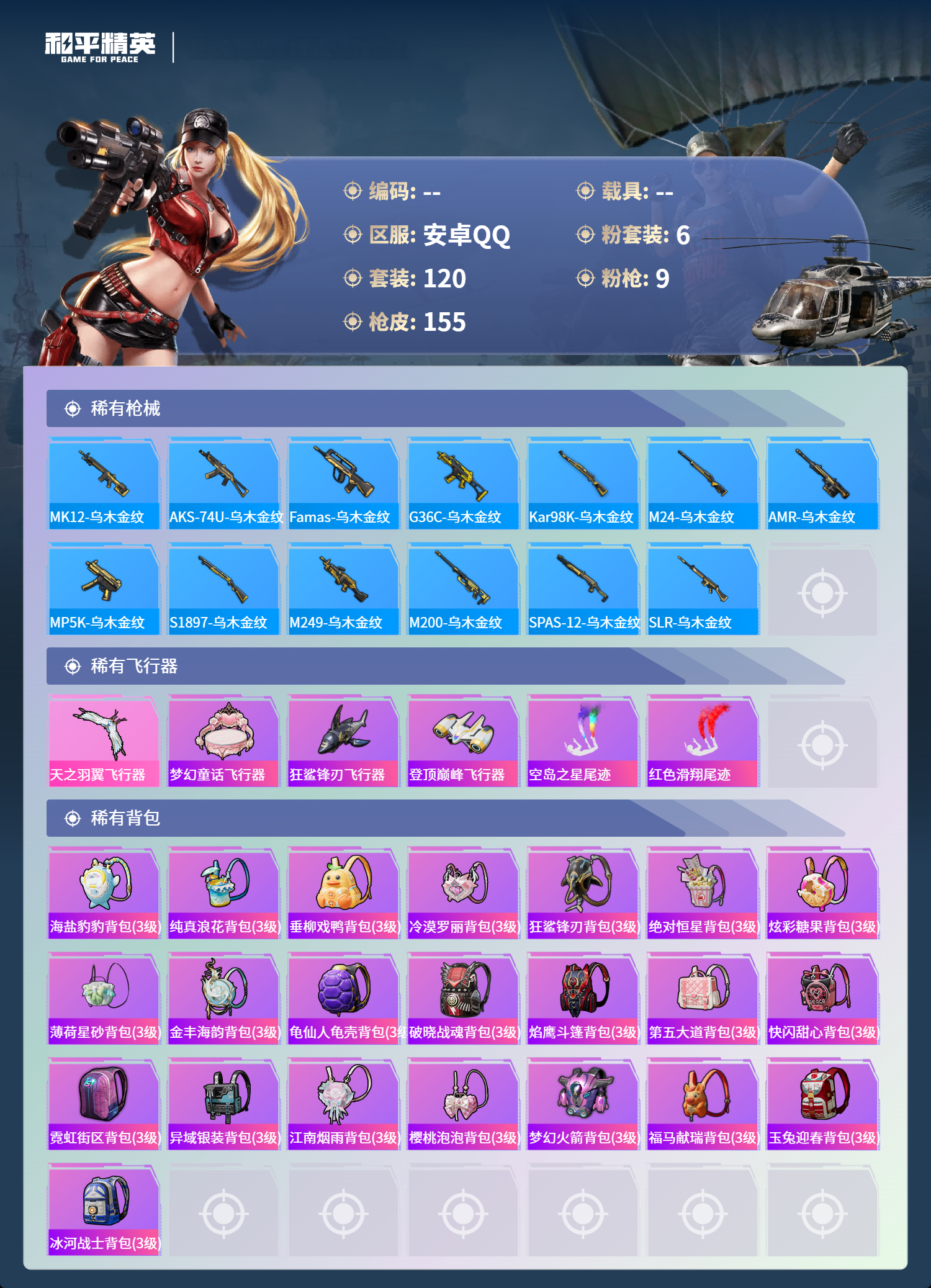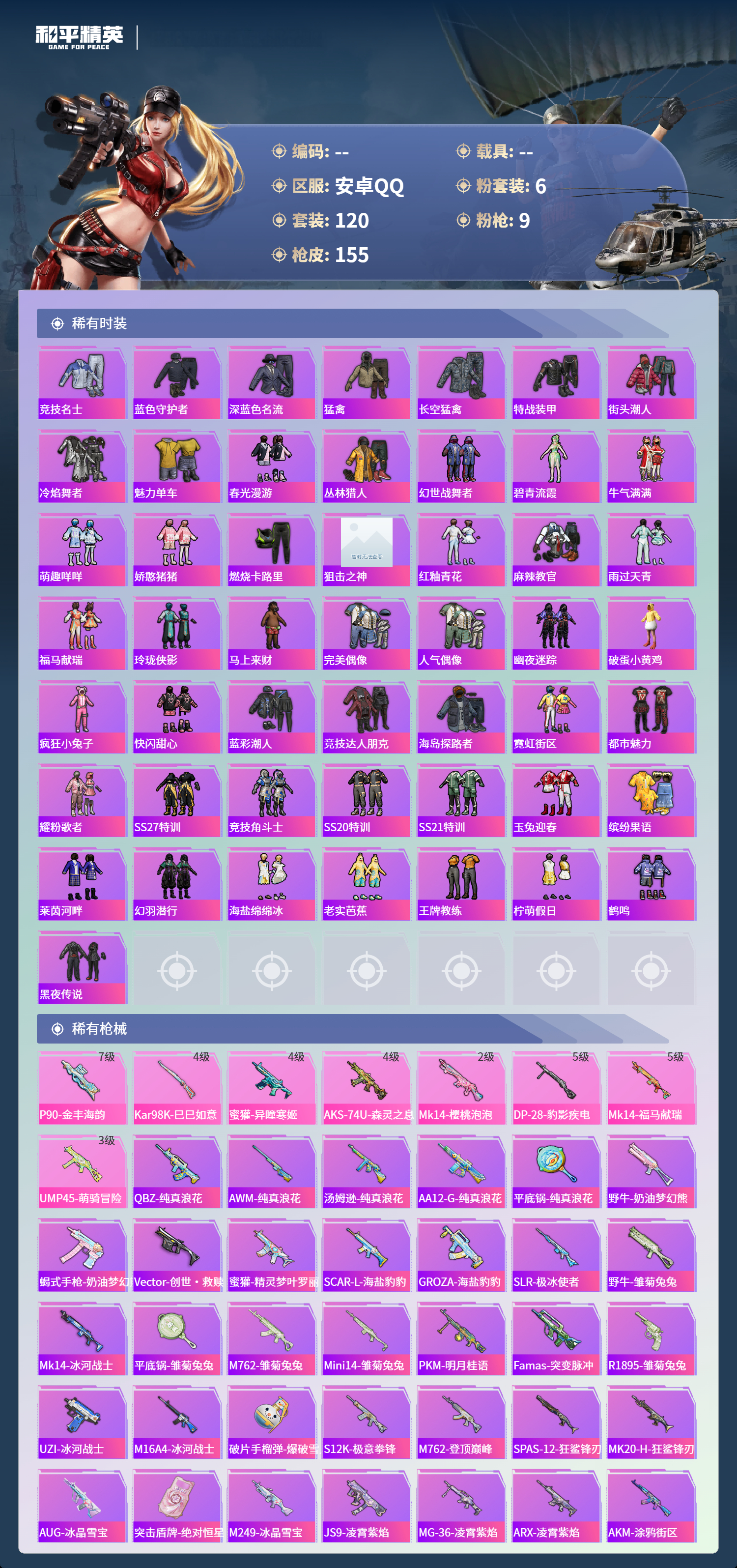 hs62966安卓手Q-3王牌印记-6粉装-9特效枪-48879热力值-120套装-155枪皮