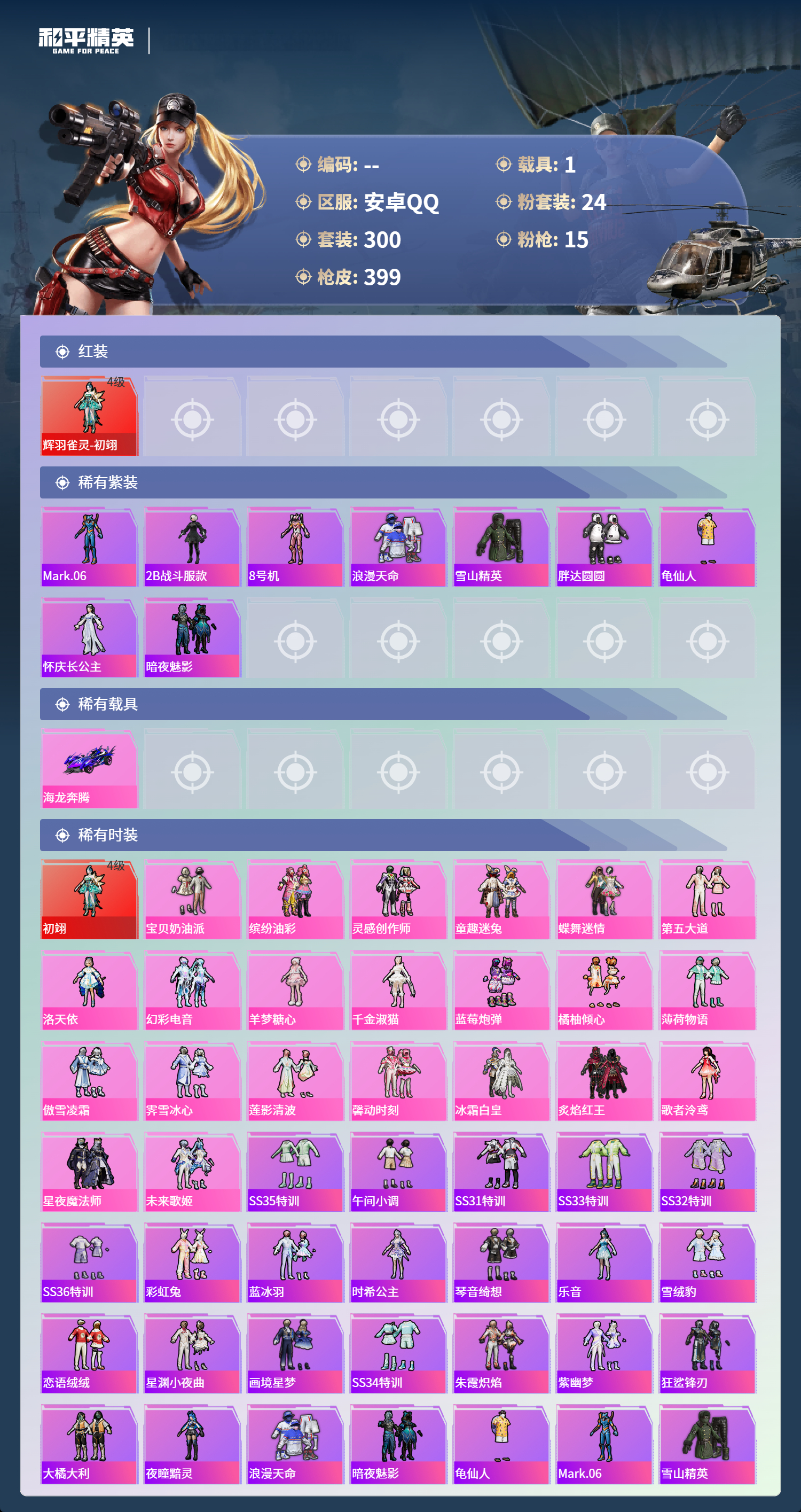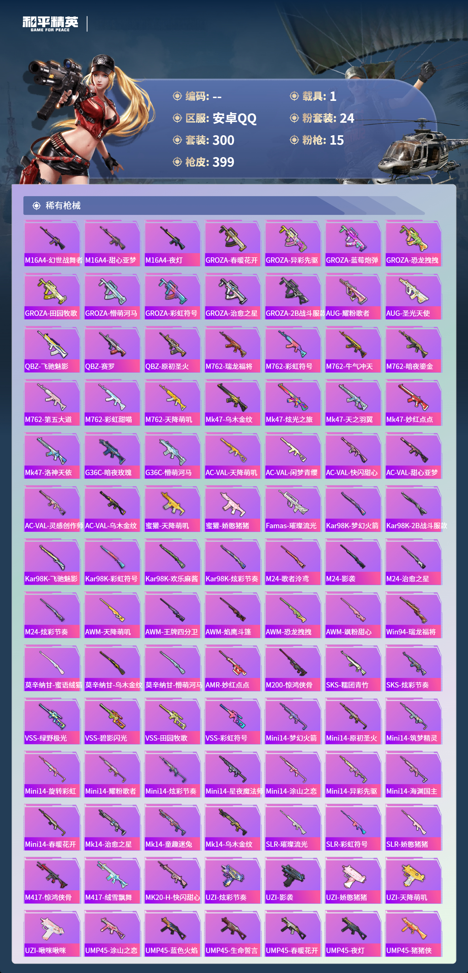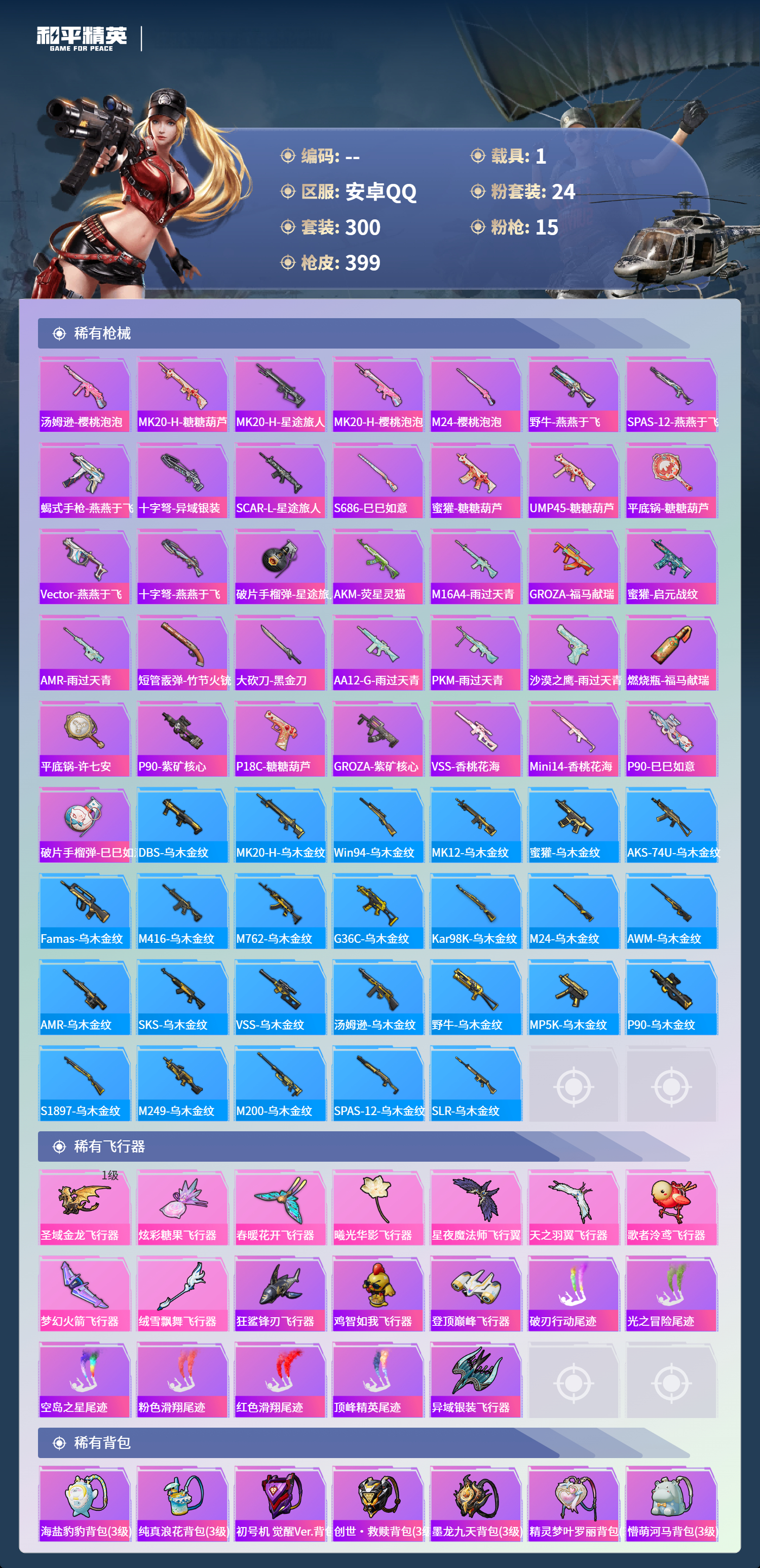 安卓手Q-22王牌印记-1红装-24粉装-15特效枪-1载具-热