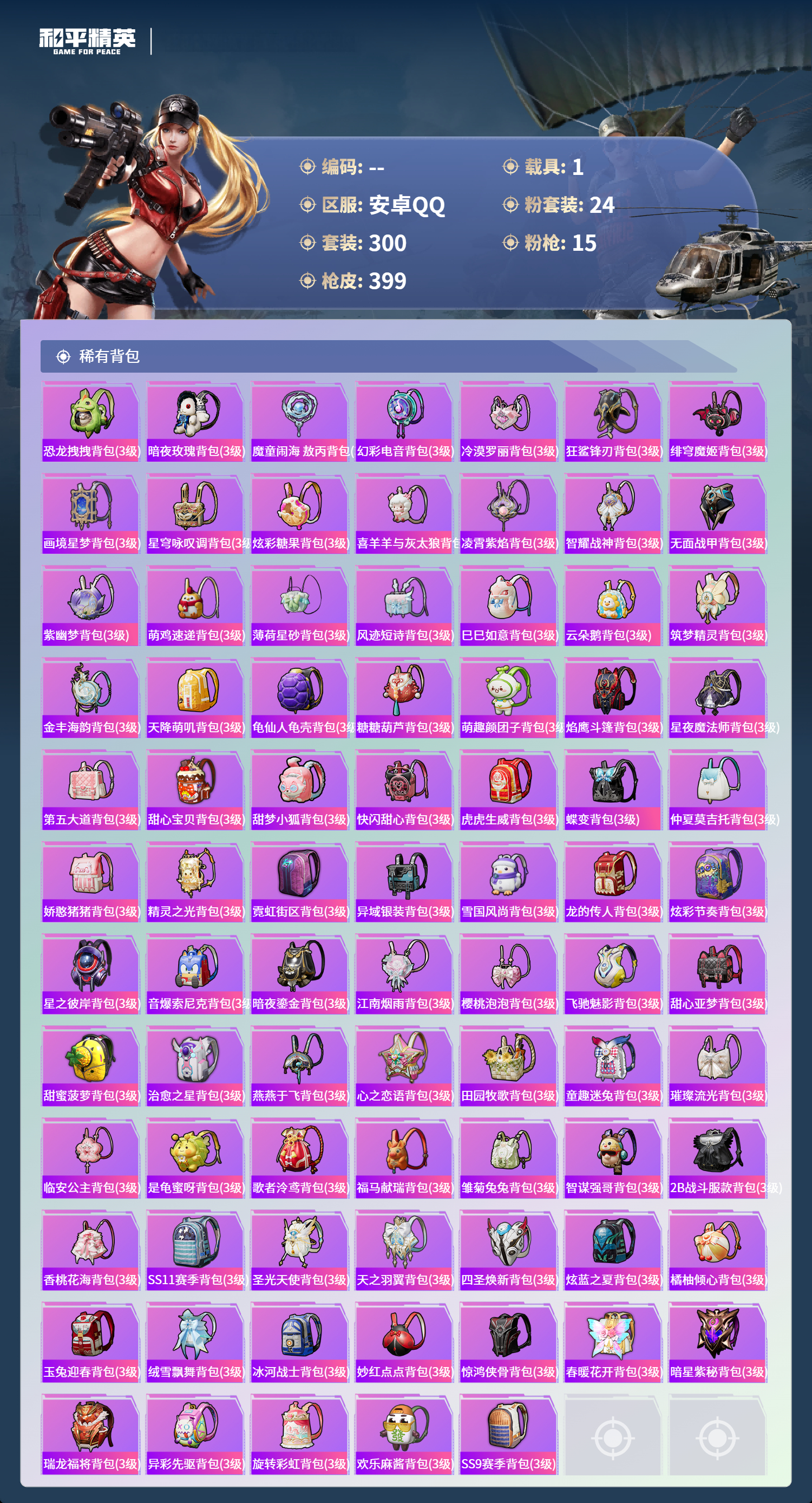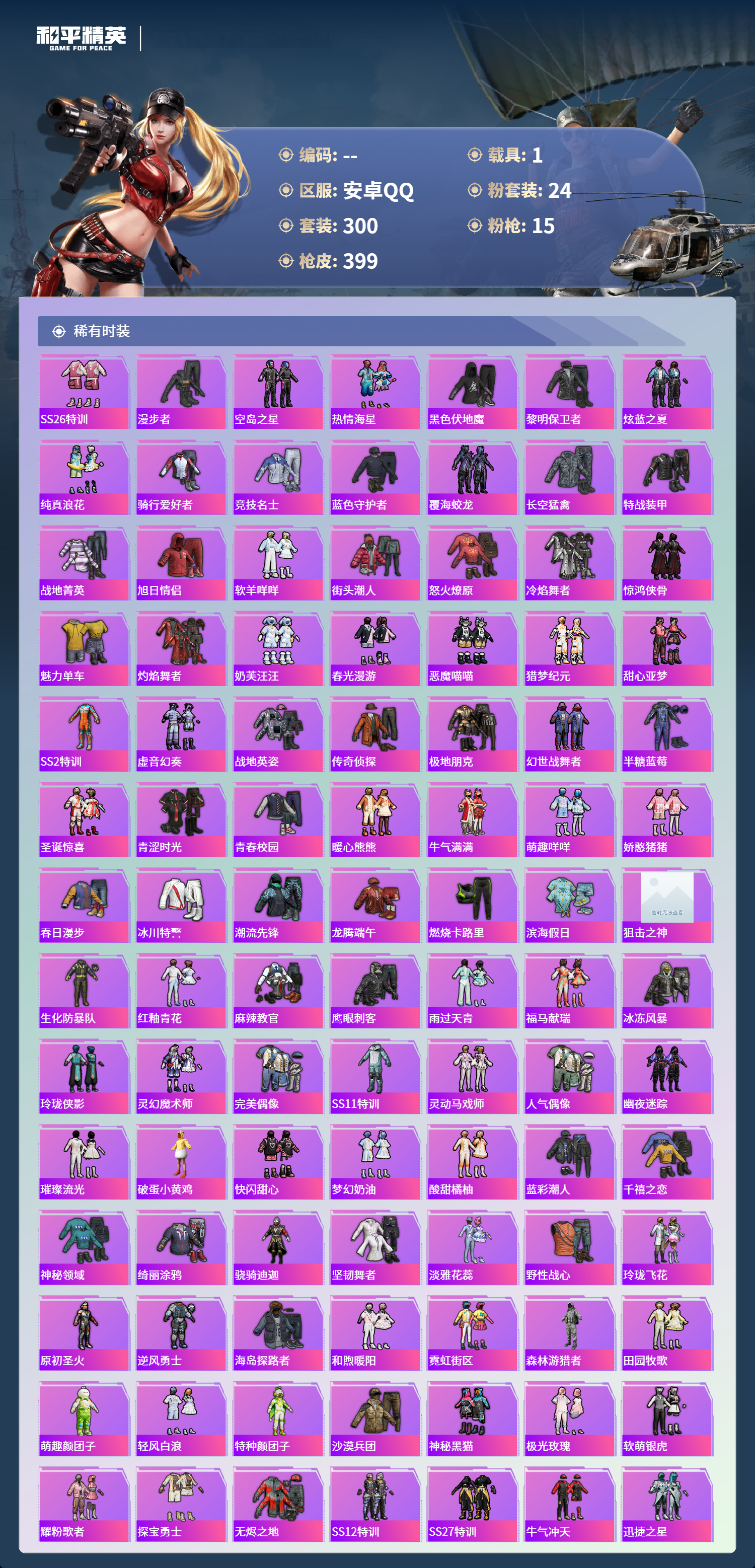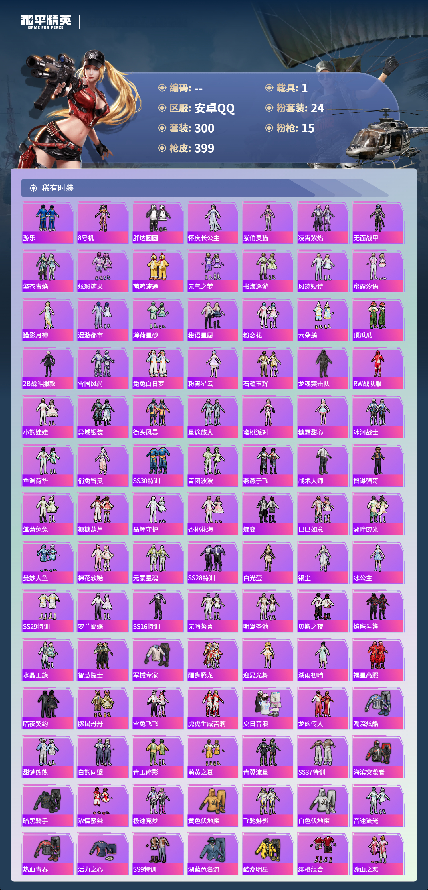 hs62957 安卓手Q-22王牌印记-1红装-24粉装-15特效枪-1载具-热力值-300套装-399枪皮-4卓越印记-1传奇印记