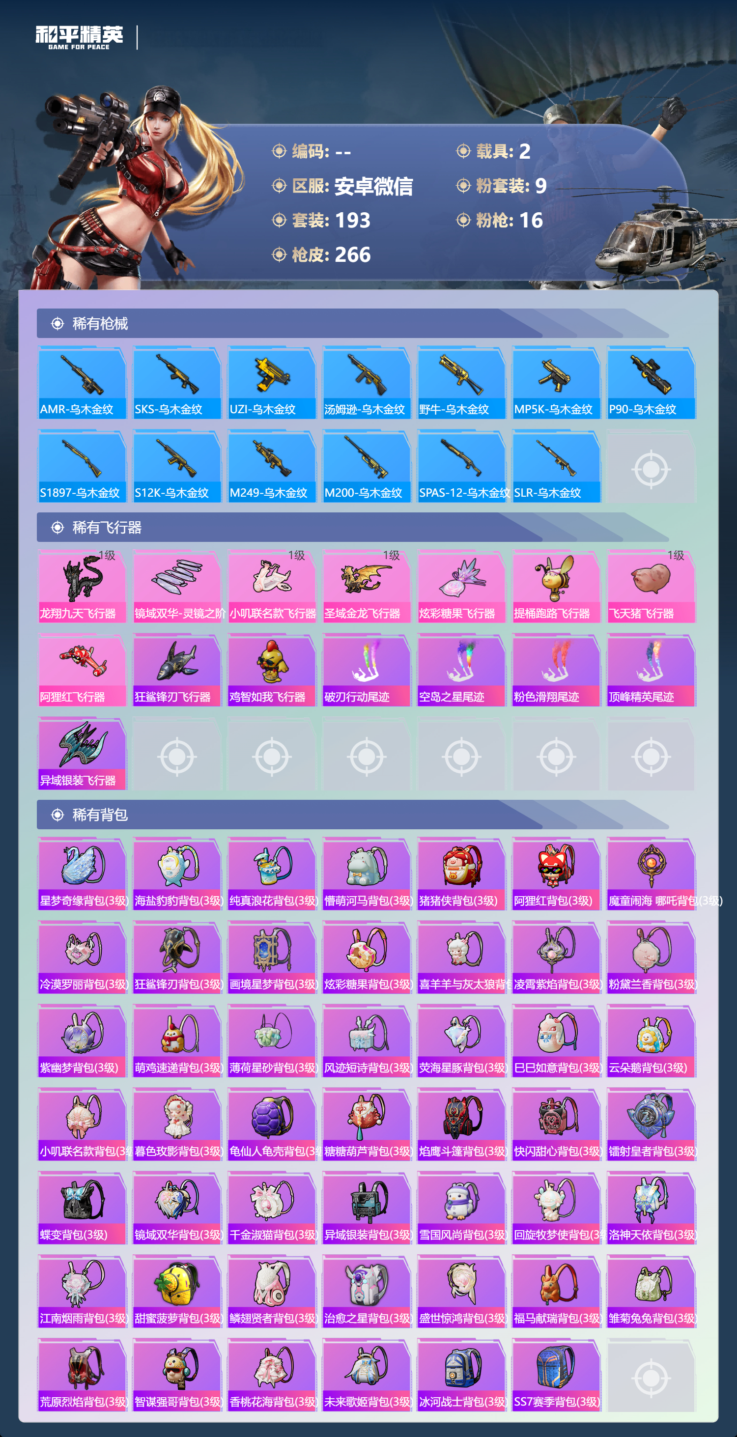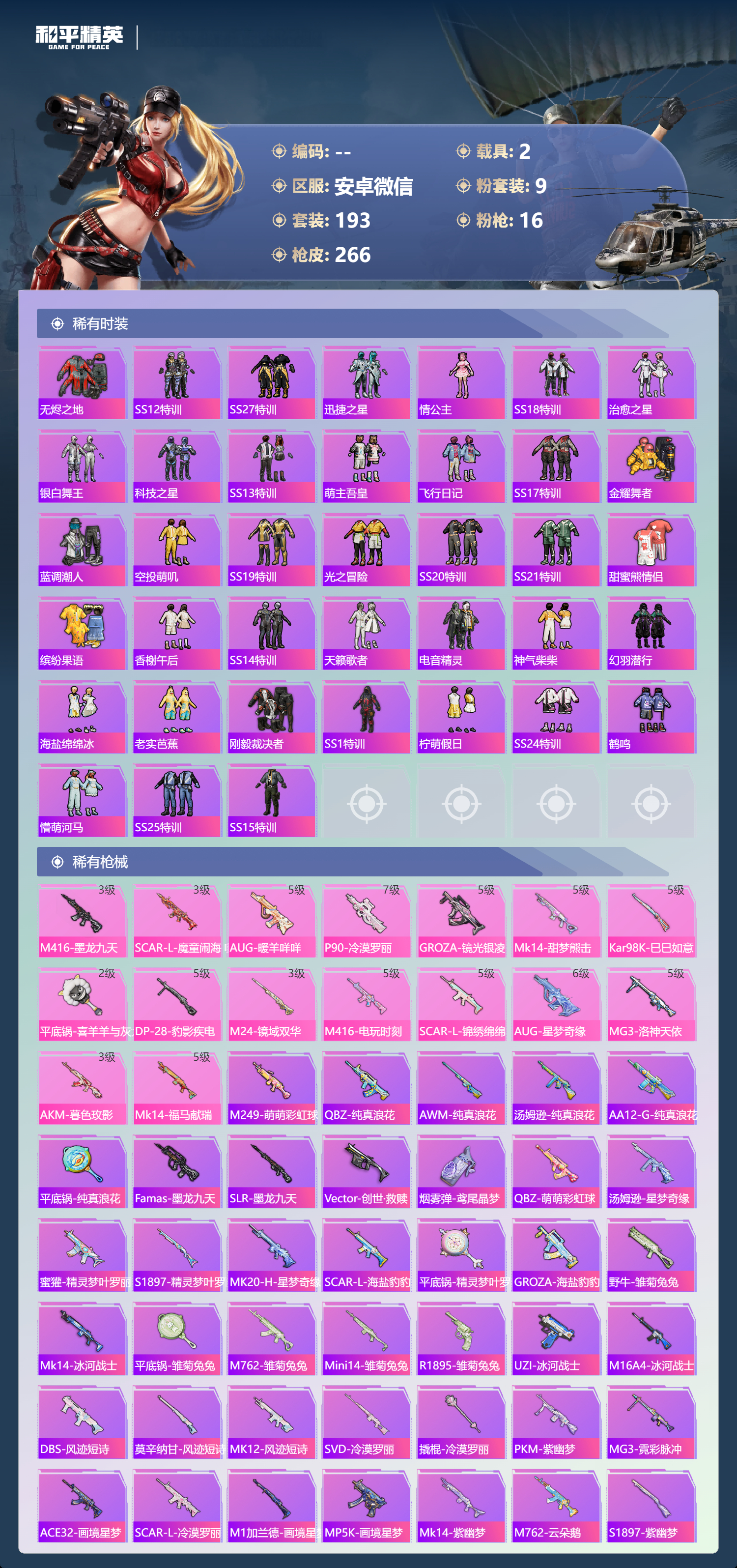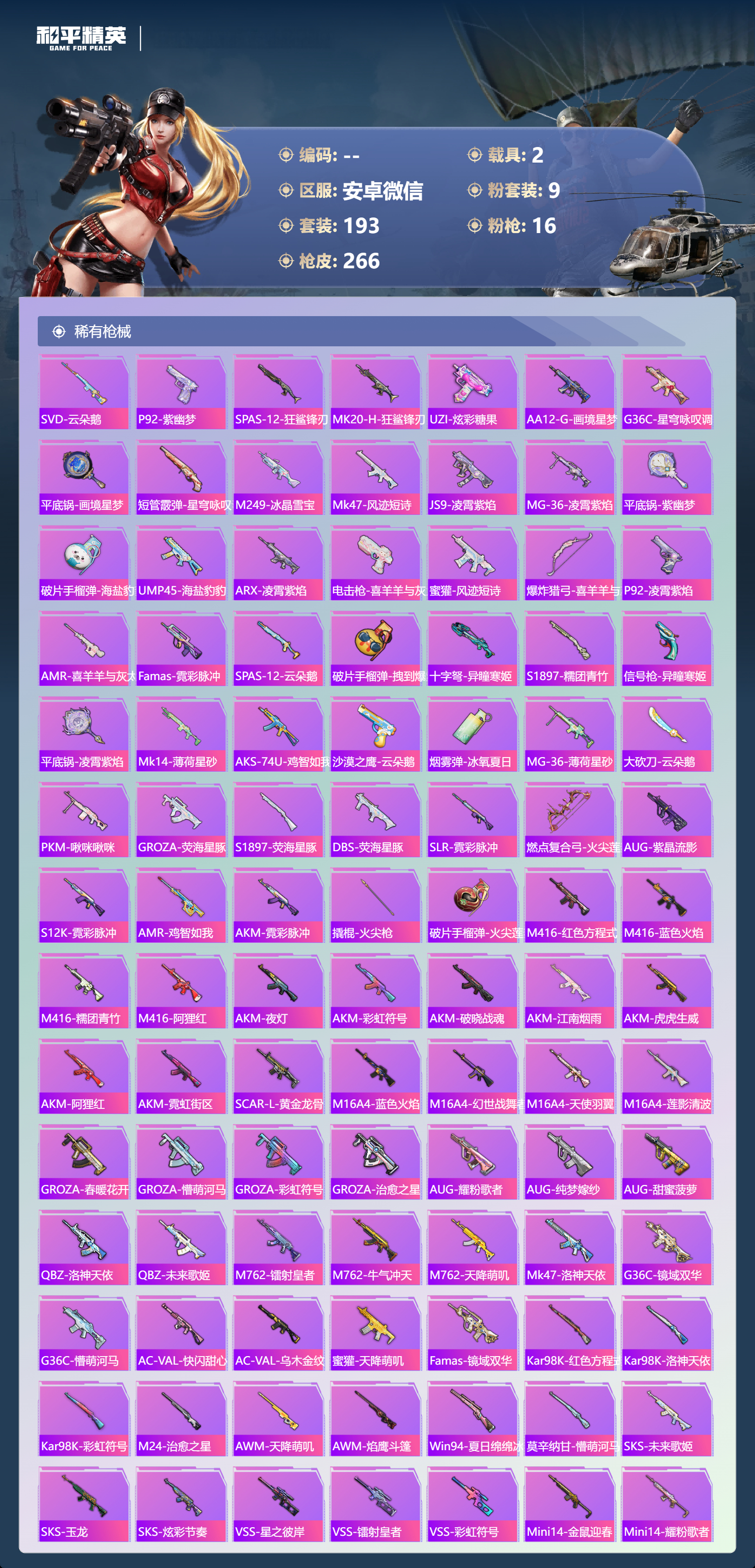 hs63162 安卓微信-14王牌印记-3红装-9粉装-16特效枪-2载具-98137热力值-193套装-266枪皮-4卓越印记-3传奇印记