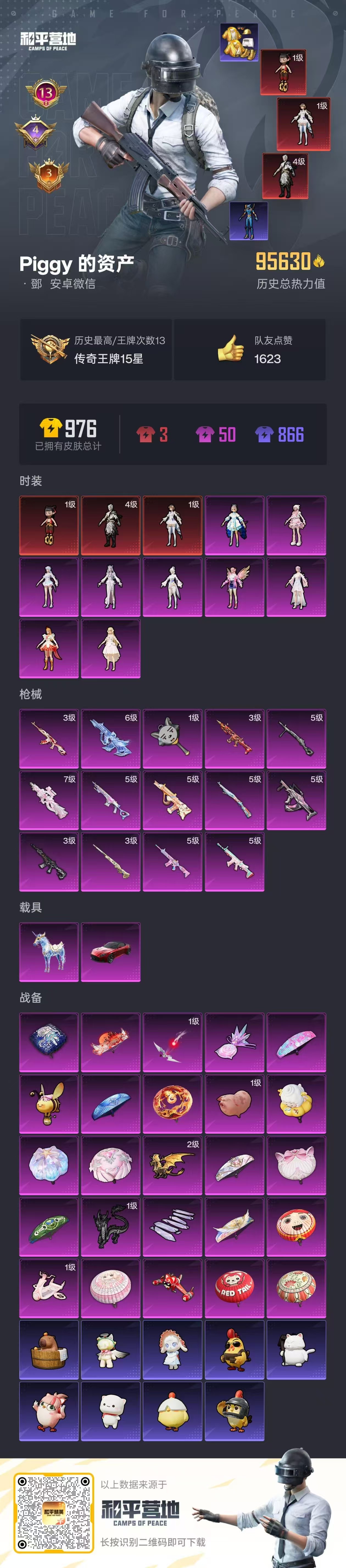 14王牌印记-3红装-9粉装-16特效枪-2载具-98137热力值-193套装-266枪皮-4卓越印记-3传奇印记