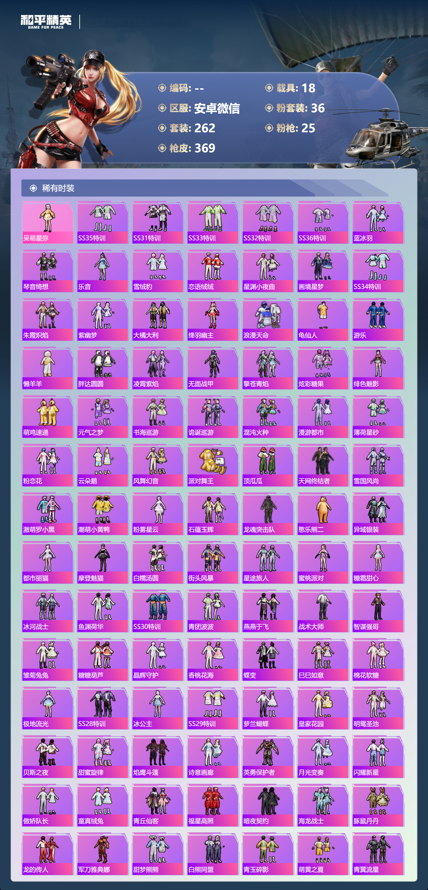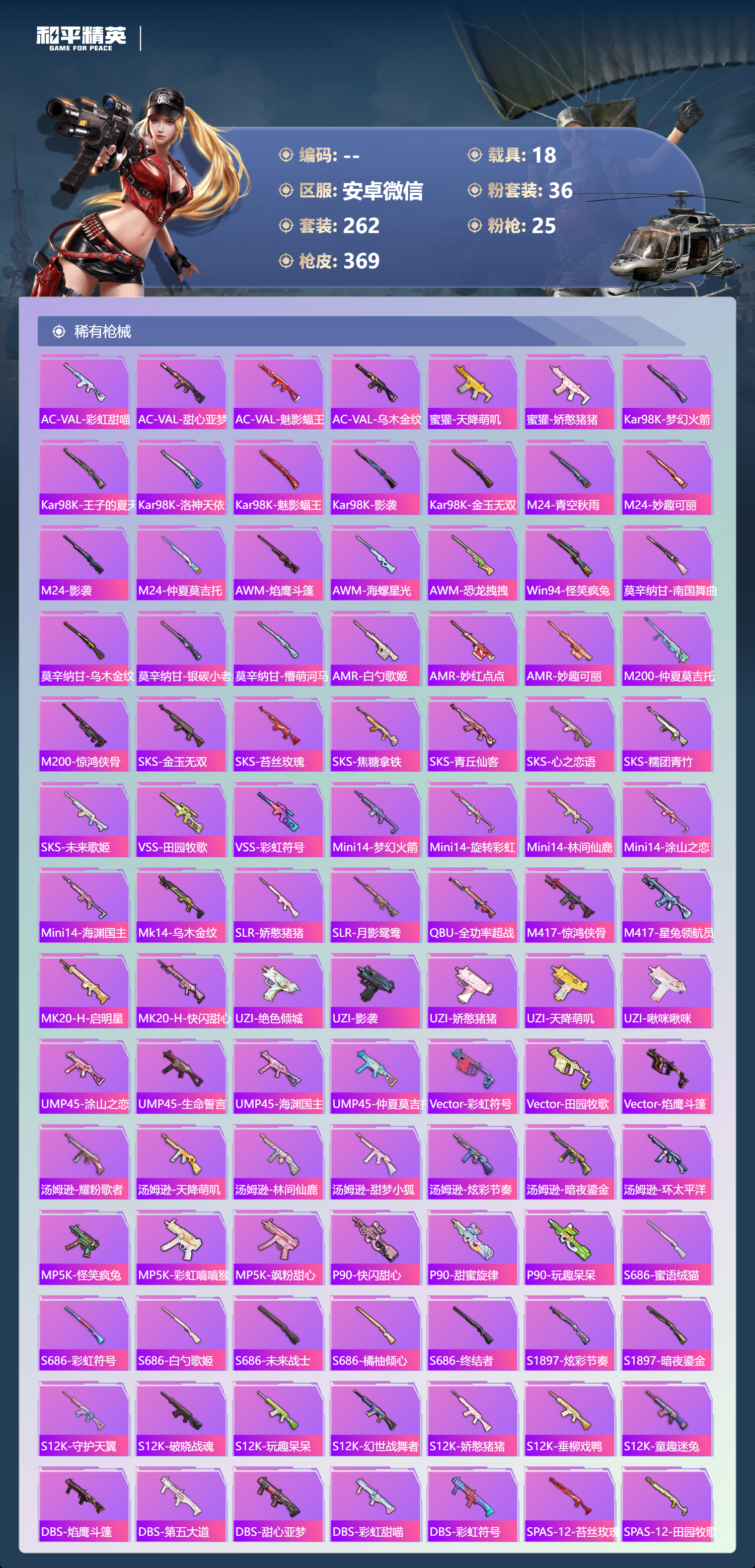hs63173 安卓微信-14王牌印记-1红装-36粉装-25特效枪-18载具-热力值-262套装-369枪皮-1卓越印记