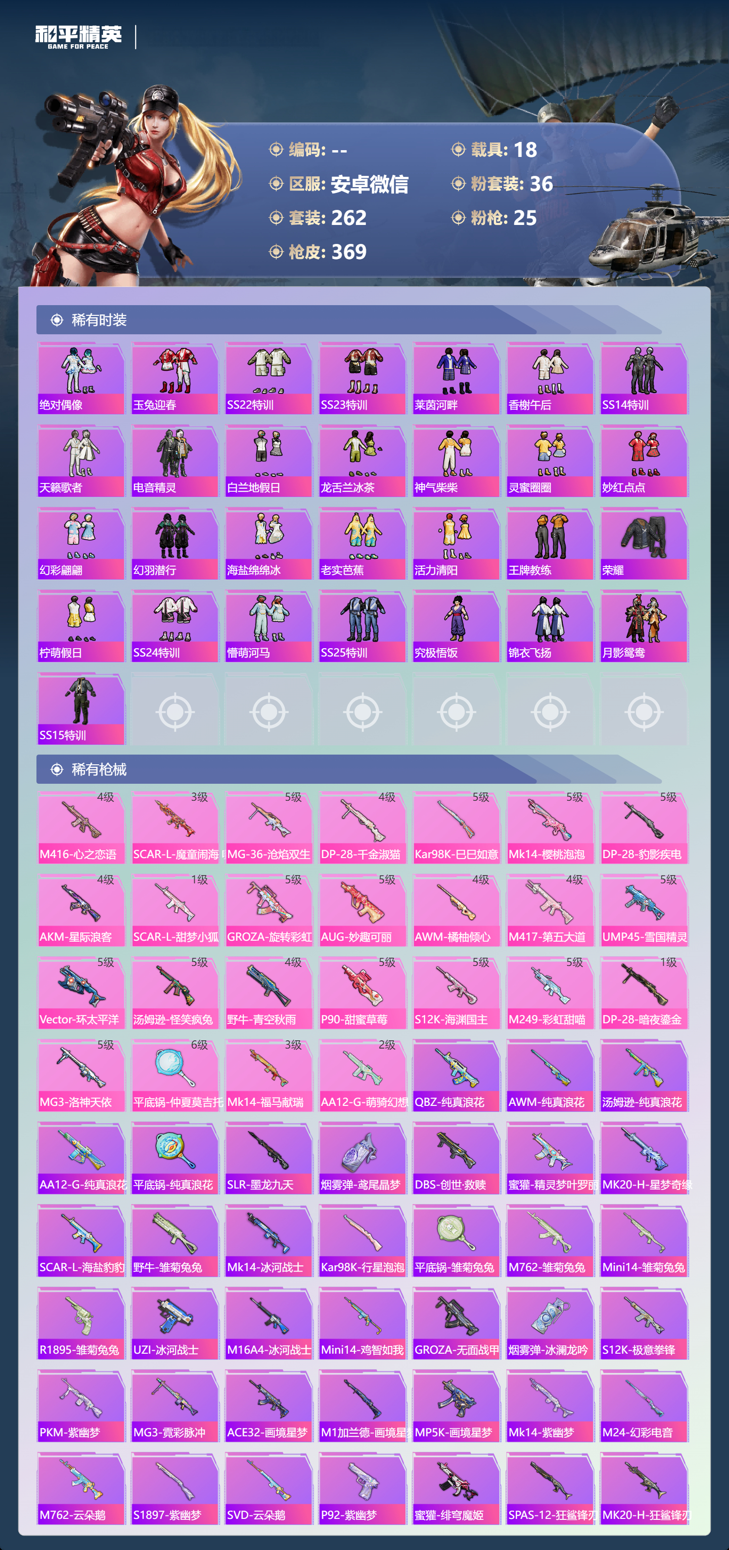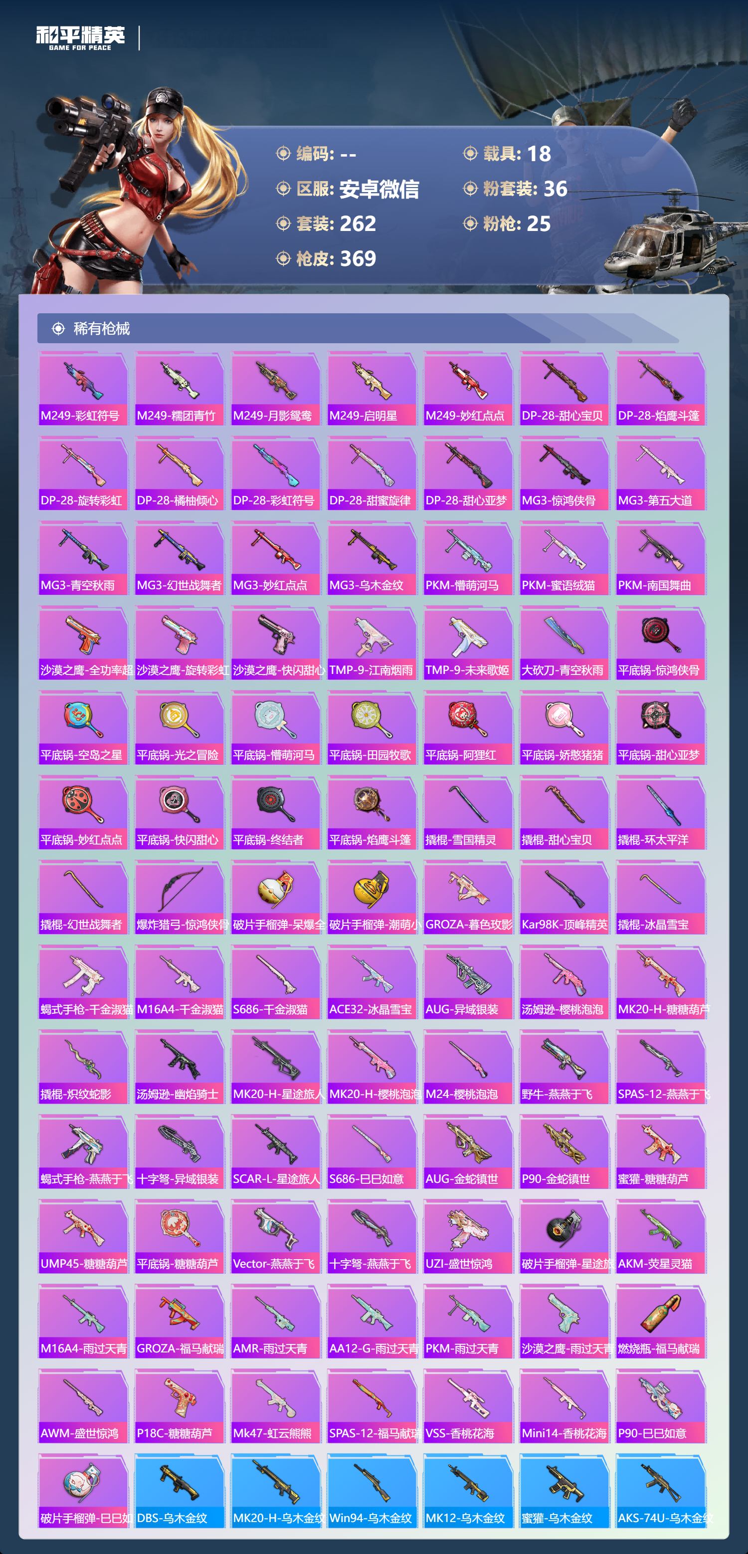安卓微信-14王牌印记-1红装-36粉装-25特效枪-18载具-