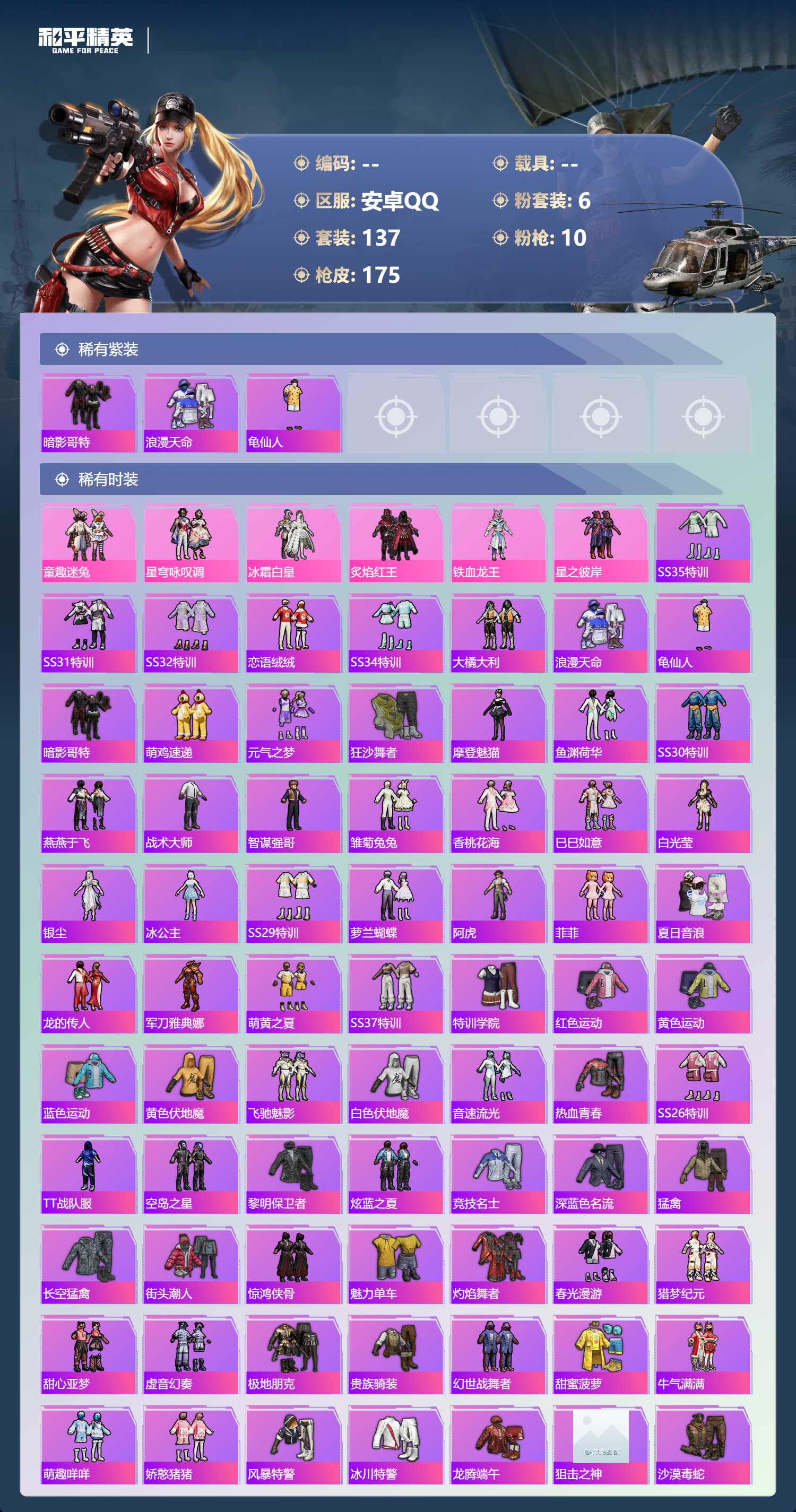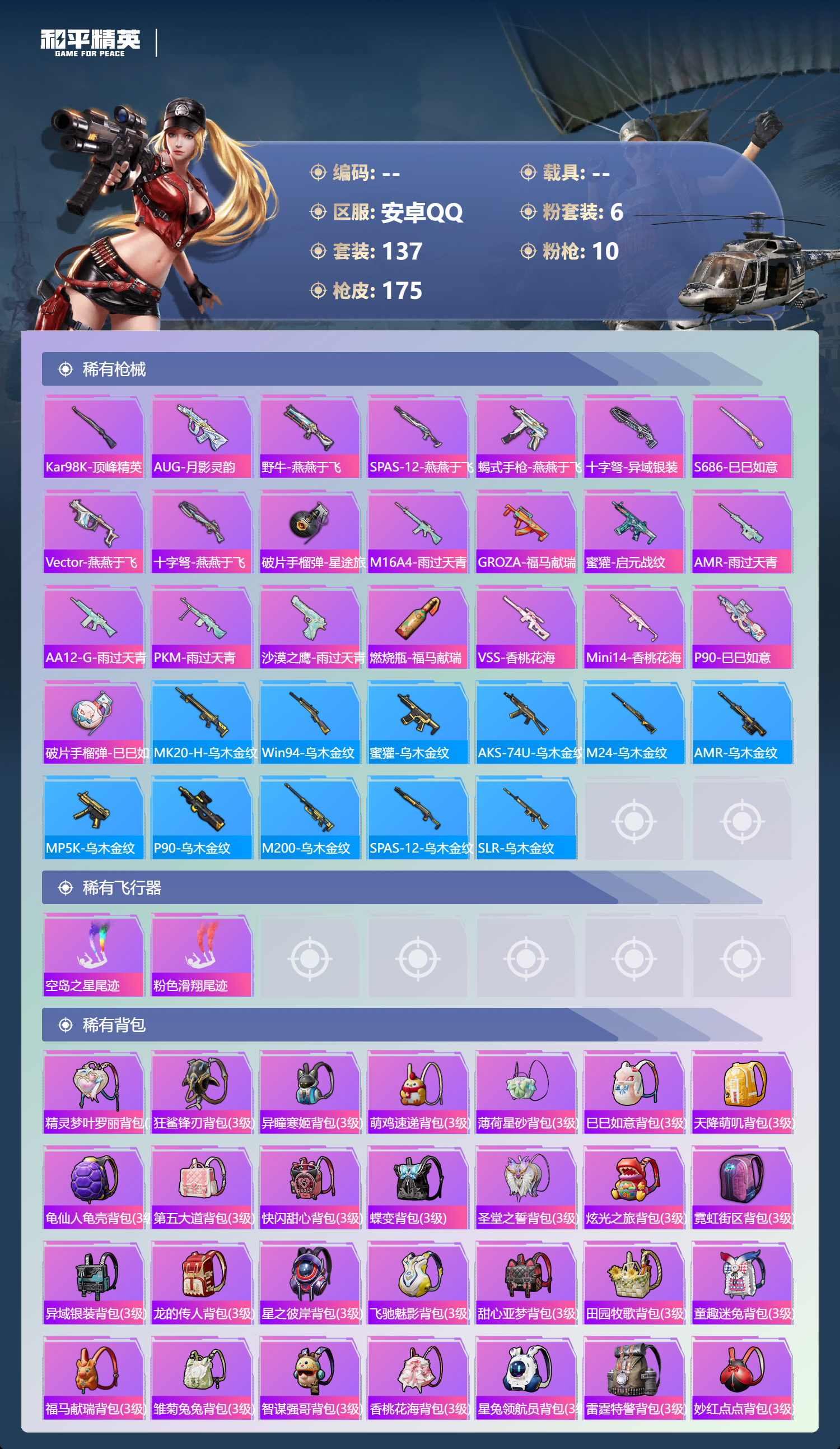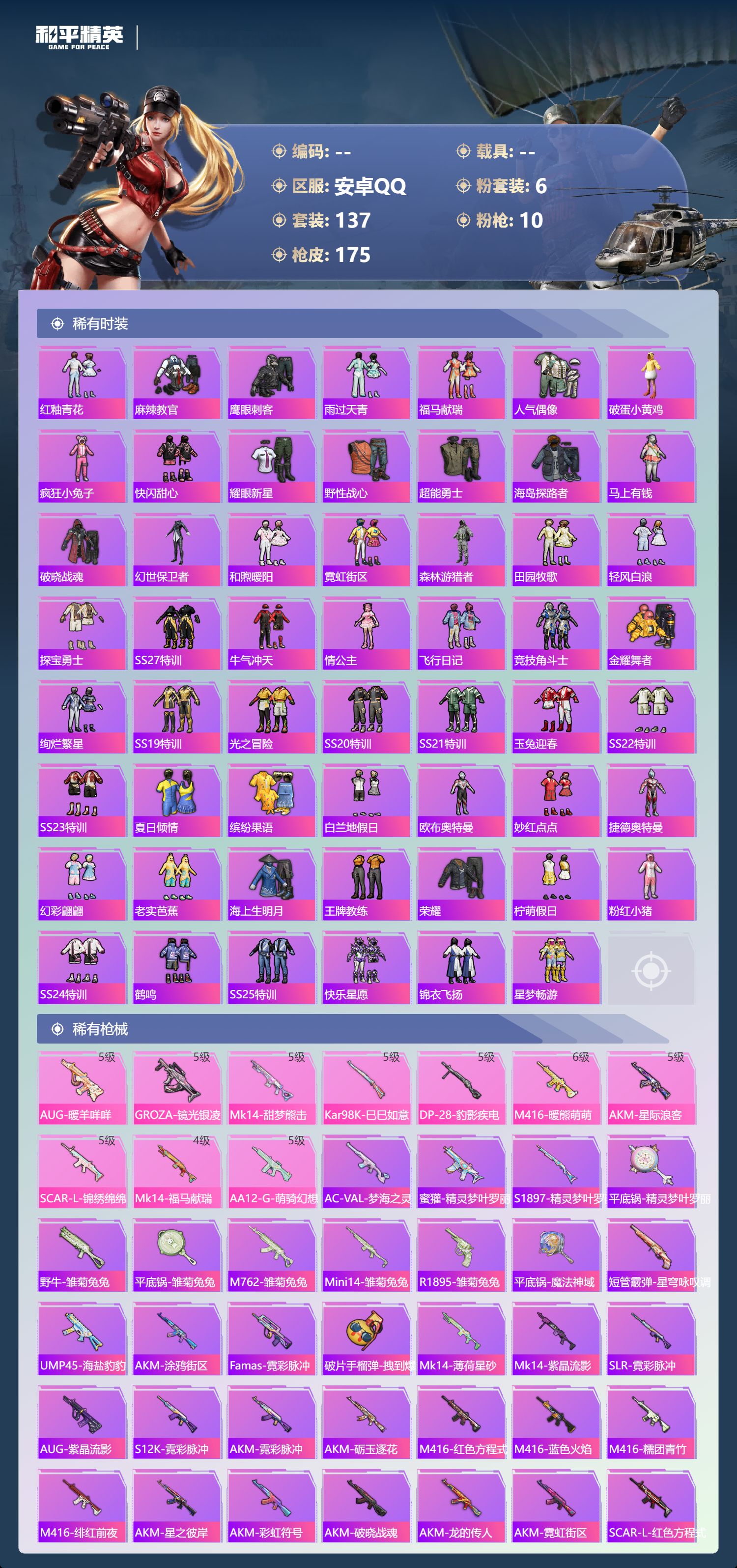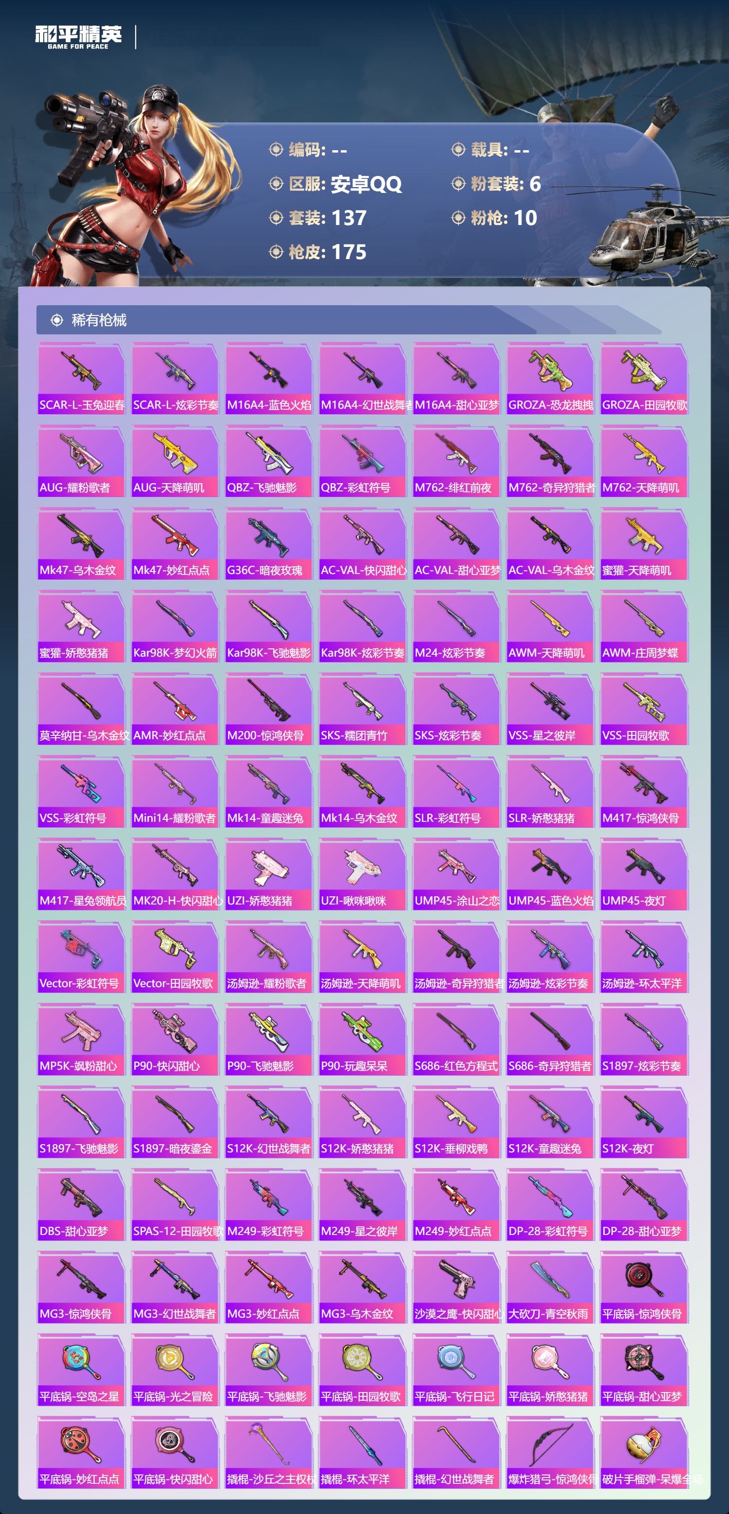 hs62941 安卓手Q-6王牌印记-6粉装-10特效枪-50913热力值-137套装-175枪皮