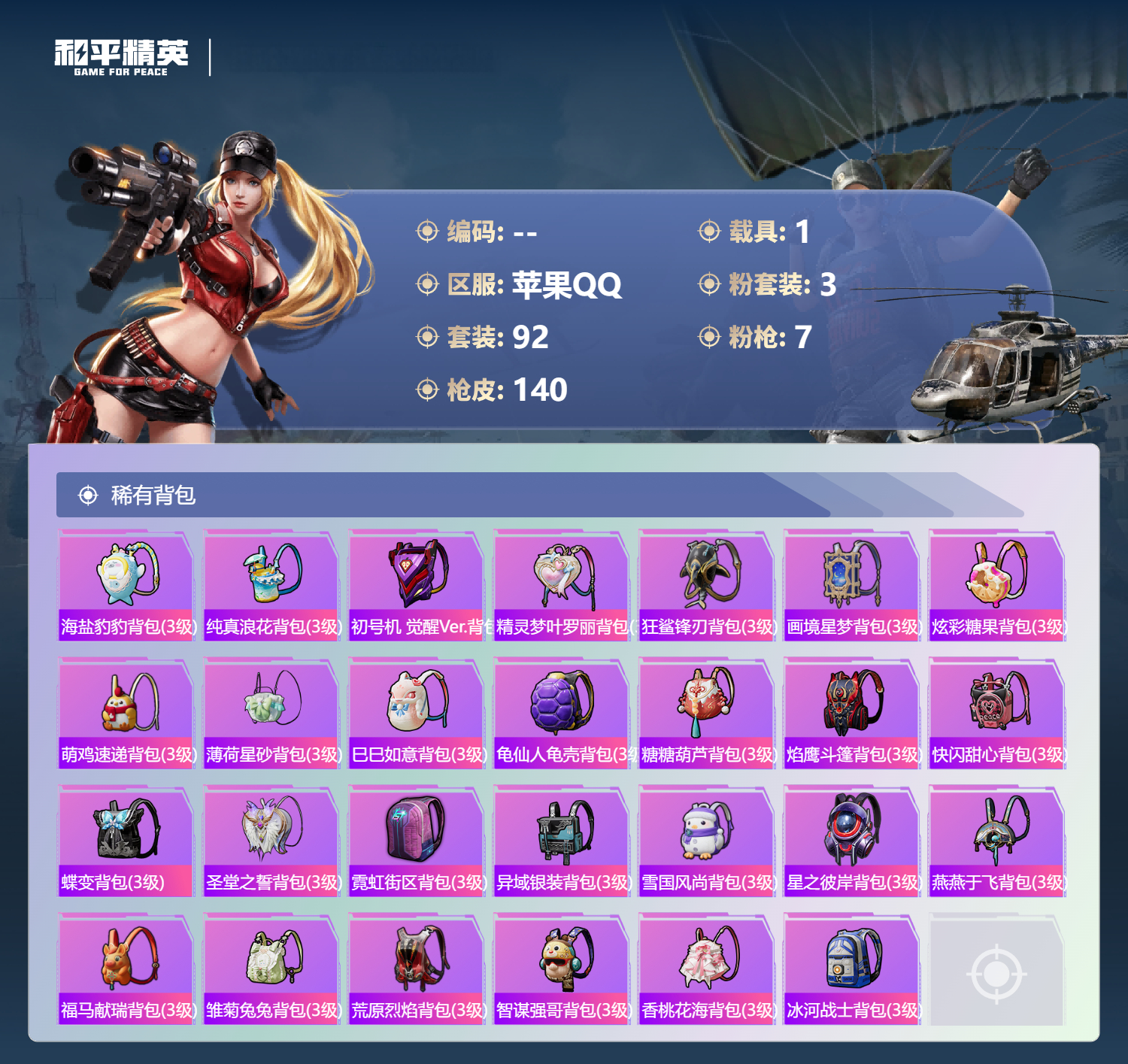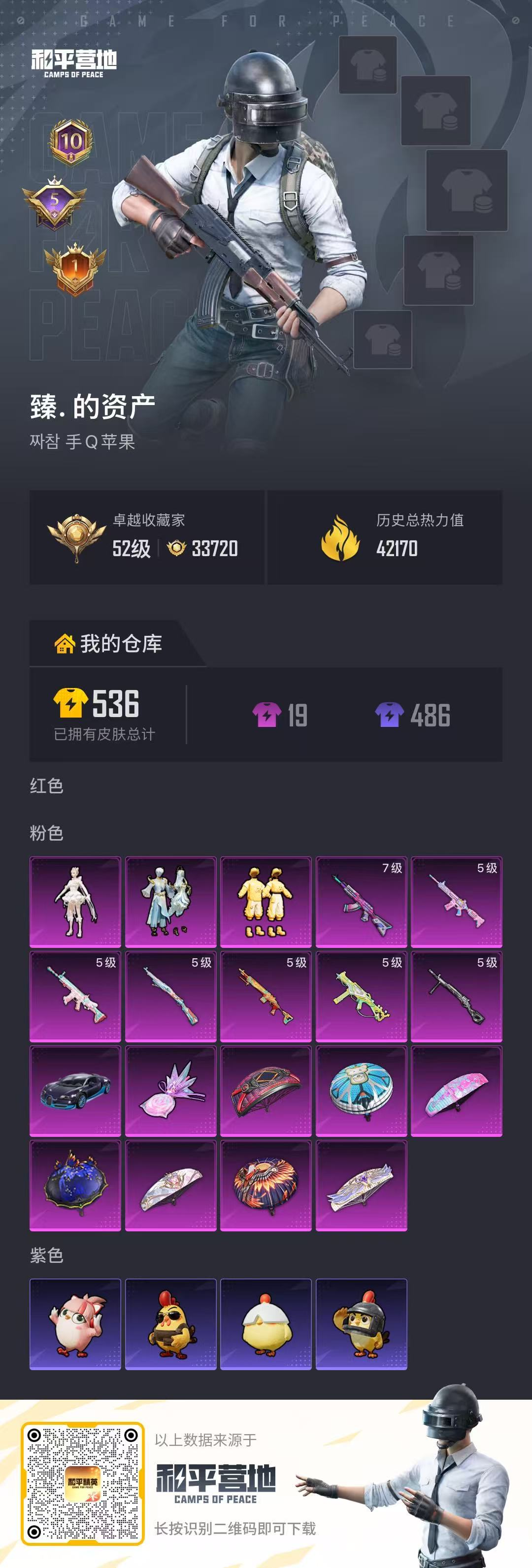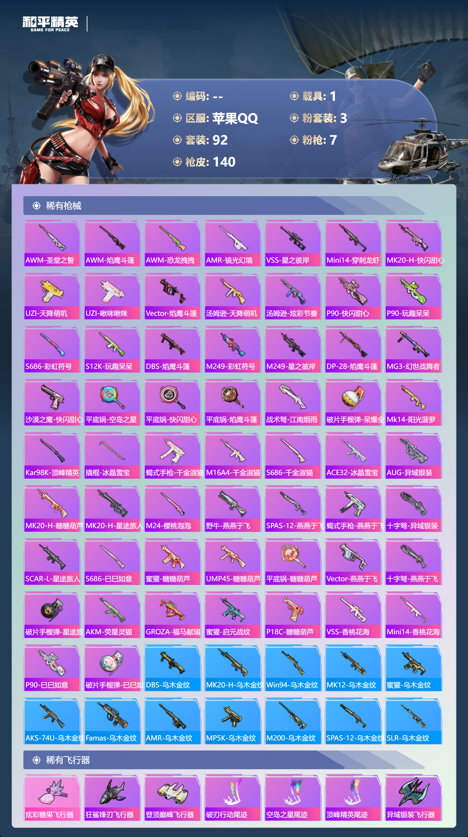 hs62945 苹果手Q-10王牌印记-3粉装-7特效枪-1载具-42170热力值-92套装-140枪皮-5卓越印记-1传奇印记