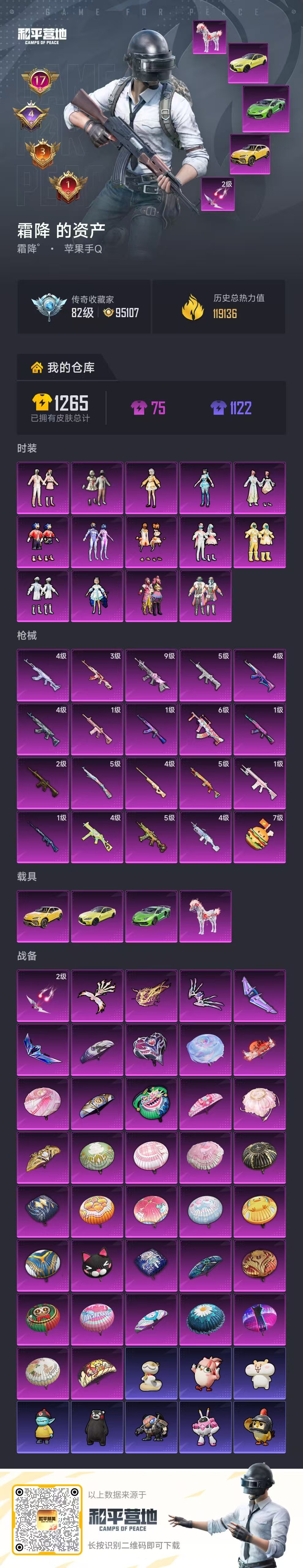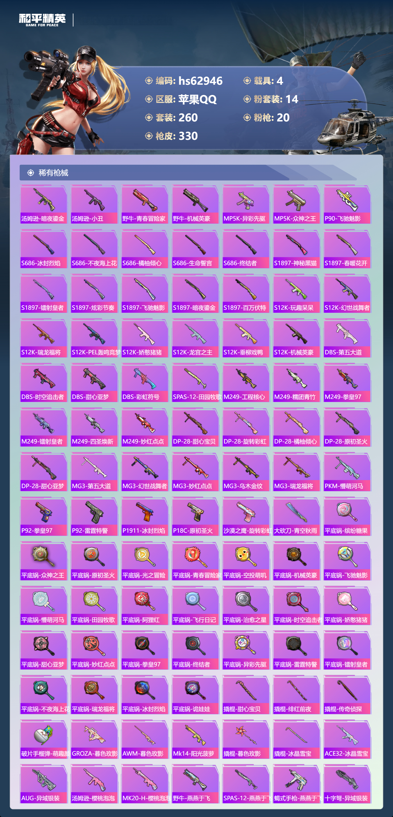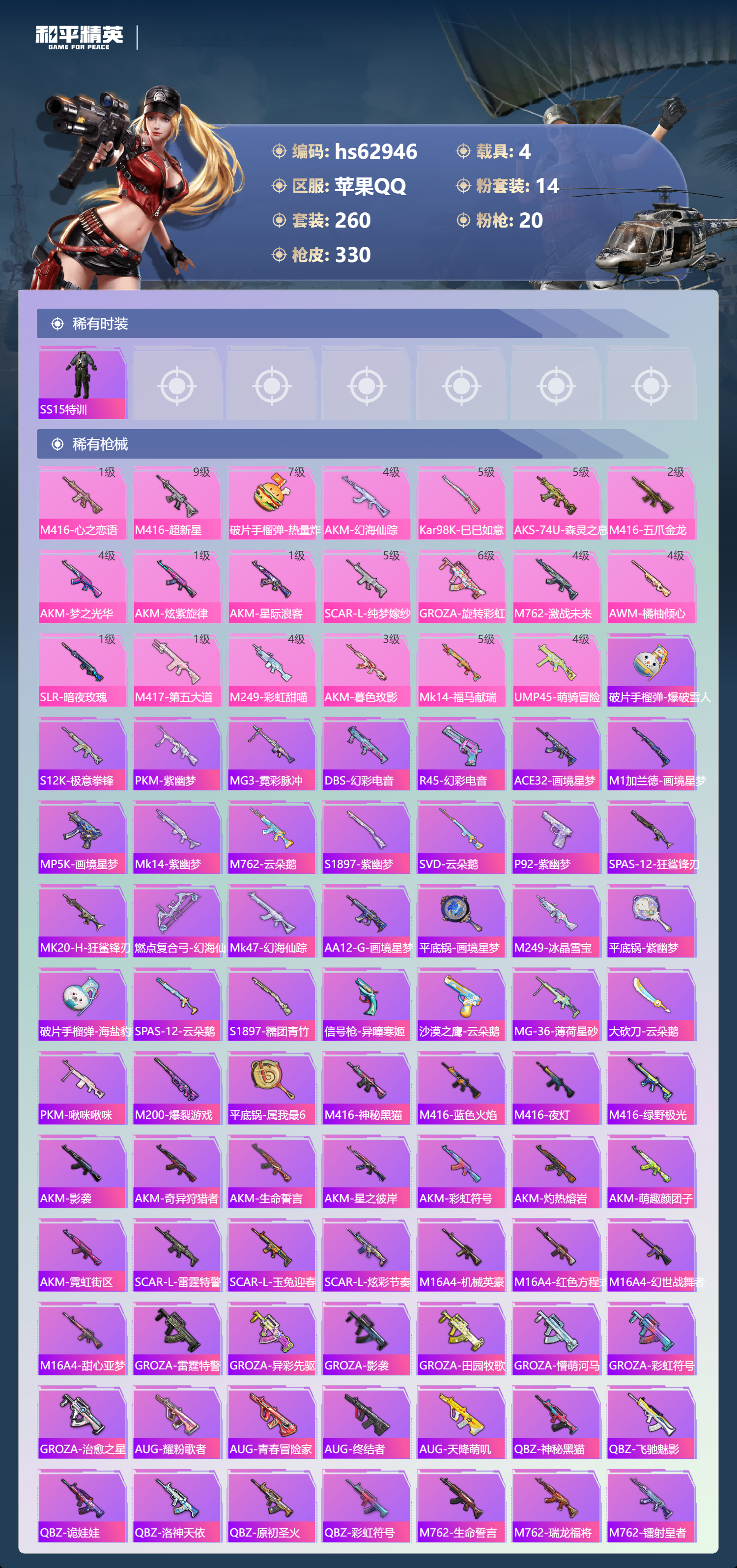 hs62946 苹果手Q-17王牌印记-14粉装-20特效枪-4载具-热力值-260套装-330枪皮-4卓越印记-3传奇印记