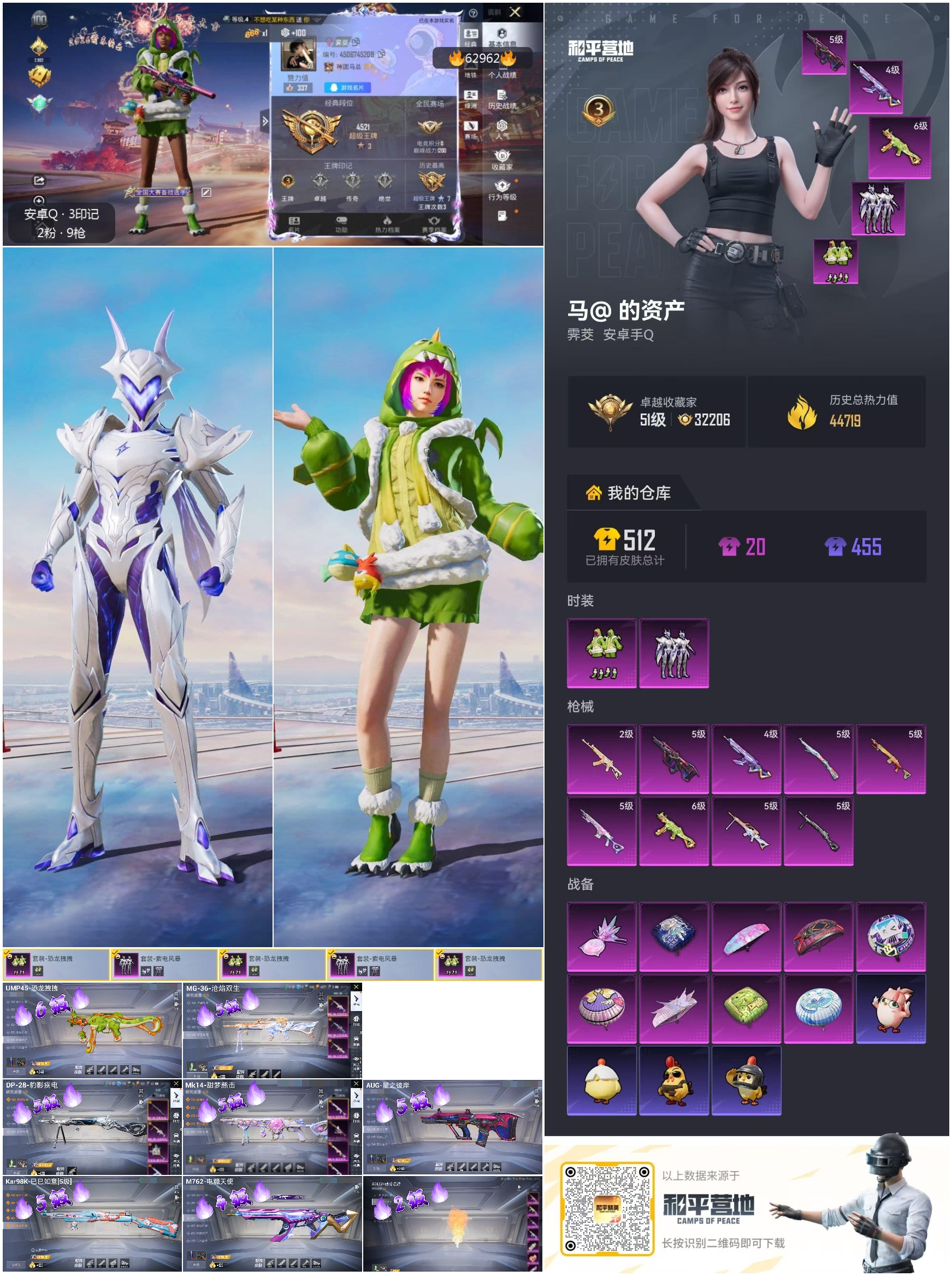 【9特效枪】Mk14-福马献瑞/5级,UMP45-恐龙拽拽/6级,M762-电糖天使/4级,Mk14-甜梦熊击/5级,AUG-星之彼岸/5级,ACE32-萌骑漫游/2级,Kar98K-巳巳如意/5级,MG-36-沧焰双生/5级,DP-28-豹影疾电/5级