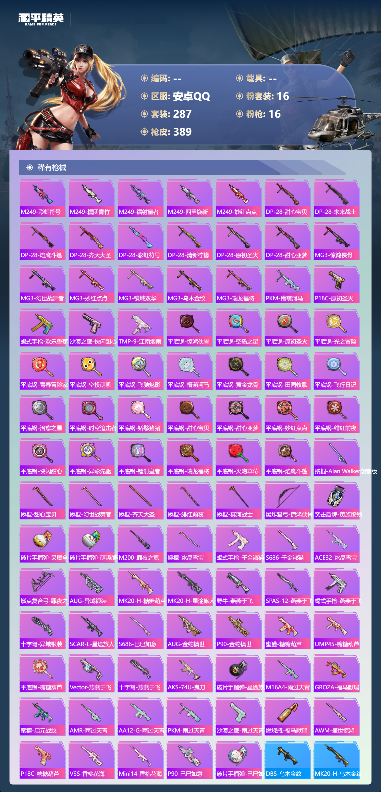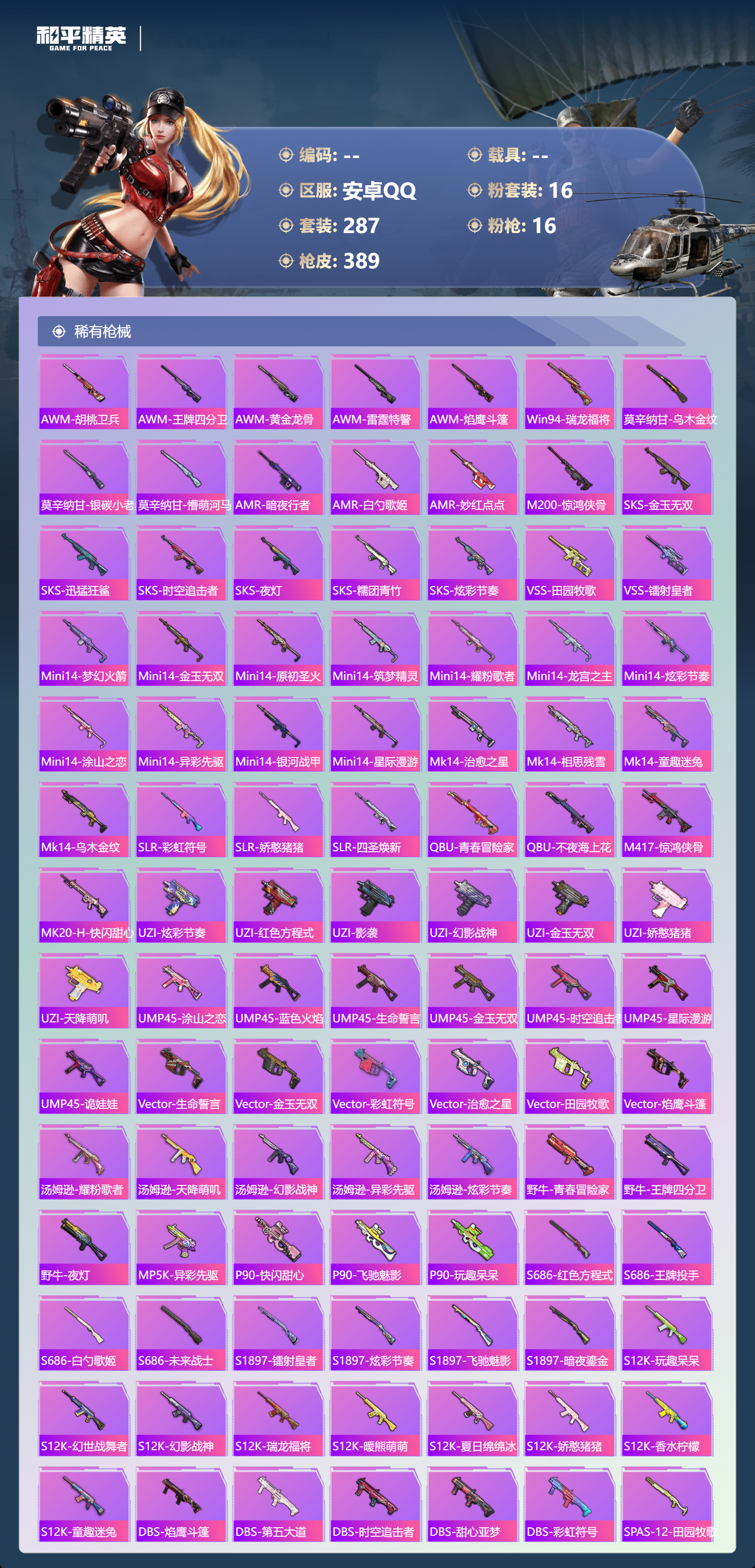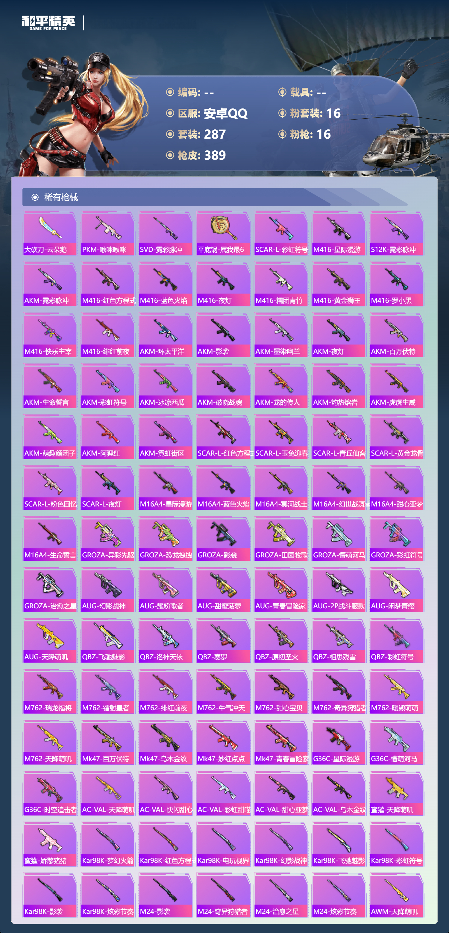 hs62960 安卓手Q-24王牌印记-有战神框-16粉装-16特效枪-热力值-287套装-389枪皮-5卓越印记-4传奇印记