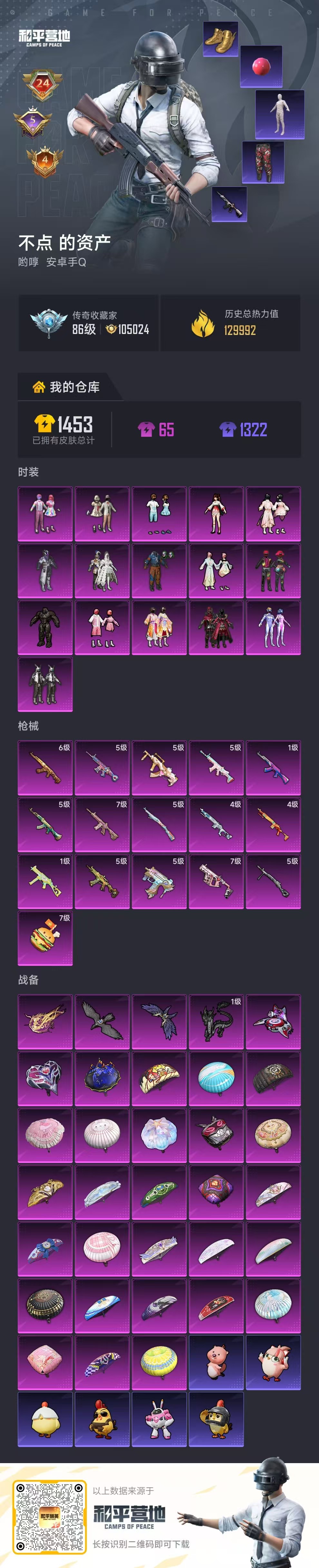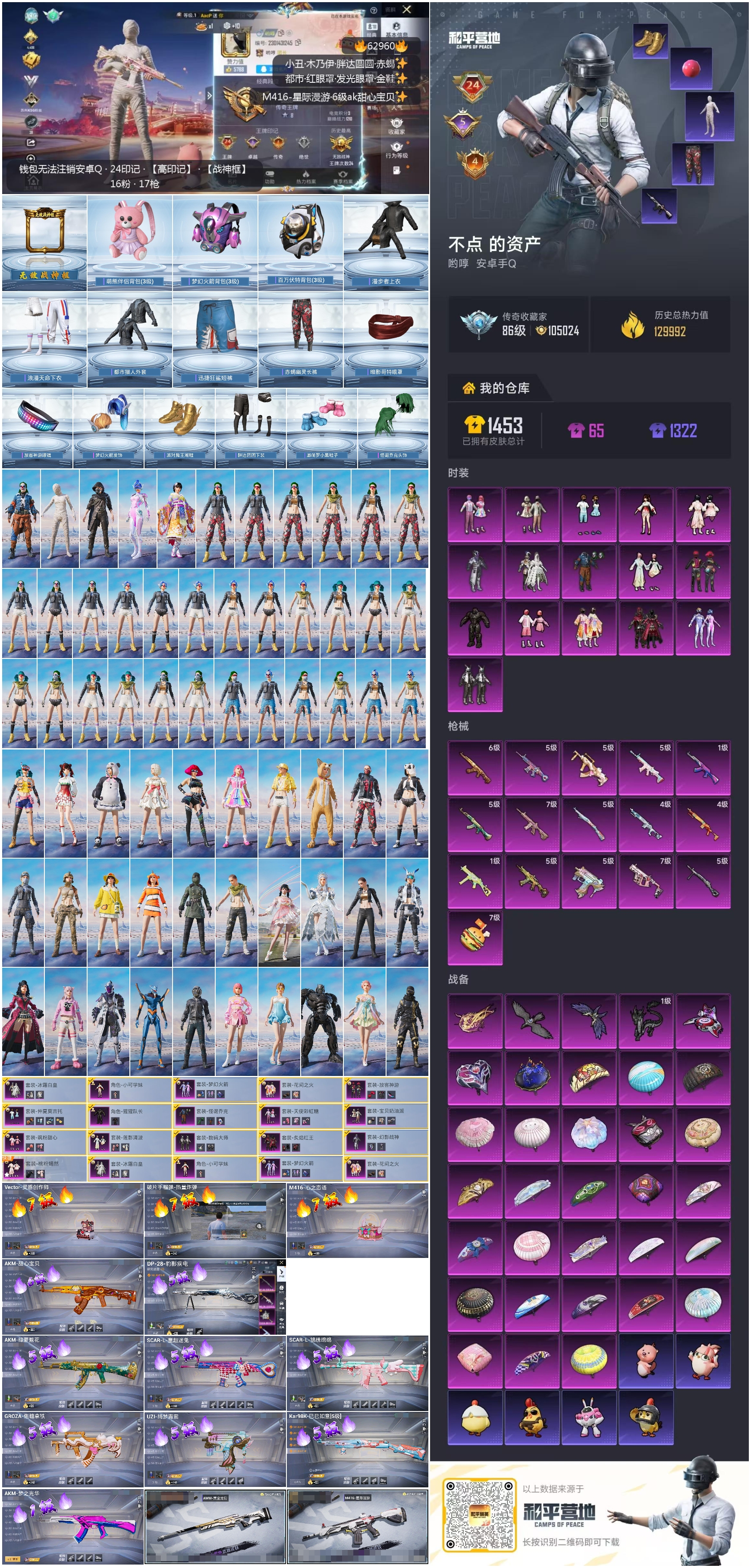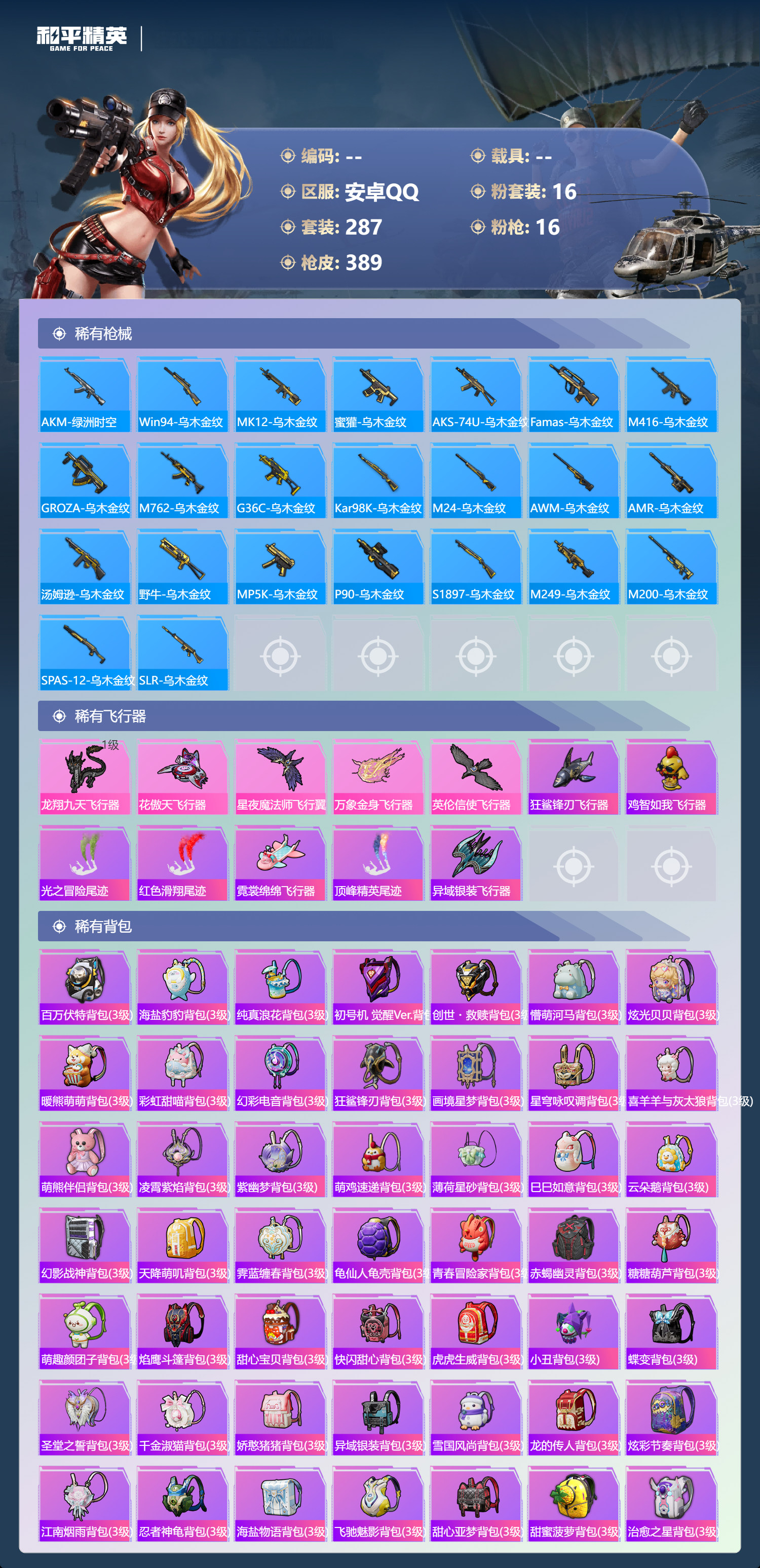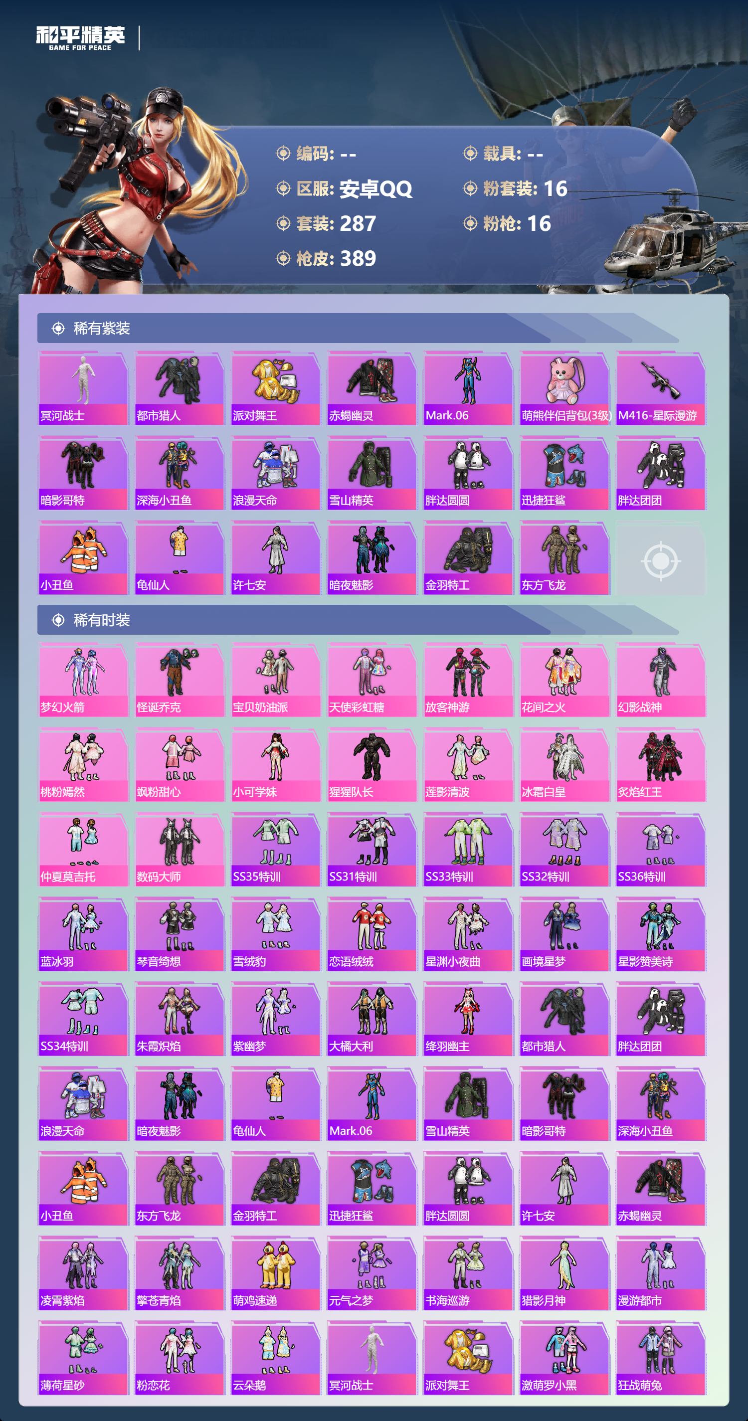 hs62960 安卓手Q-24王牌印记-有战神框-16粉装-16特效枪-热力值-287套装-389枪皮-5卓越印记-4传奇印记