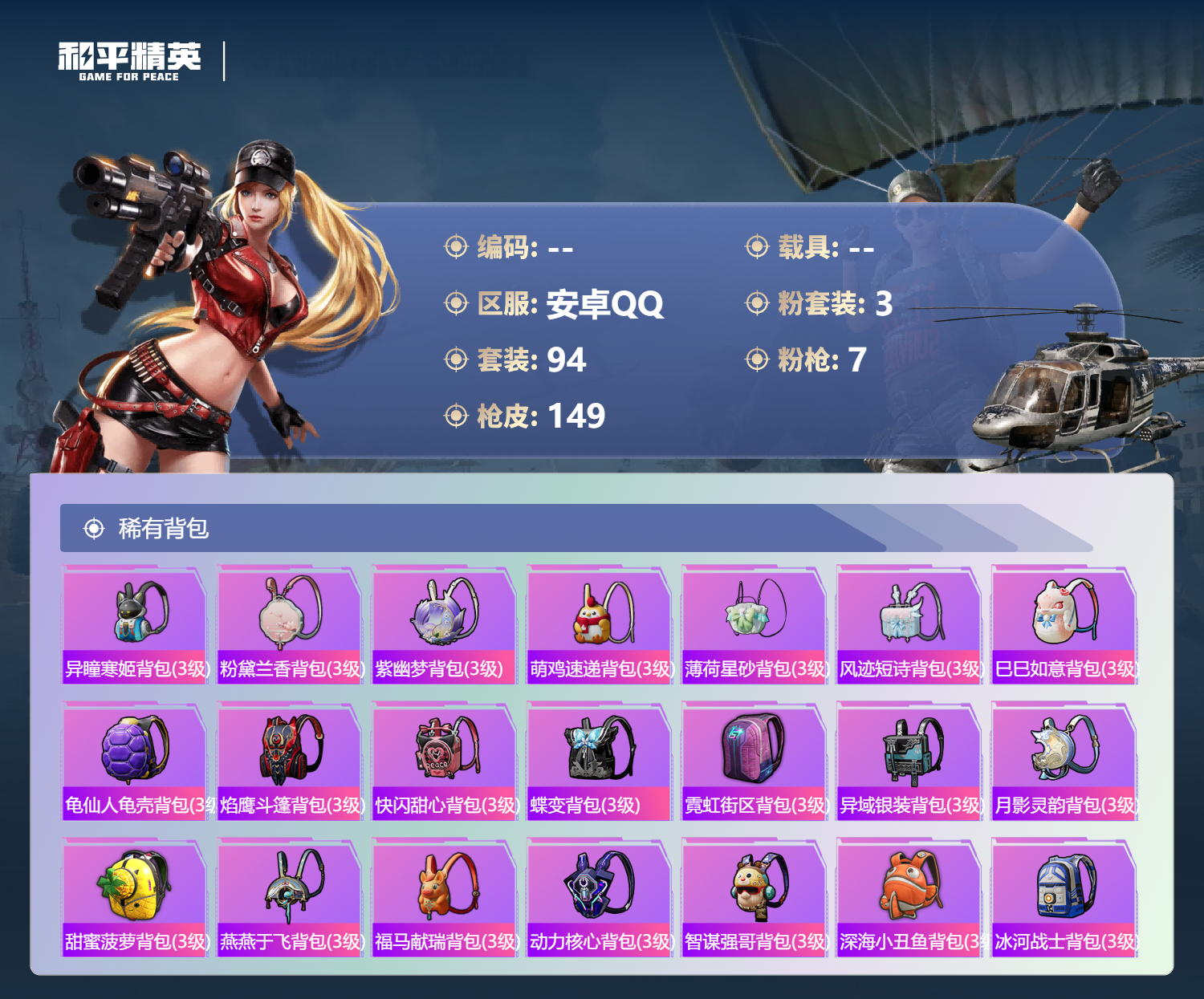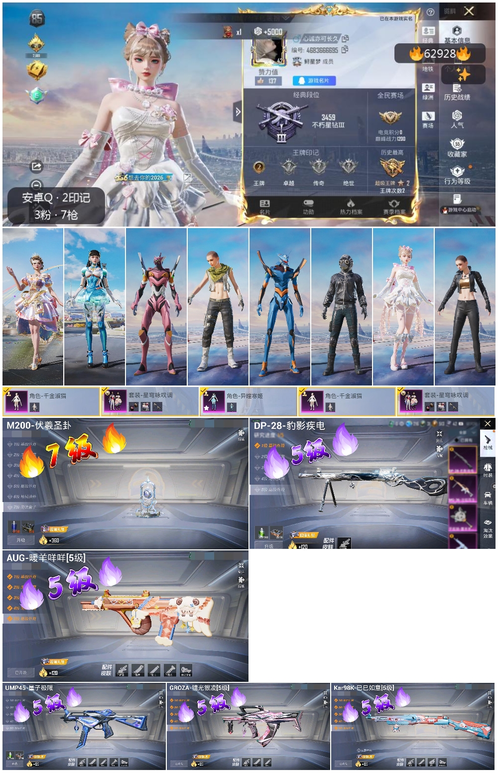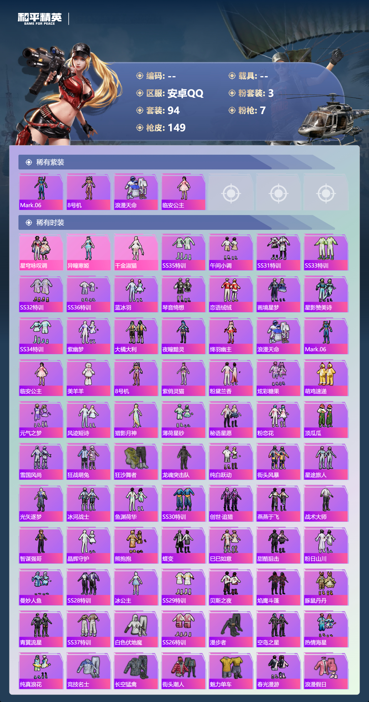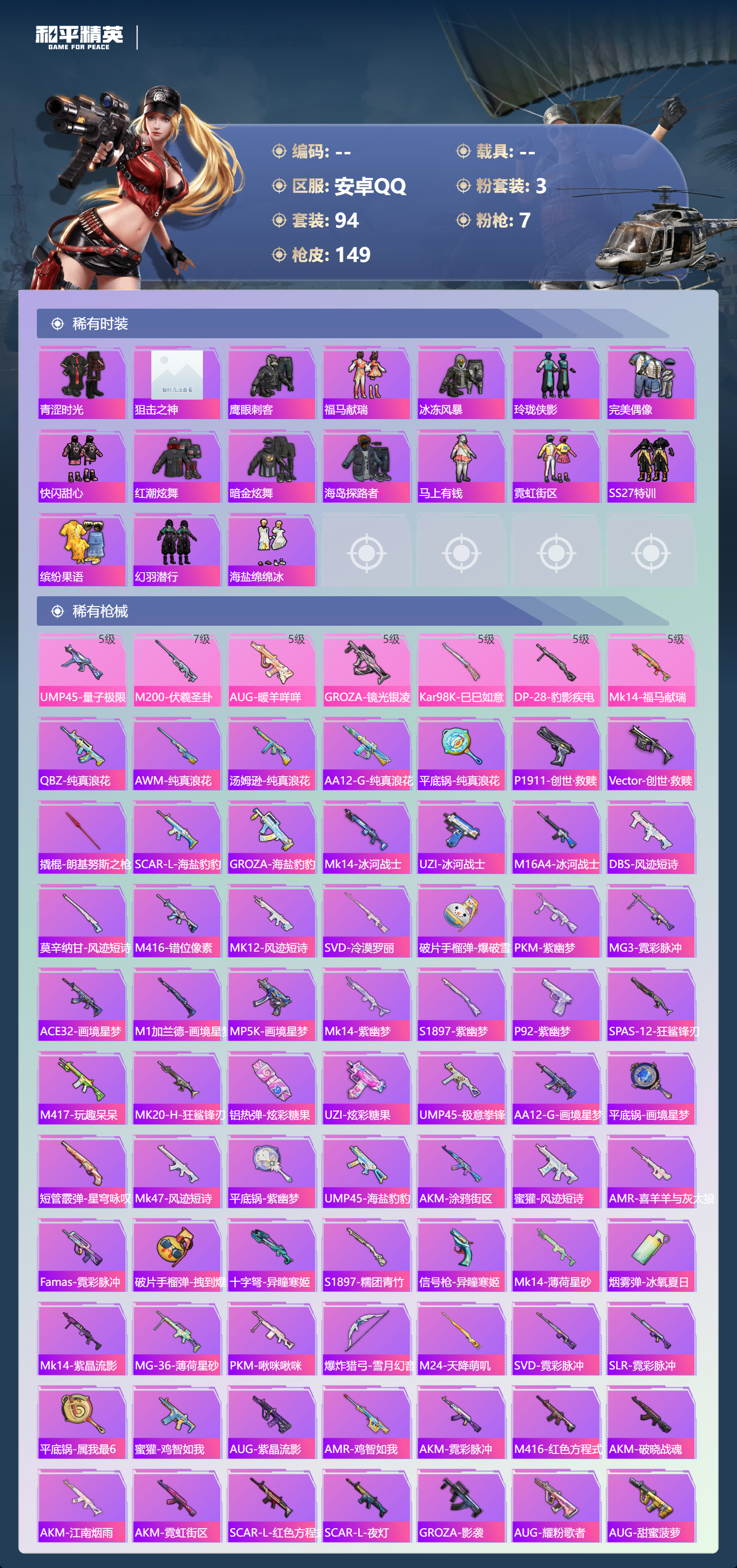 hs62928 安卓手Q-2王牌印记-3粉装-7特效枪-43315热力值-94套装-149枪皮