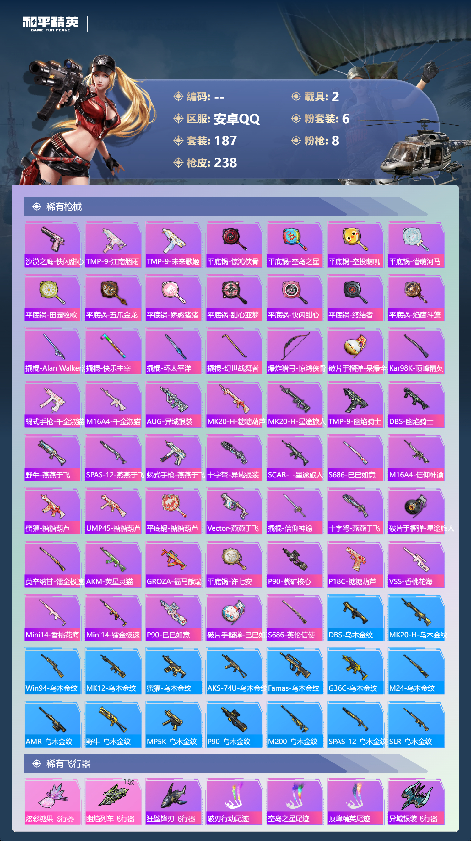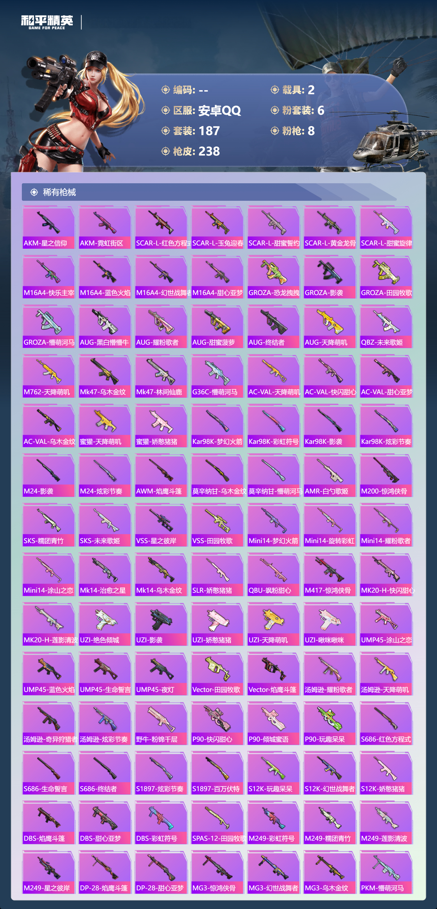 hs62975 安卓手Q-16王牌印记-6粉装-8特效枪-2载具-81078热力值-187套装-238枪皮