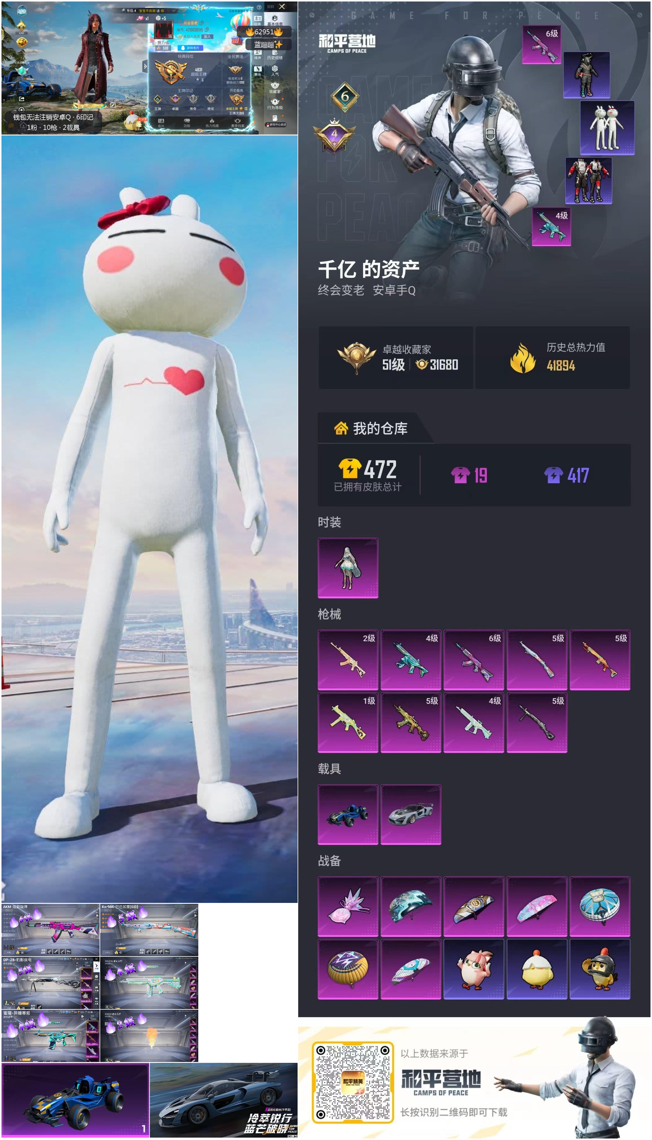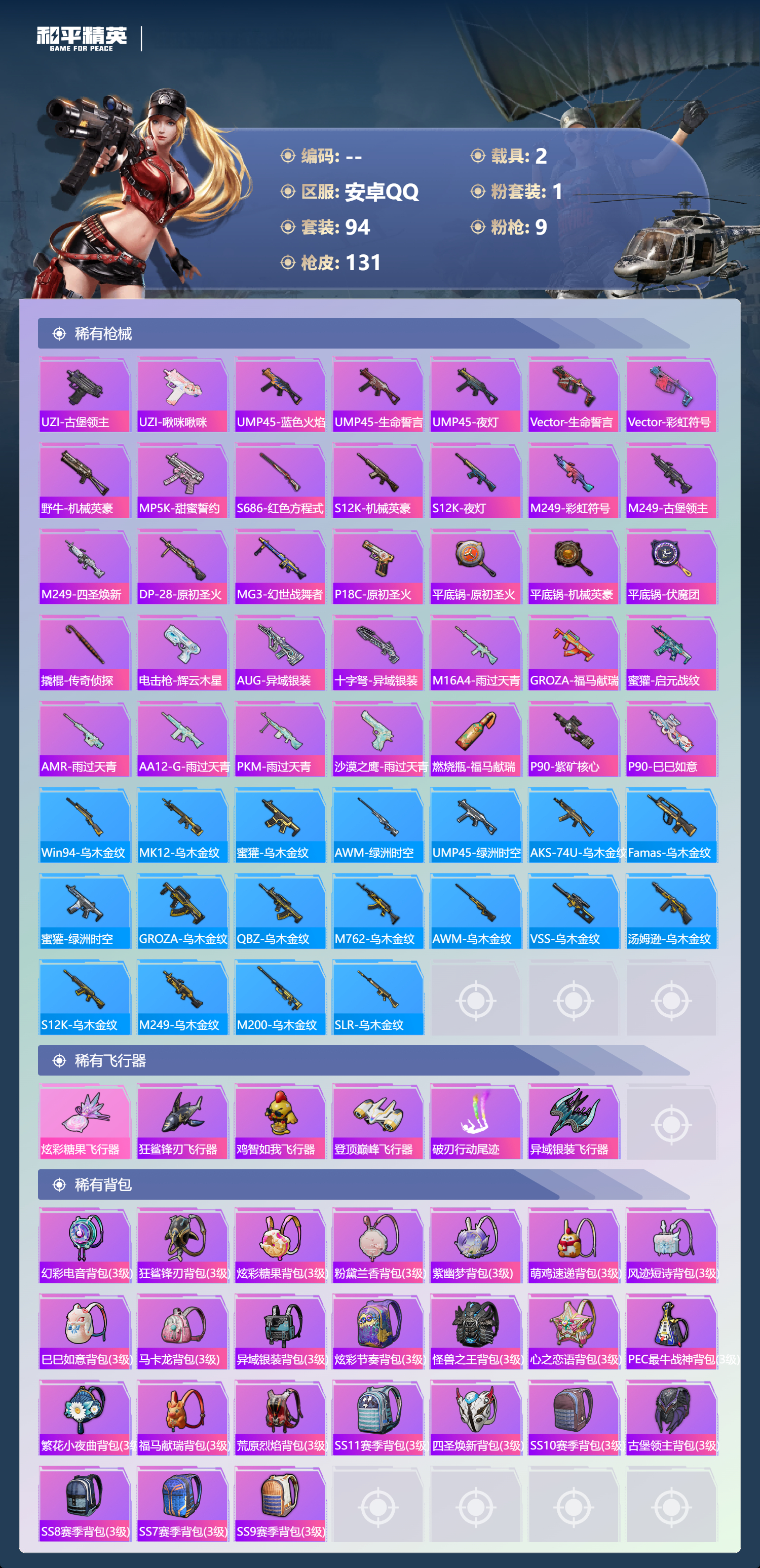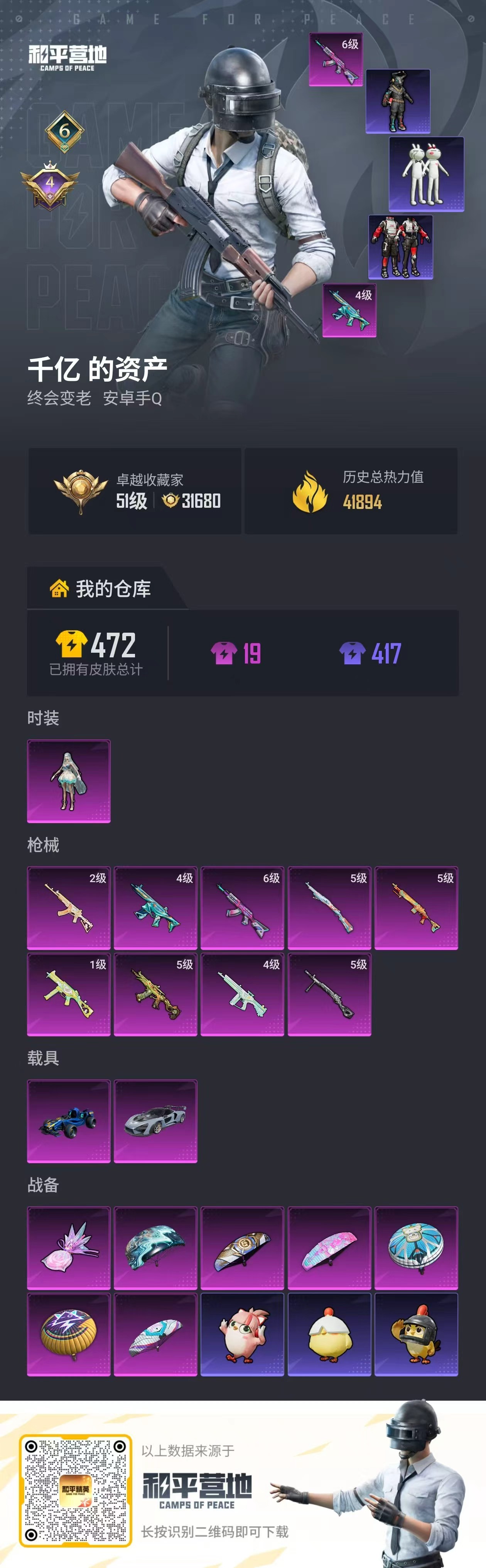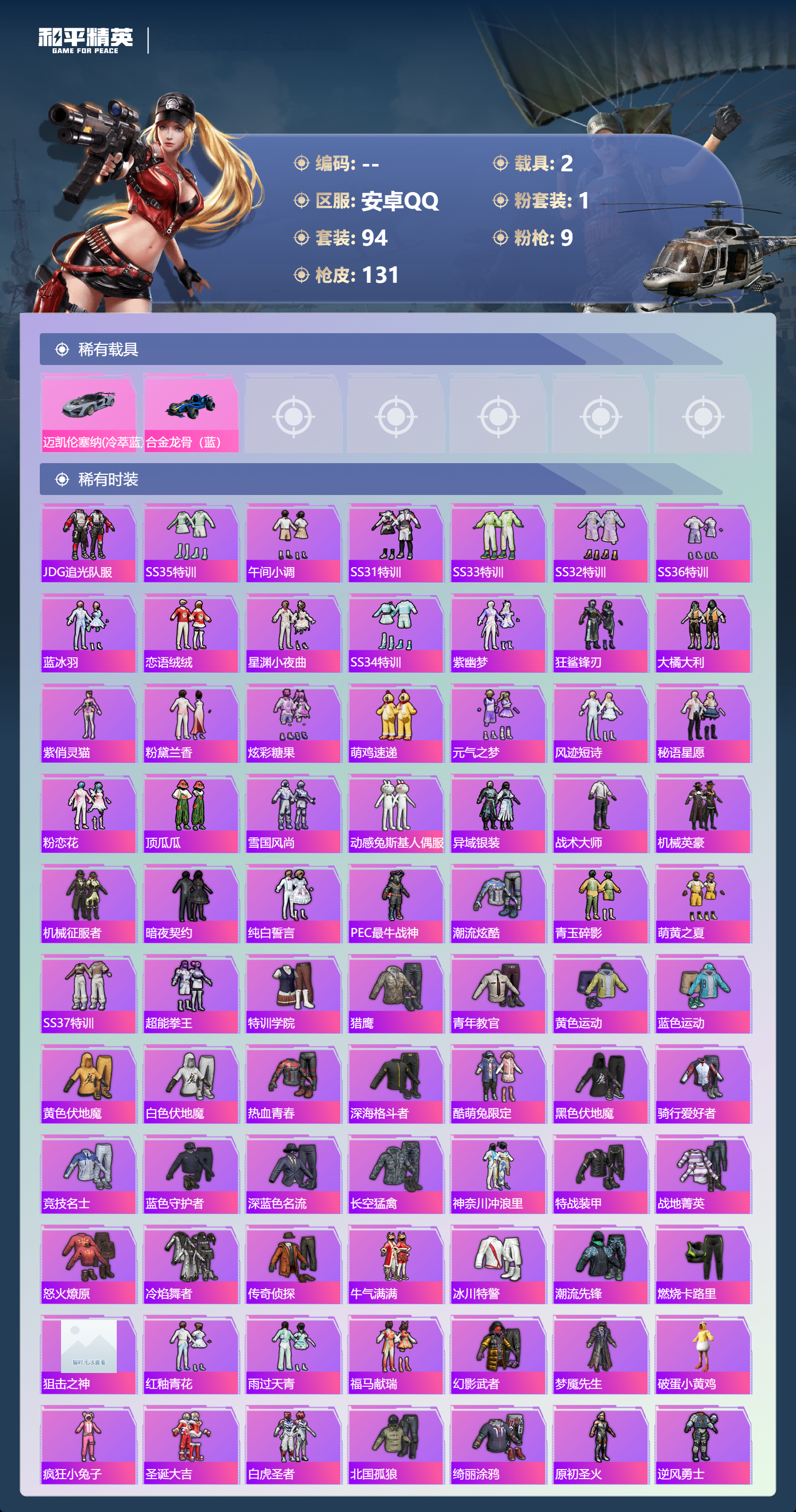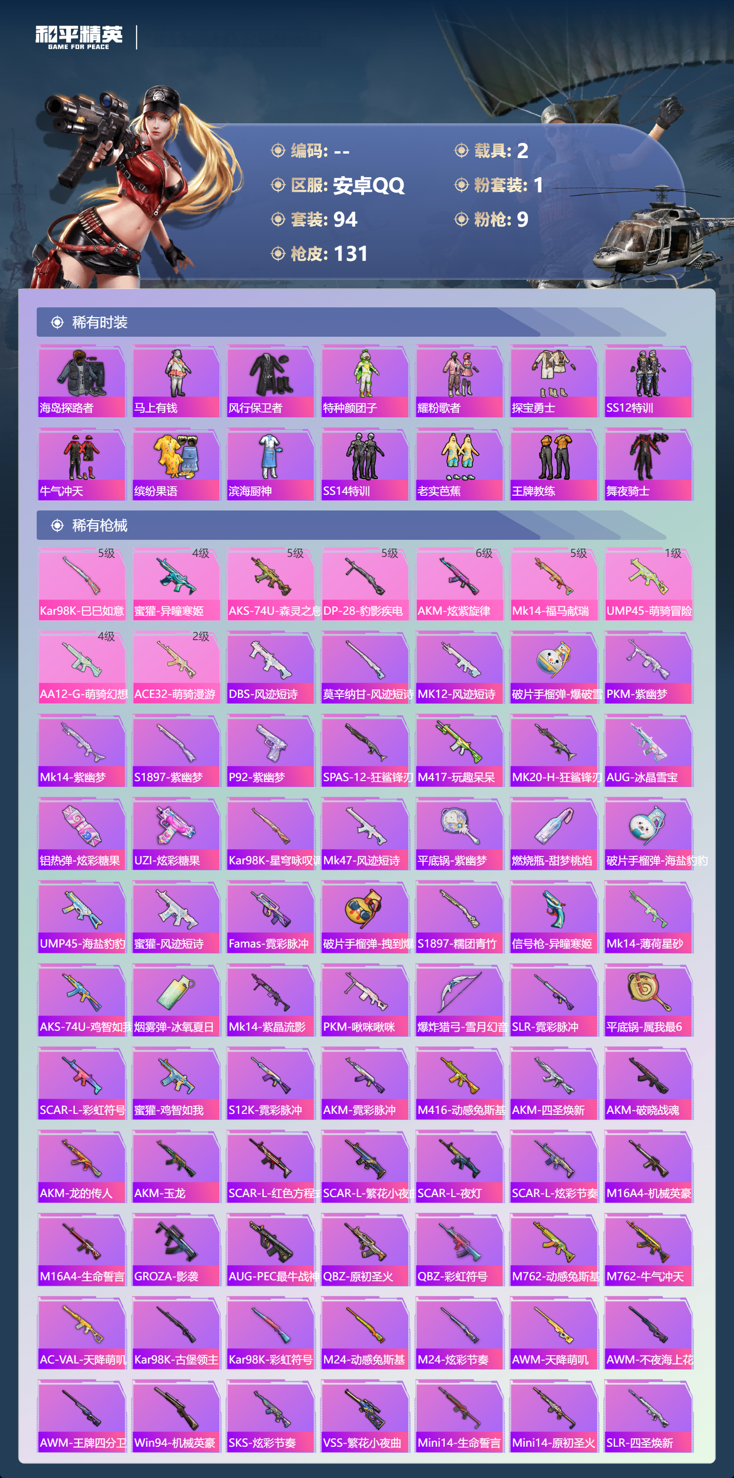 hs62951 安卓手Q-6王牌印记-1粉装-9特效枪-2载具-41894热力值-94套装-131枪皮-4卓越印记