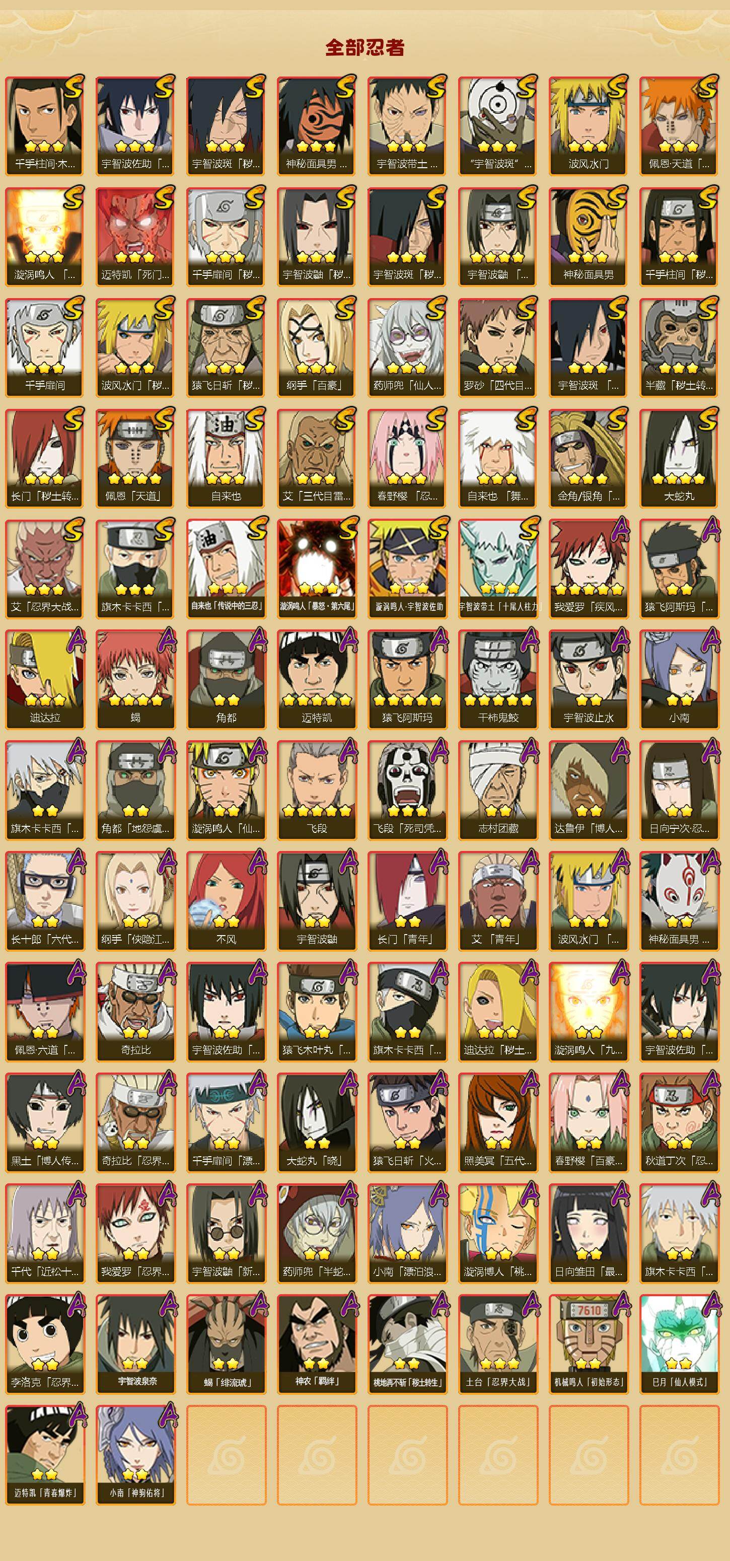 【S级忍者】:长门「秽土转生」(3星),半藏「秽土转生」(3星),金角·银角「秽土转生」(3星),猿飞日斩「秽土转生」(3星),波风水门「秽土转生」(3星),千手扉间「秽土转生」(3星),千手柱间「秽土转生」(3星),宇智波鼬「秽土转生」(3星),宇智波斑「秽土转生」(3星),宇智波斑「秽土转生·解」(3星),春野樱「忍界大战」(3星),宇智波带土「忍界大战」(3