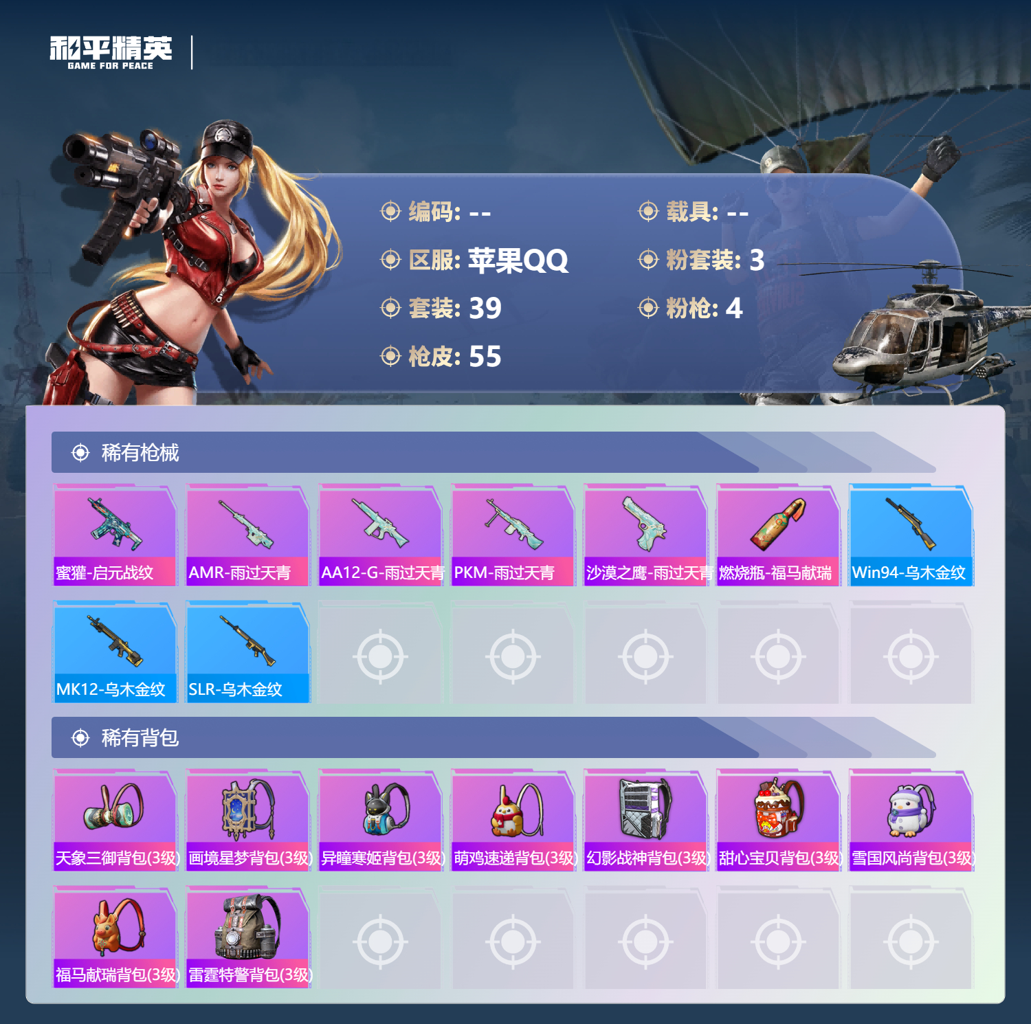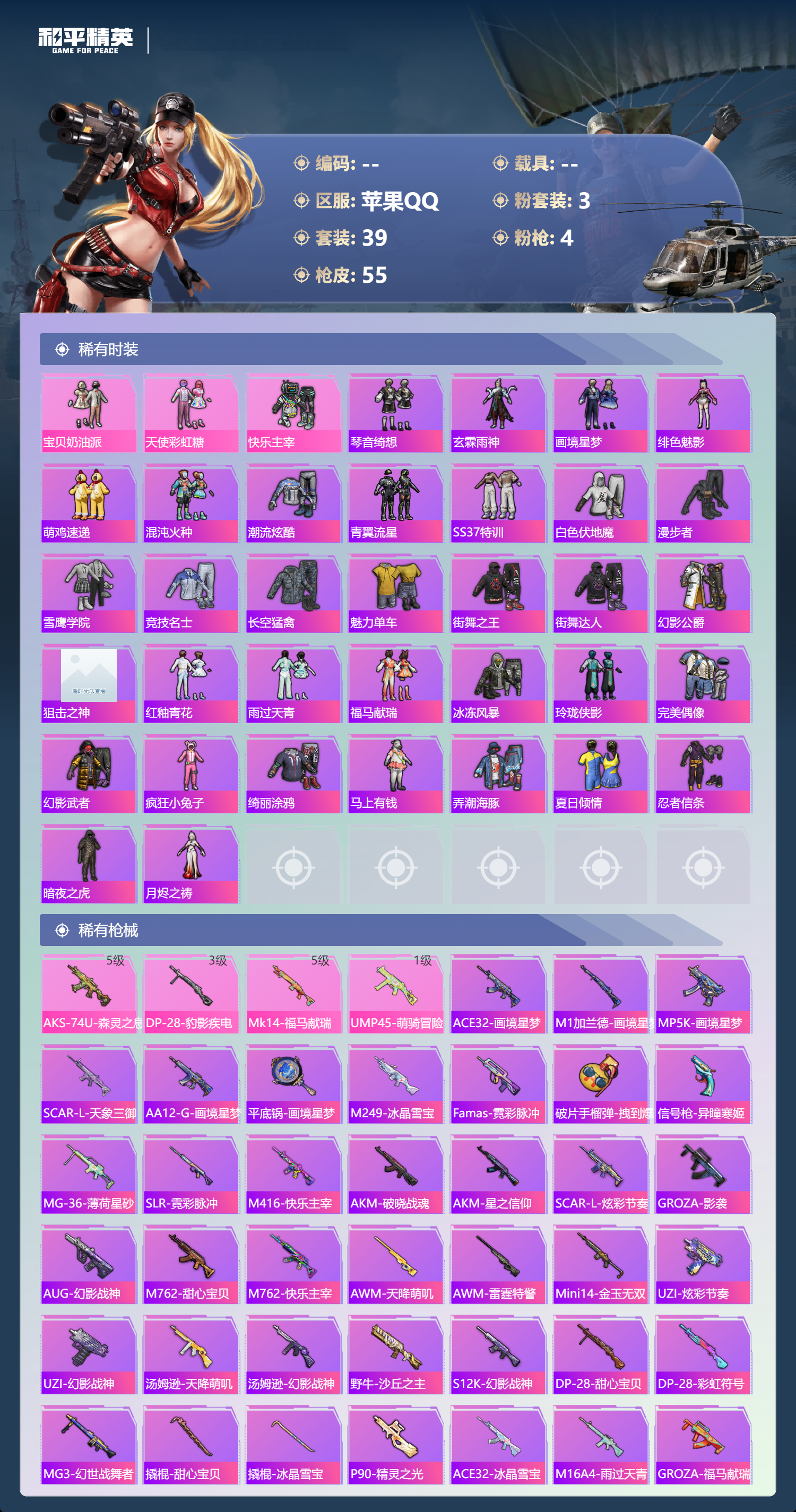 hs63038 苹果手Q-0王牌印记-3粉装-4特效枪-14306热力值-39套装-55枪皮