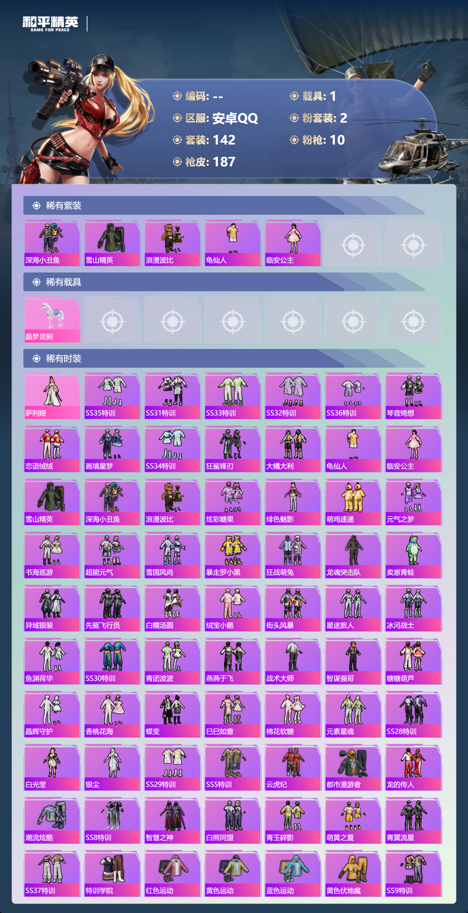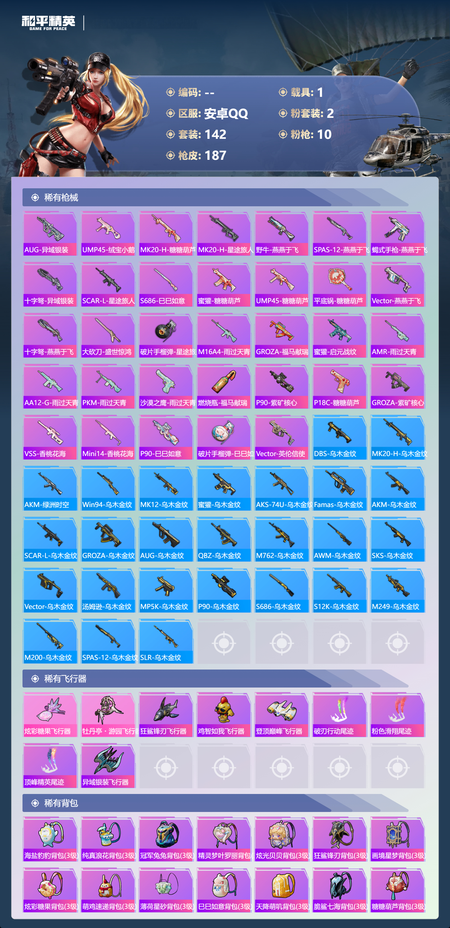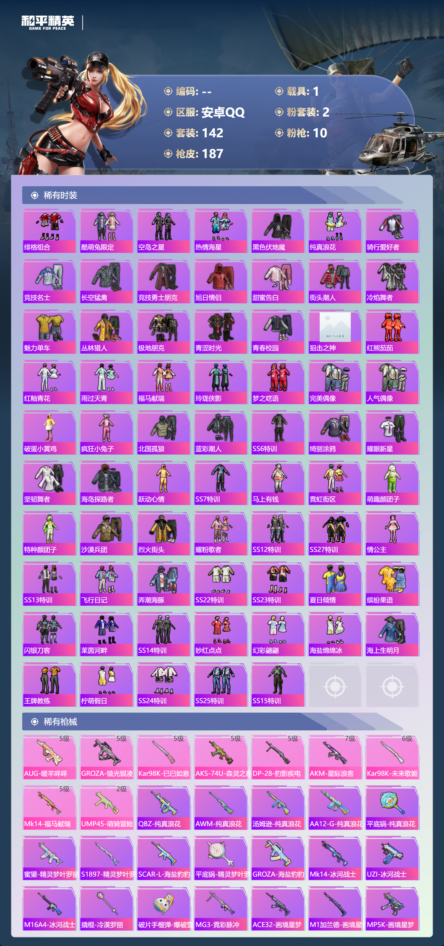 hs63058 安卓手Q-7王牌印记-2粉装-10特效枪-1载具-59341热力值-142套装-187枪皮-3卓越印记-2传奇印记