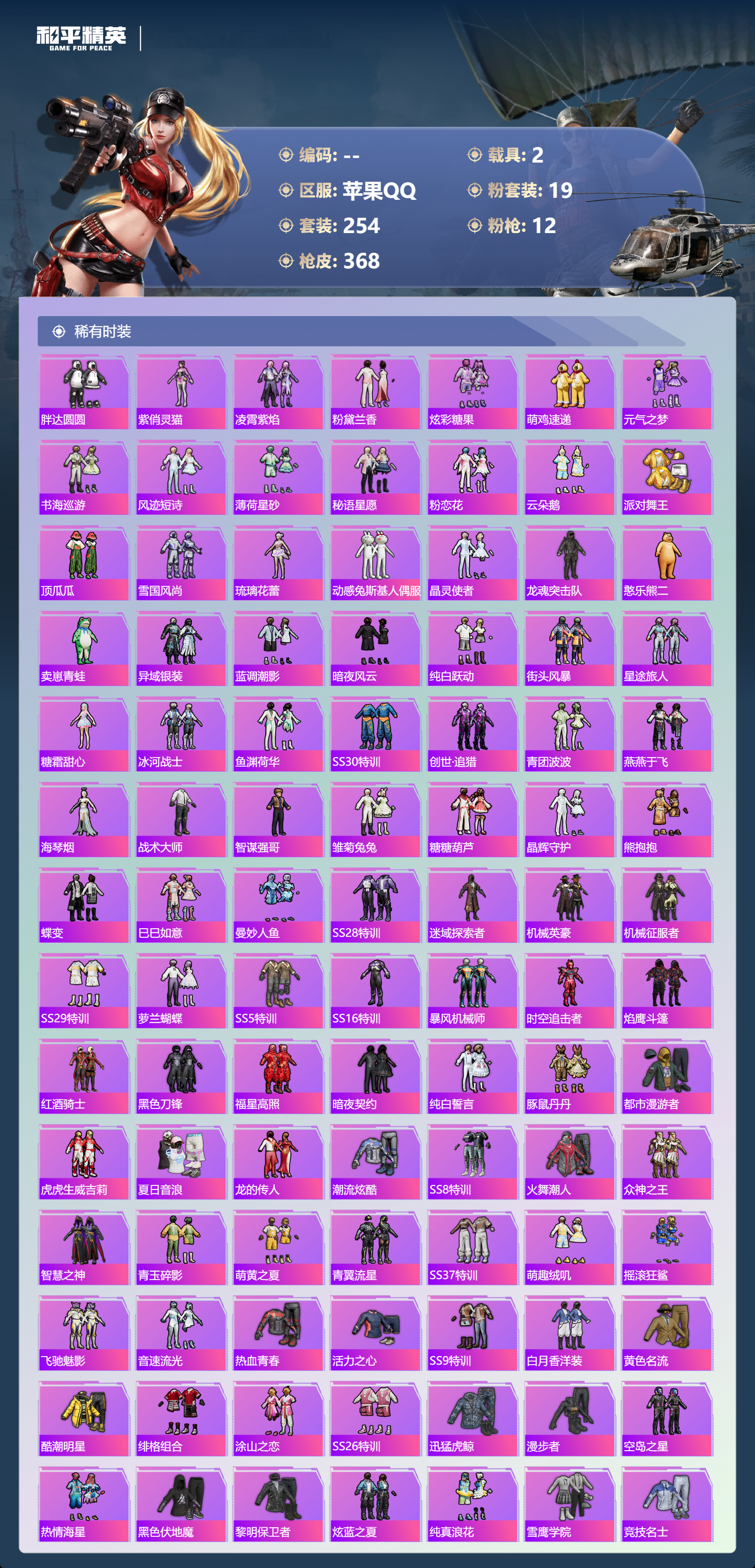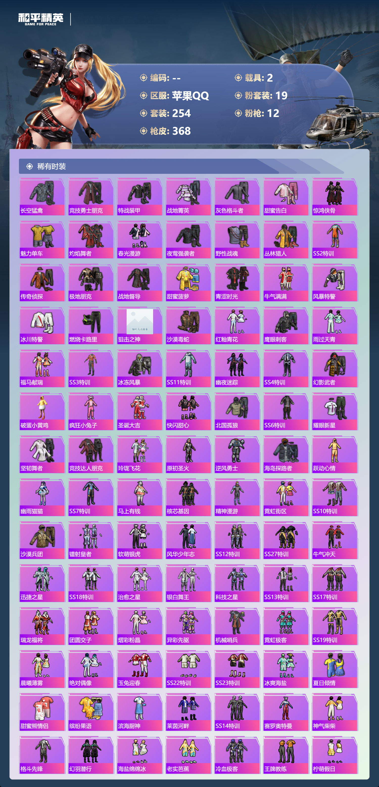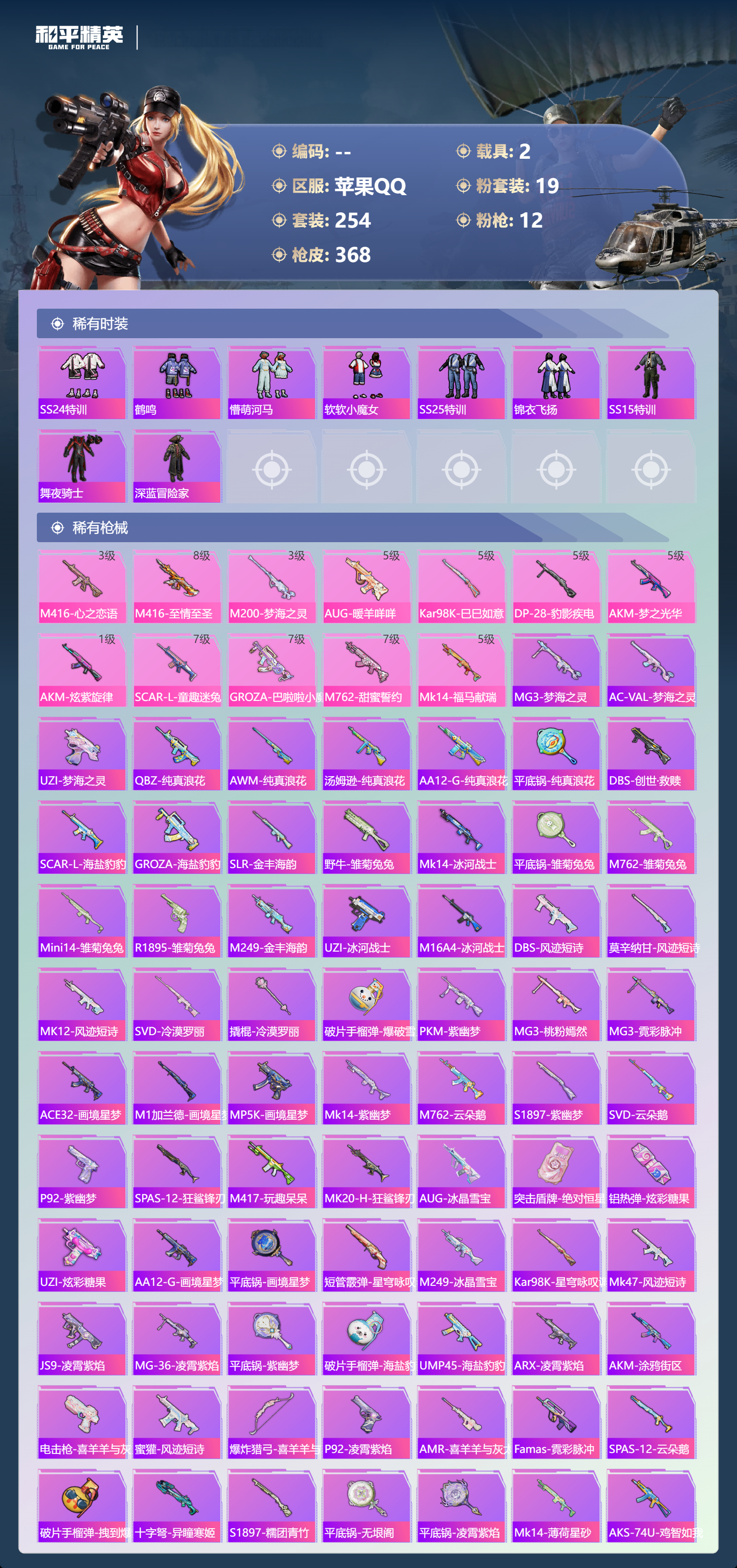 hs63057 苹果手Q-30王牌印记-1红装-19粉装-12特效枪-2载具-热力值-254套装-368枪皮-5卓越印记-2传奇印记