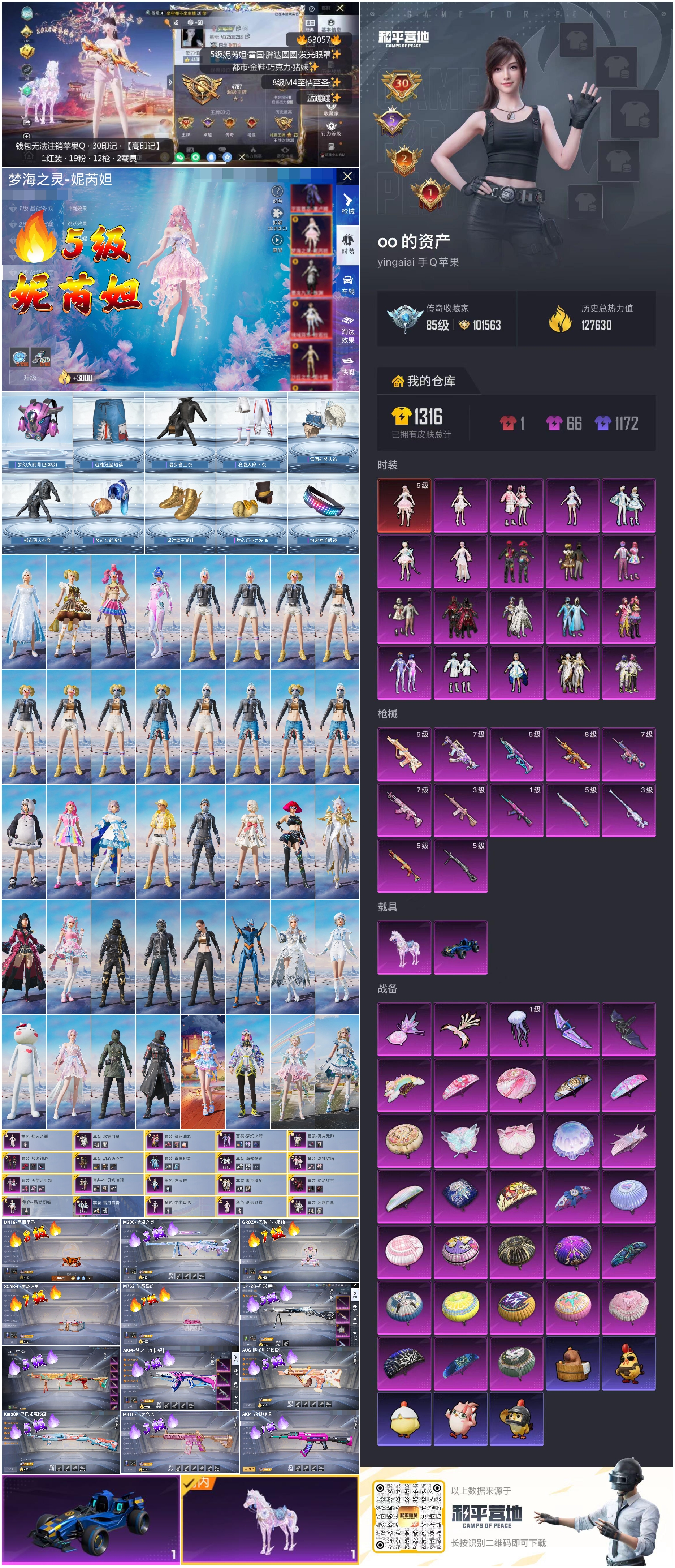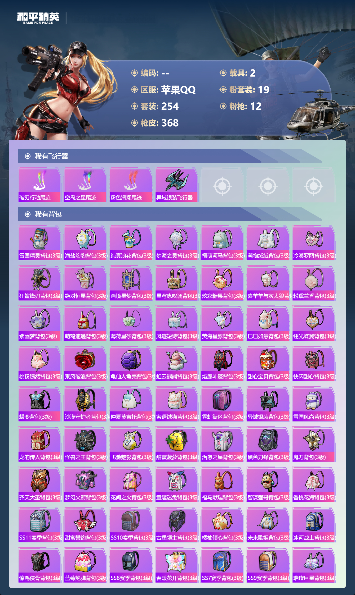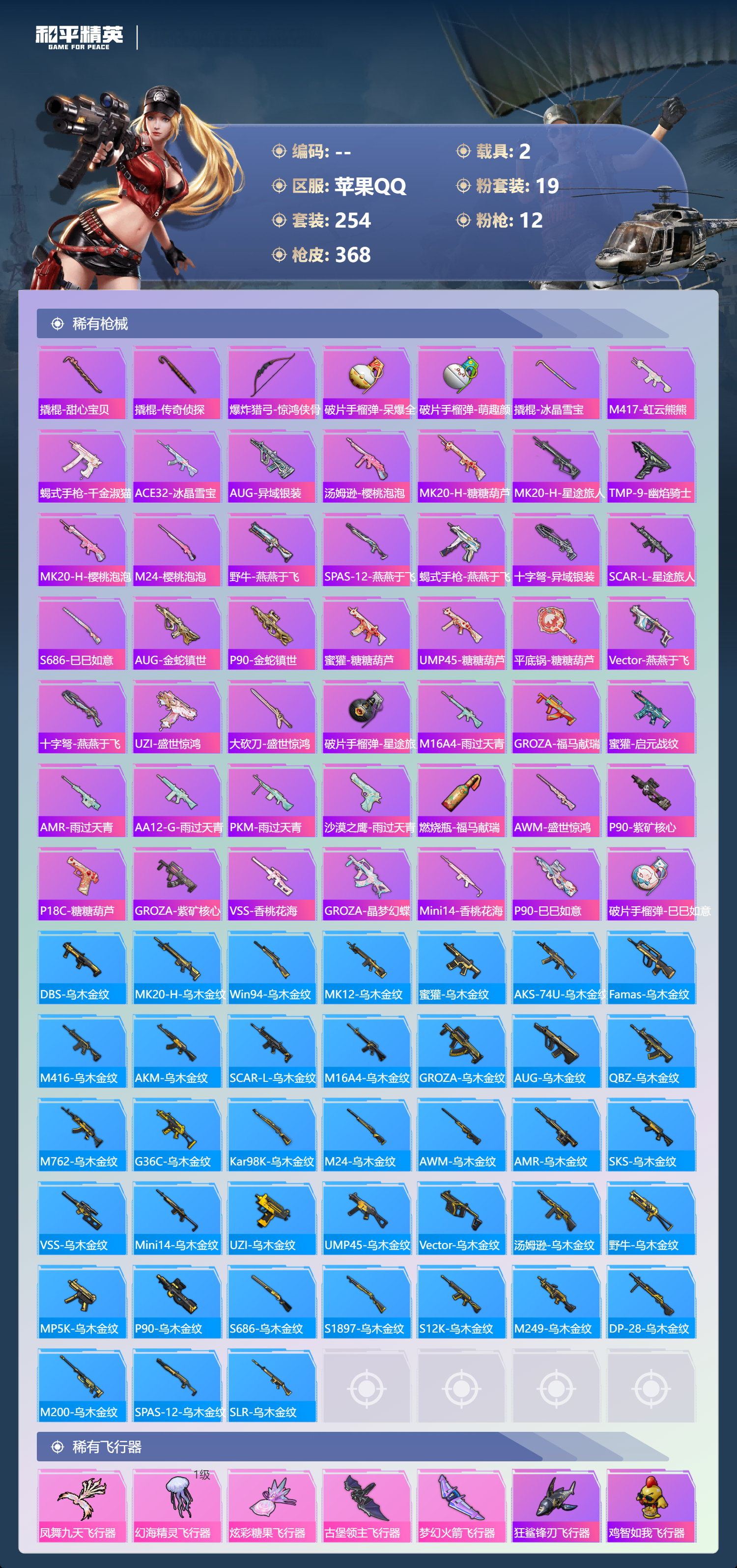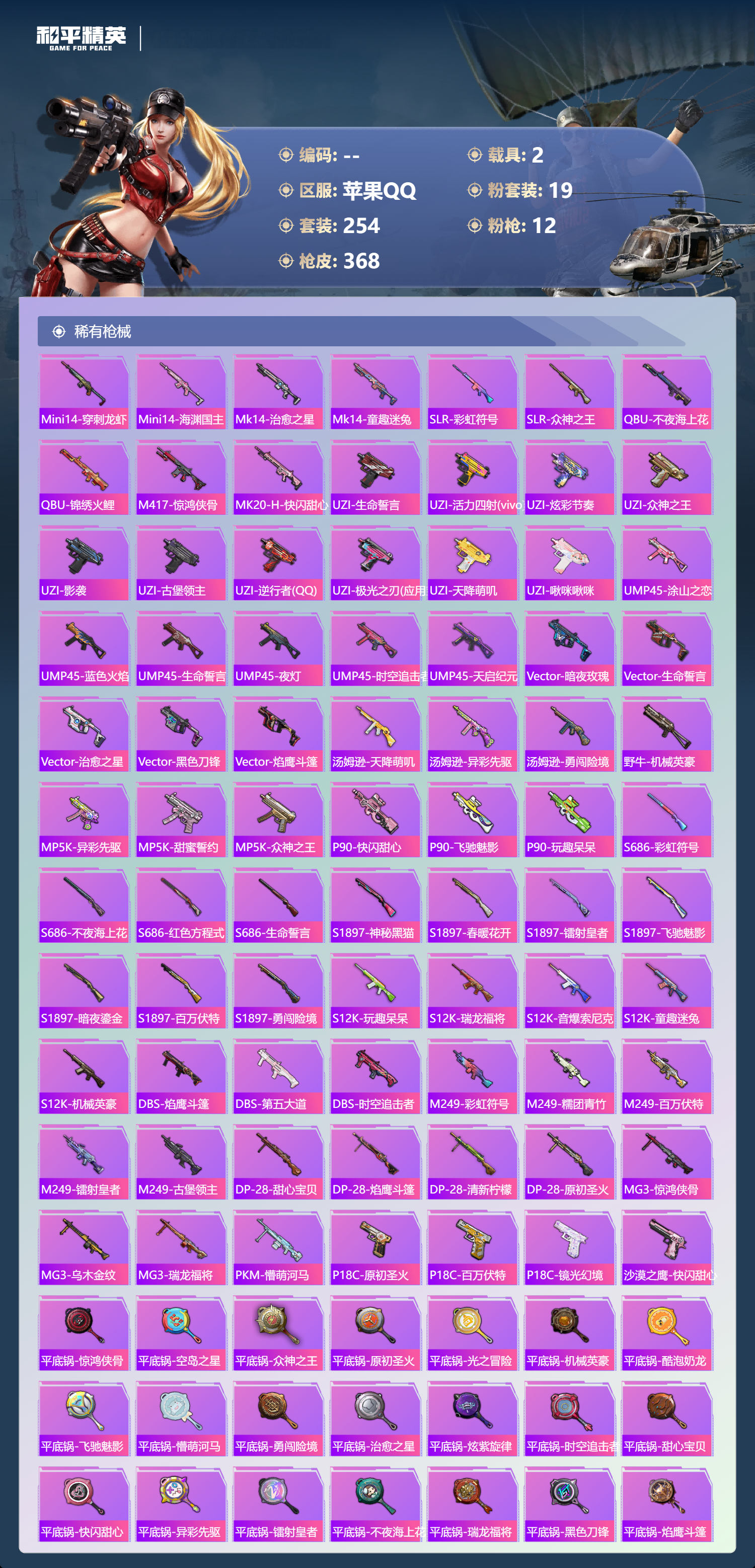 hs63057 苹果手Q-30王牌印记-1红装-19粉装-12特效枪-2载具-热力值-254套装-368枪皮-5卓越印记-2传奇印记