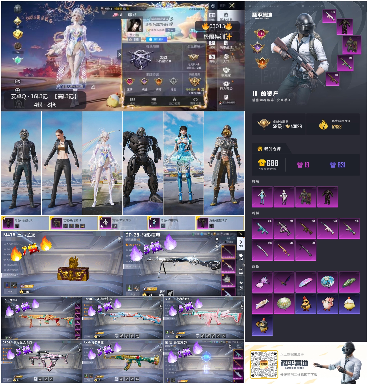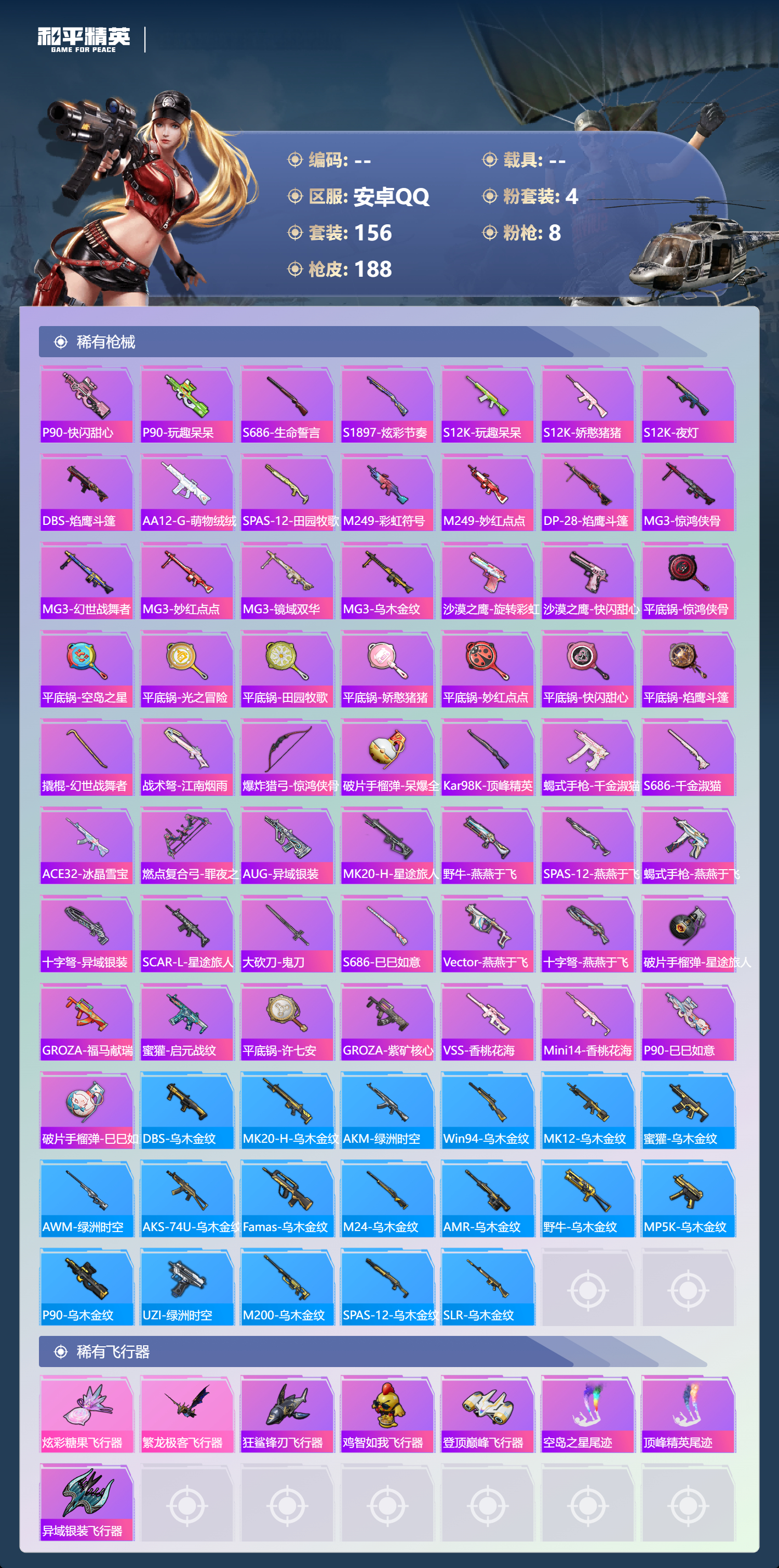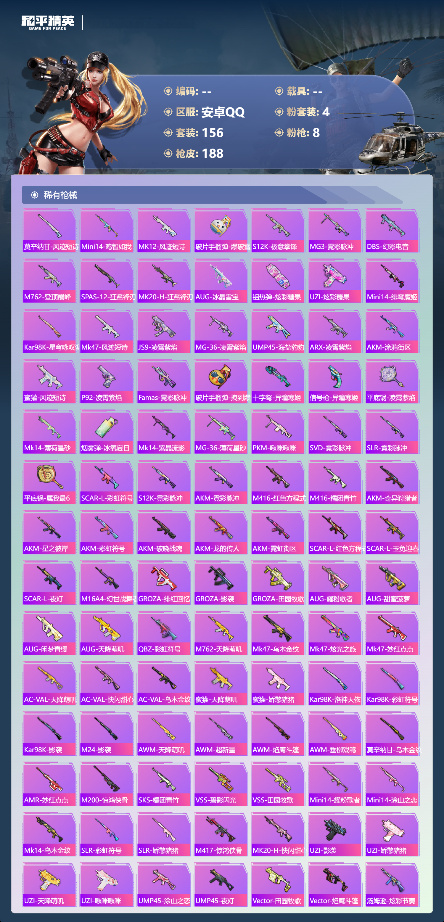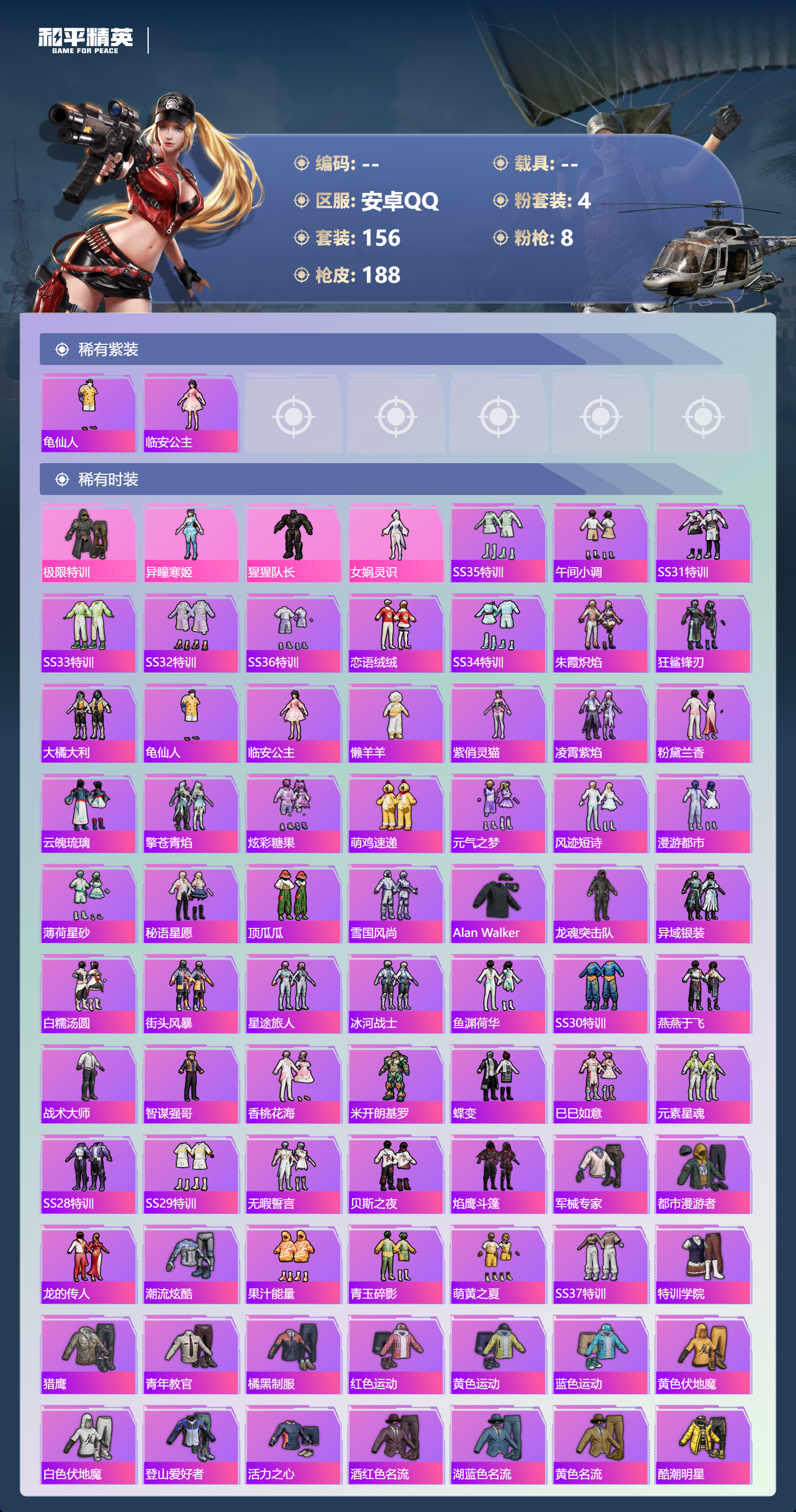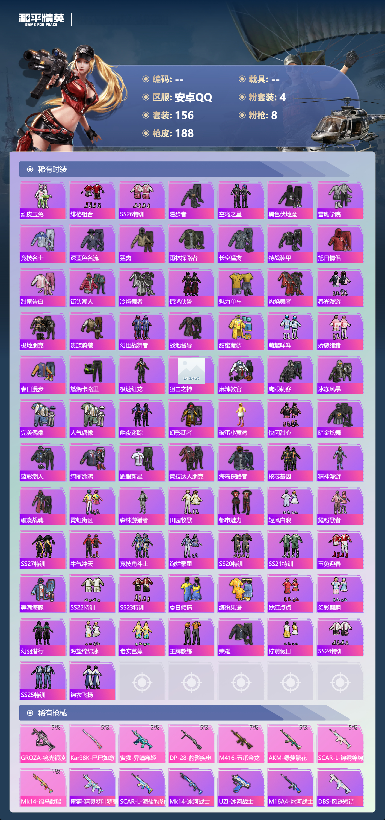 hs63013安卓手Q-16王牌印记-4粉装-8特效枪-57183热力值-156套装-188枪皮-6卓越印记-1传奇印记