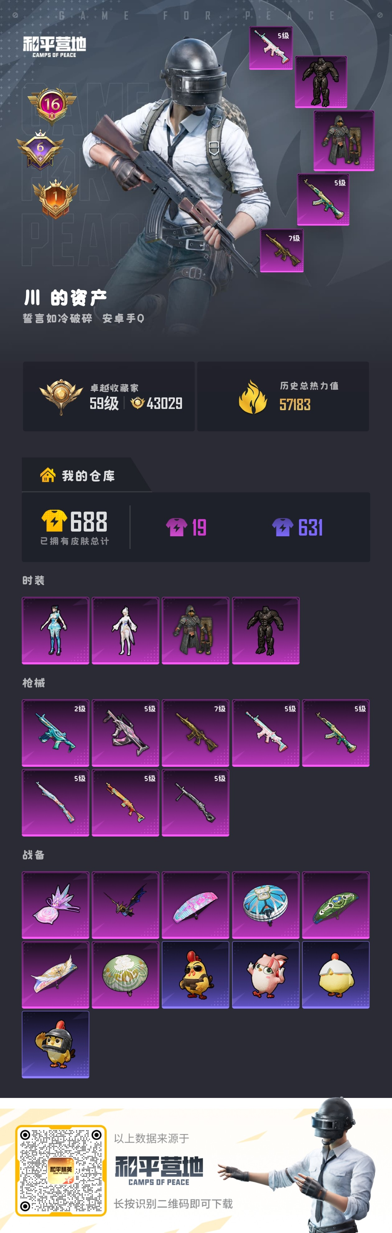 16王牌印记-4粉装-8特效枪-57183热力值-156套装-188枪皮-6卓越印记-1传奇印记