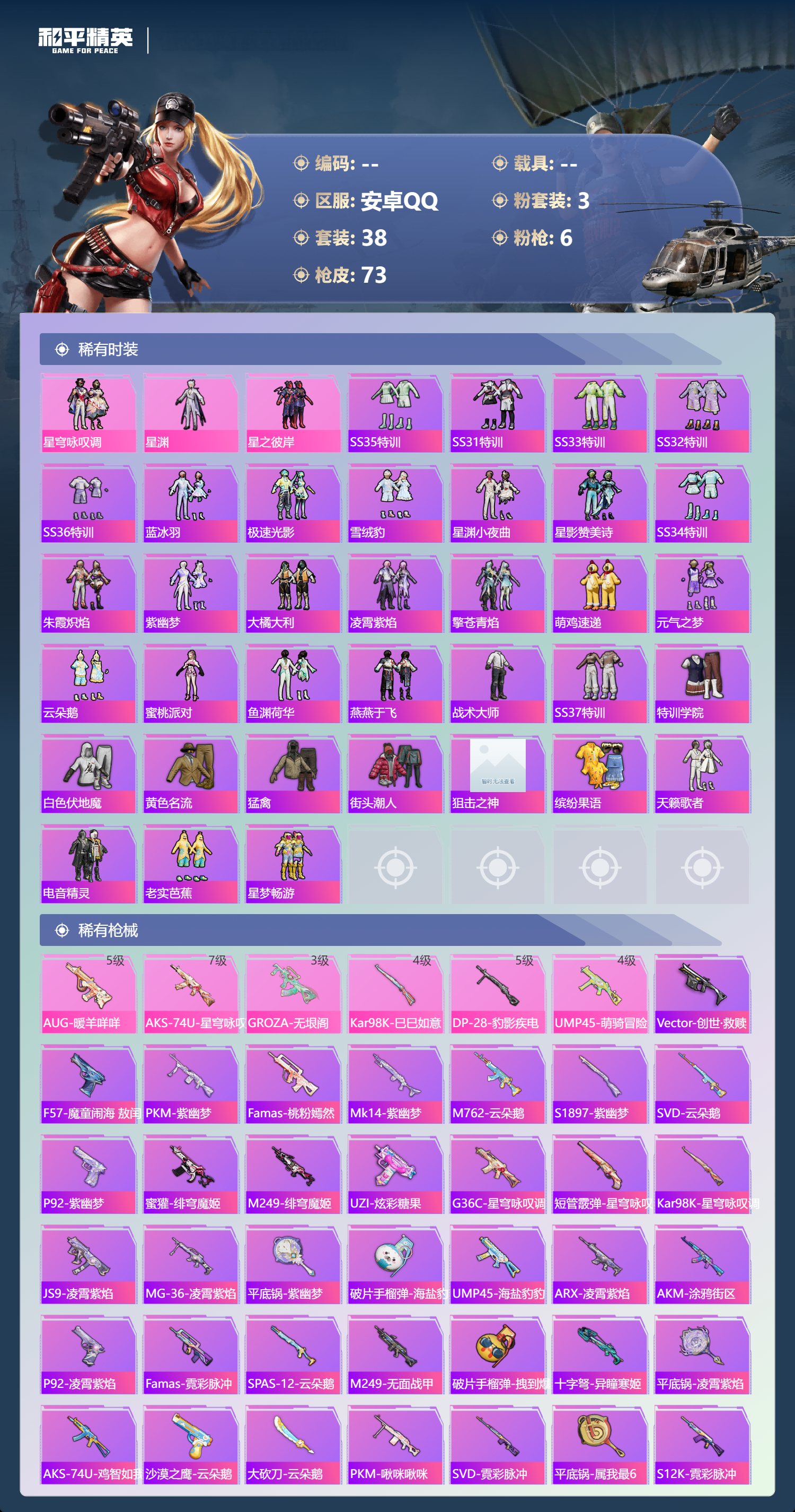 安卓手Q-2王牌印记-3粉装-6特效枪-22385热力值-38套