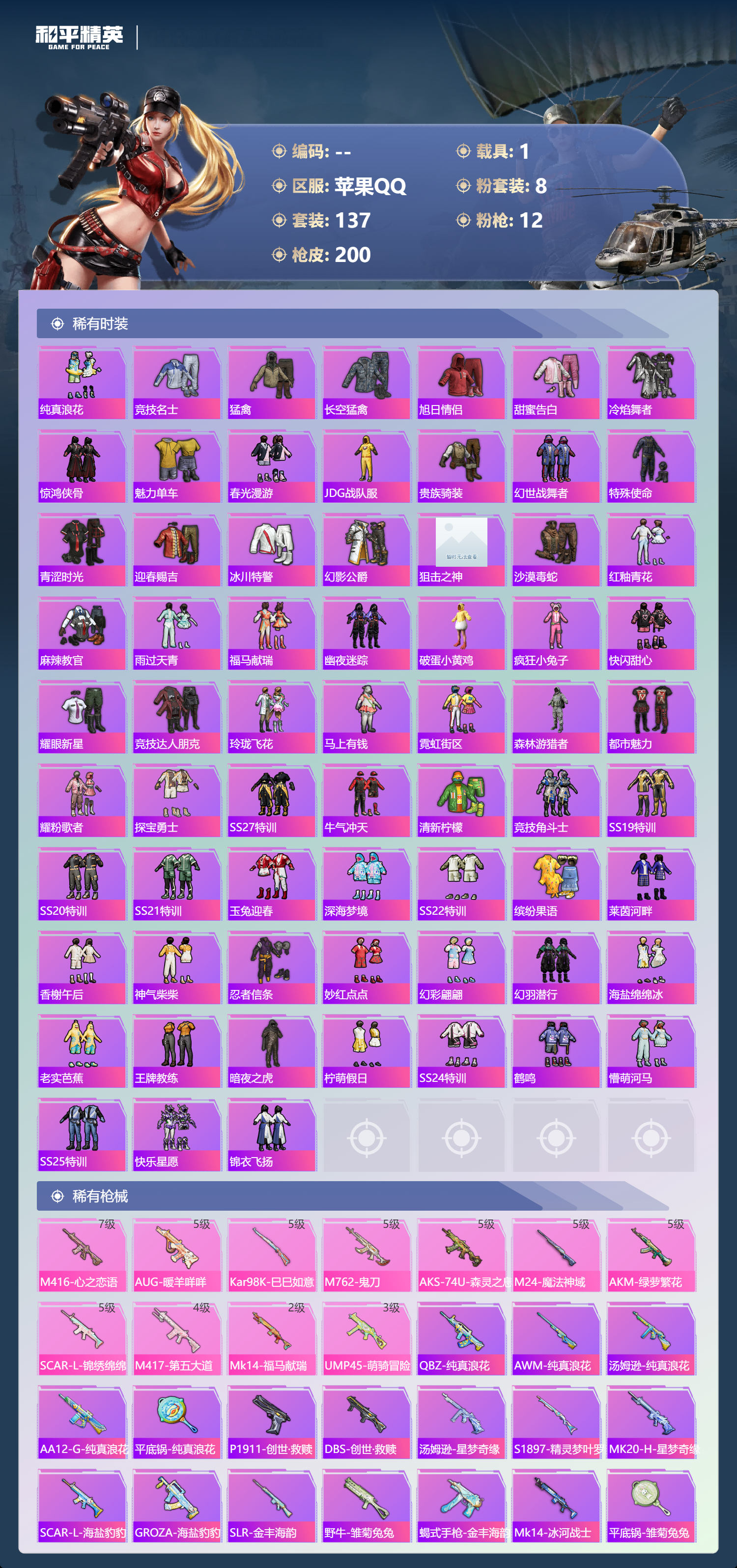 hs63034 苹果手Q-10王牌印记-8粉装-12特效枪-1载具-60482热力值-137套装-200枪皮-2卓越印记