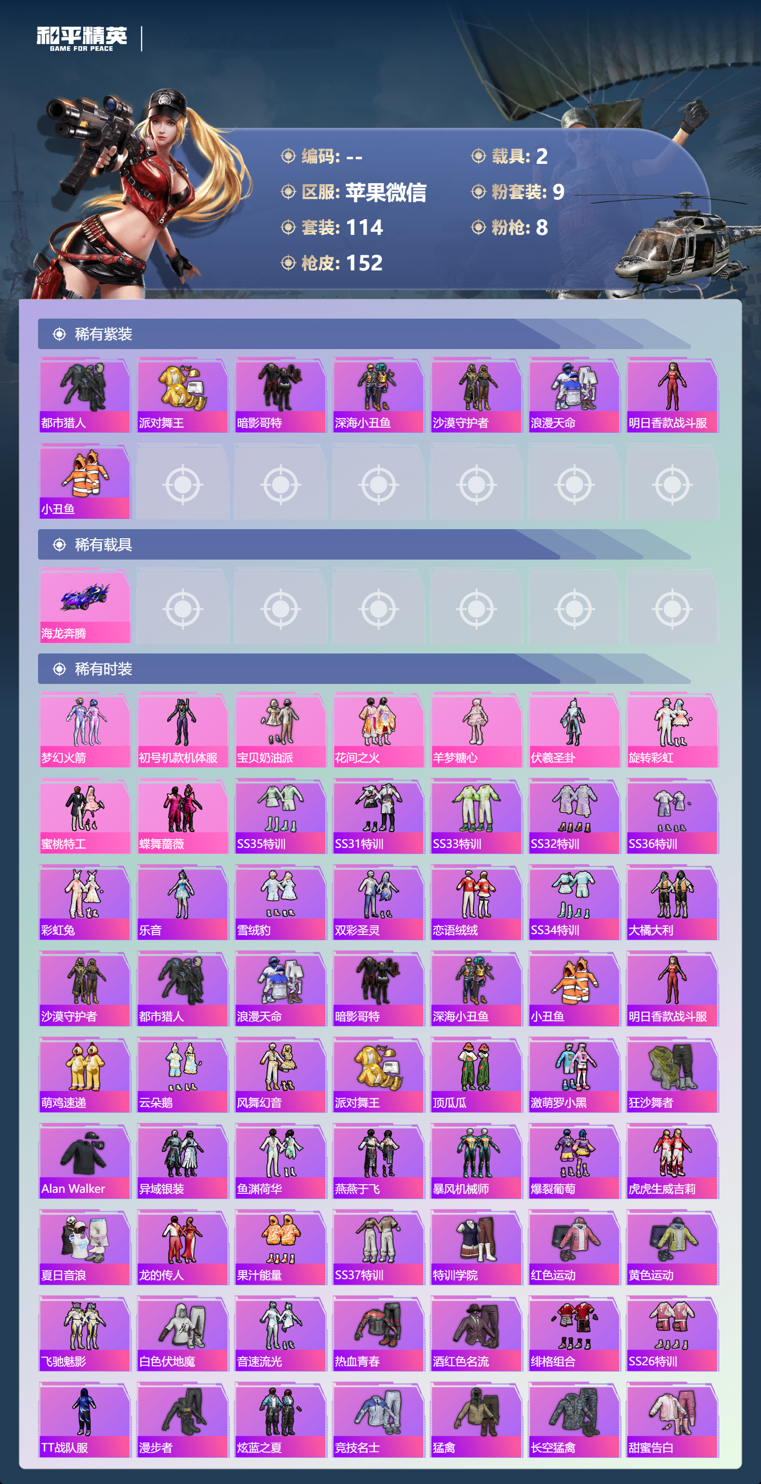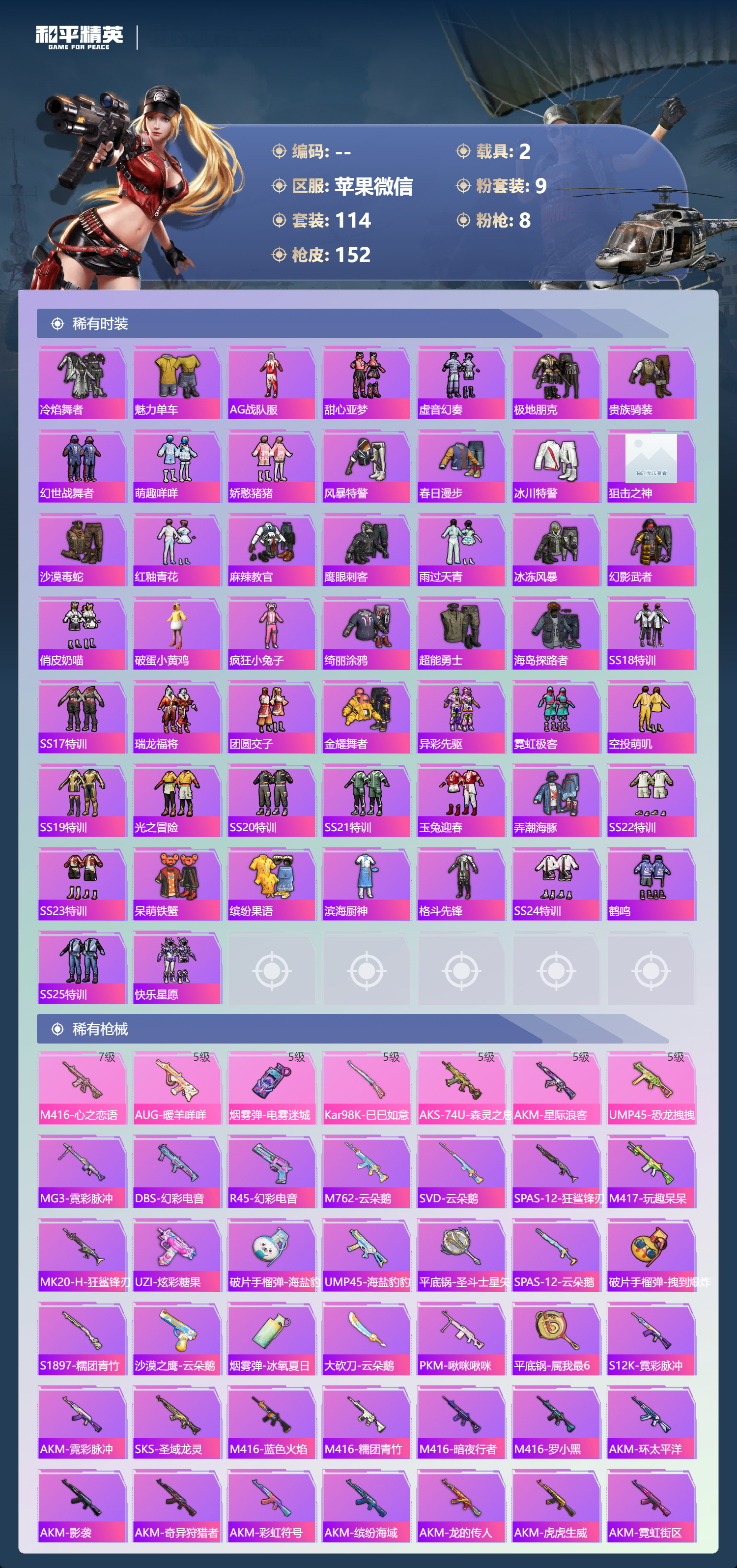 hs63284 苹果微信-9王牌印记-9粉装-8特效枪-2载具-50520热力值-114套装-152枪皮-3卓越印记-1传奇印记