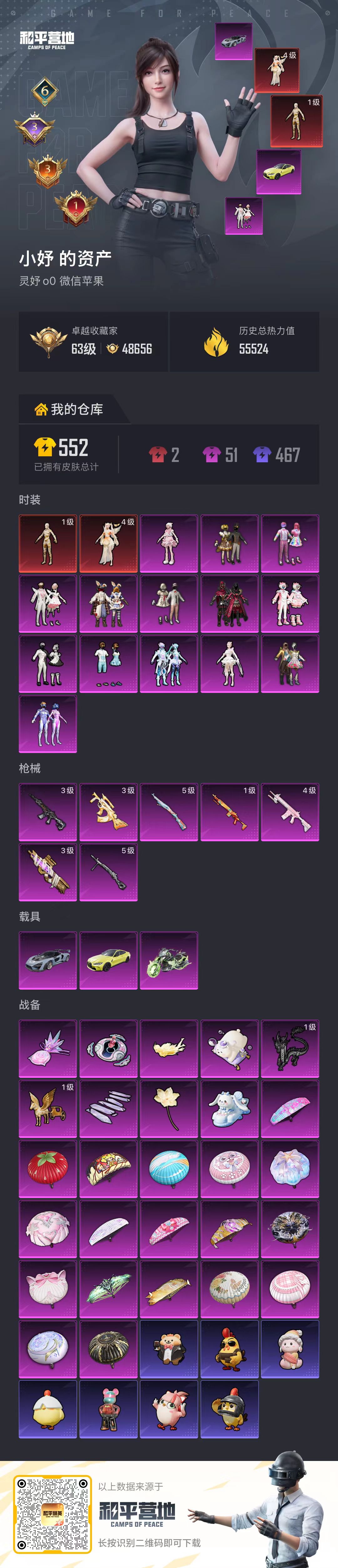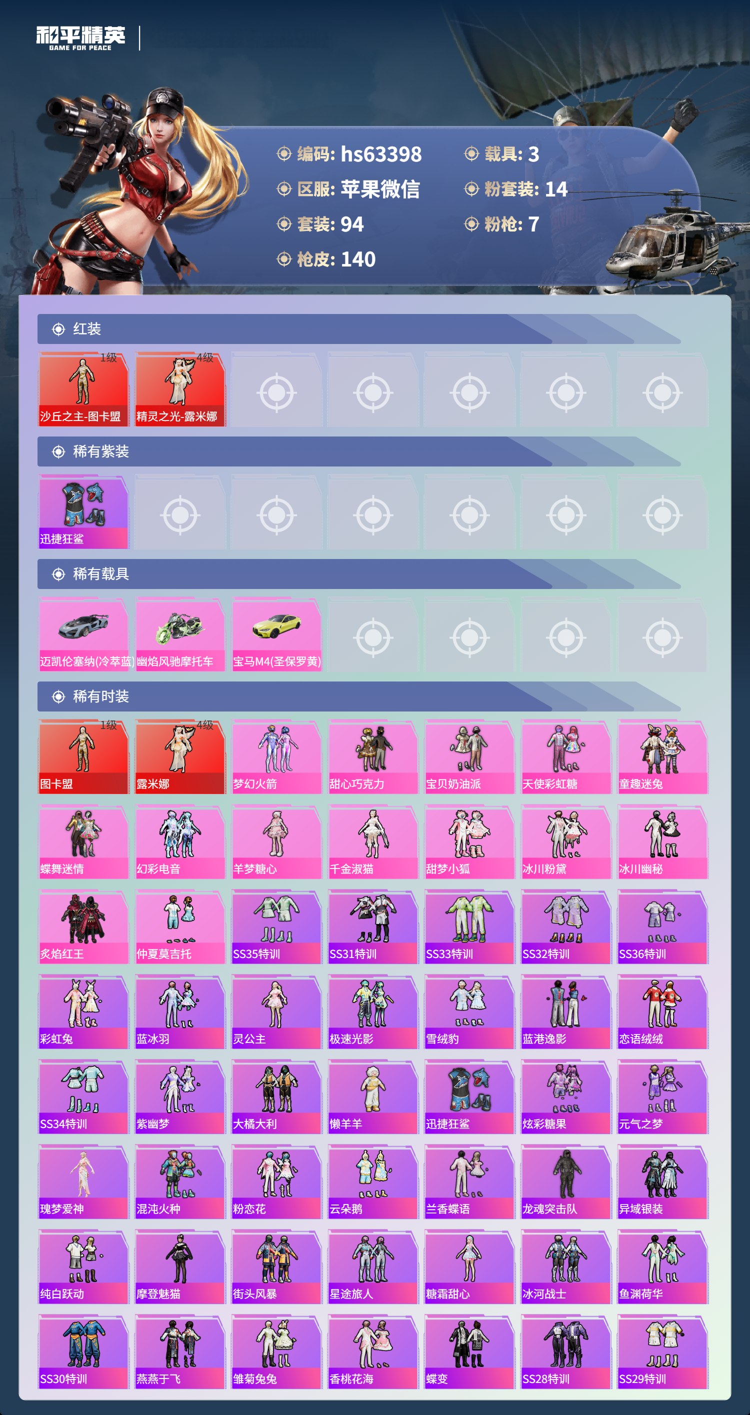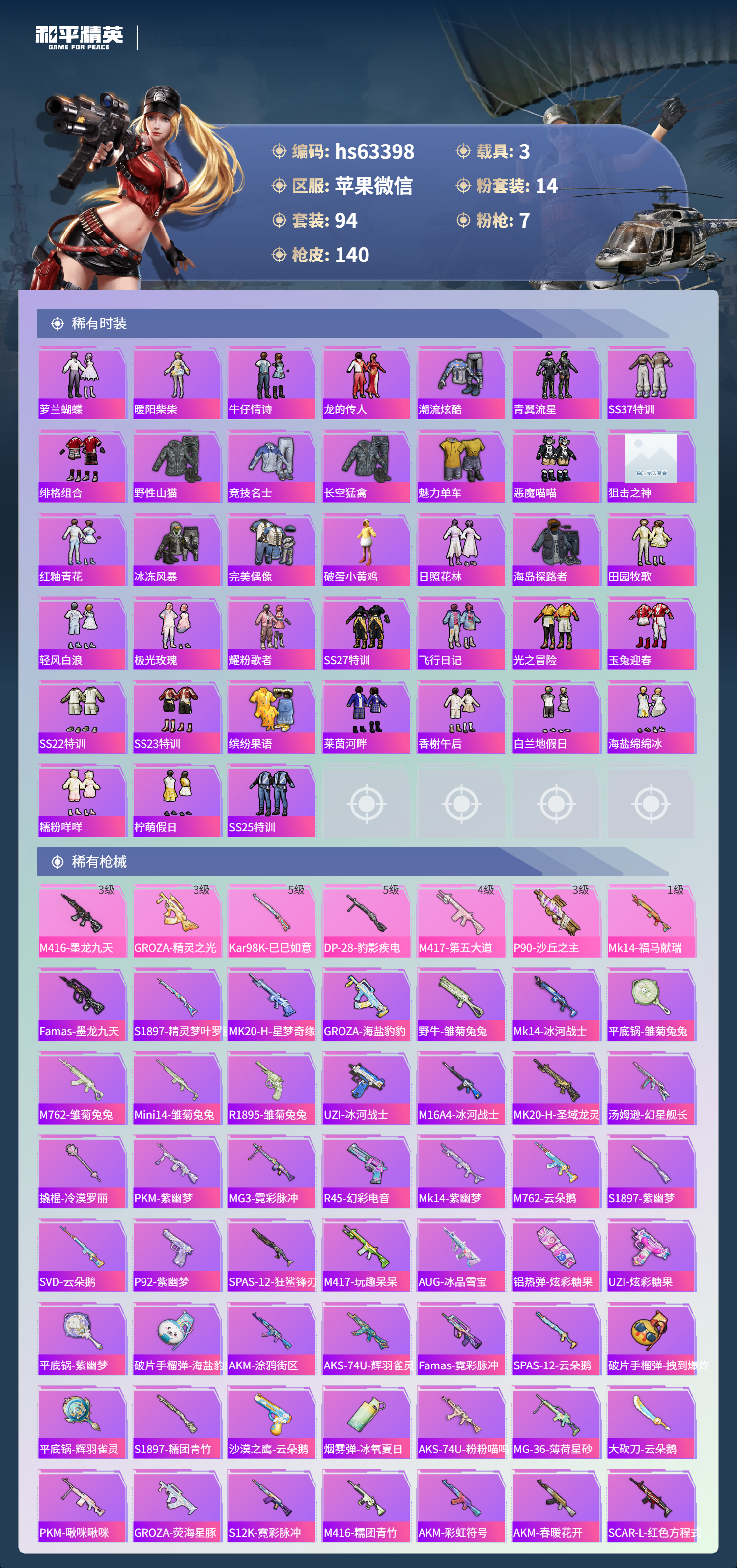 hs63398 苹果微信-6王牌印记-2红装-14粉装-7特效枪-3载具-55584热力值-94套装-140枪皮-3卓越印记-3传奇印记